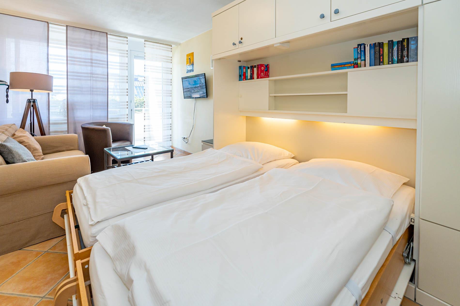 Der Wohn-/Schlafraum besteht aus einer gemütlichen Couch, einem Sessel, einem separaten komfortablen Essplatz, Doppelschrankbett (Betten sind einzeln ausklappbar), Kabel-Flachbild-TV, Radio/CD.