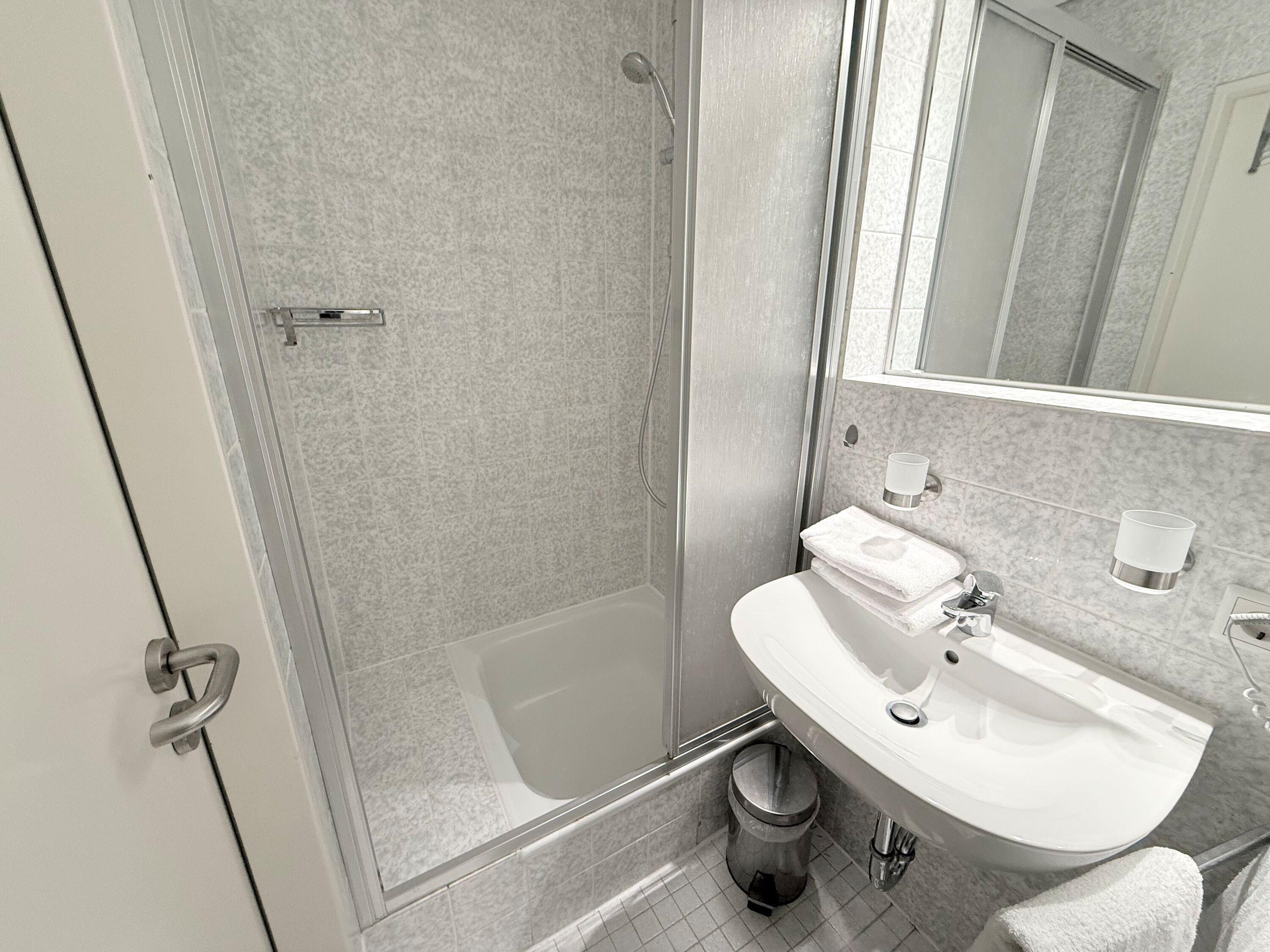 Im Bad befinden sich eine Dusche, ein WC und ein Waschtisch.