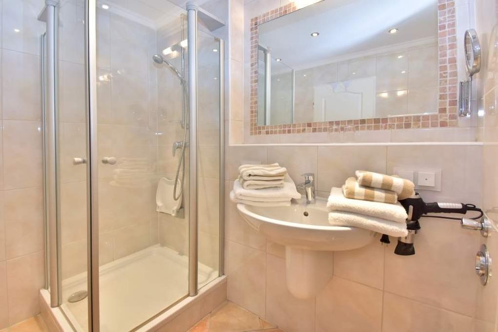 Im Badezimmer befinden sich eine Dusche mit extraflachem Einstieg und Duschsitz (klappbar), Waschtisch, Handtuchtrockner, Kosmetikspiegel, Fön und WC.