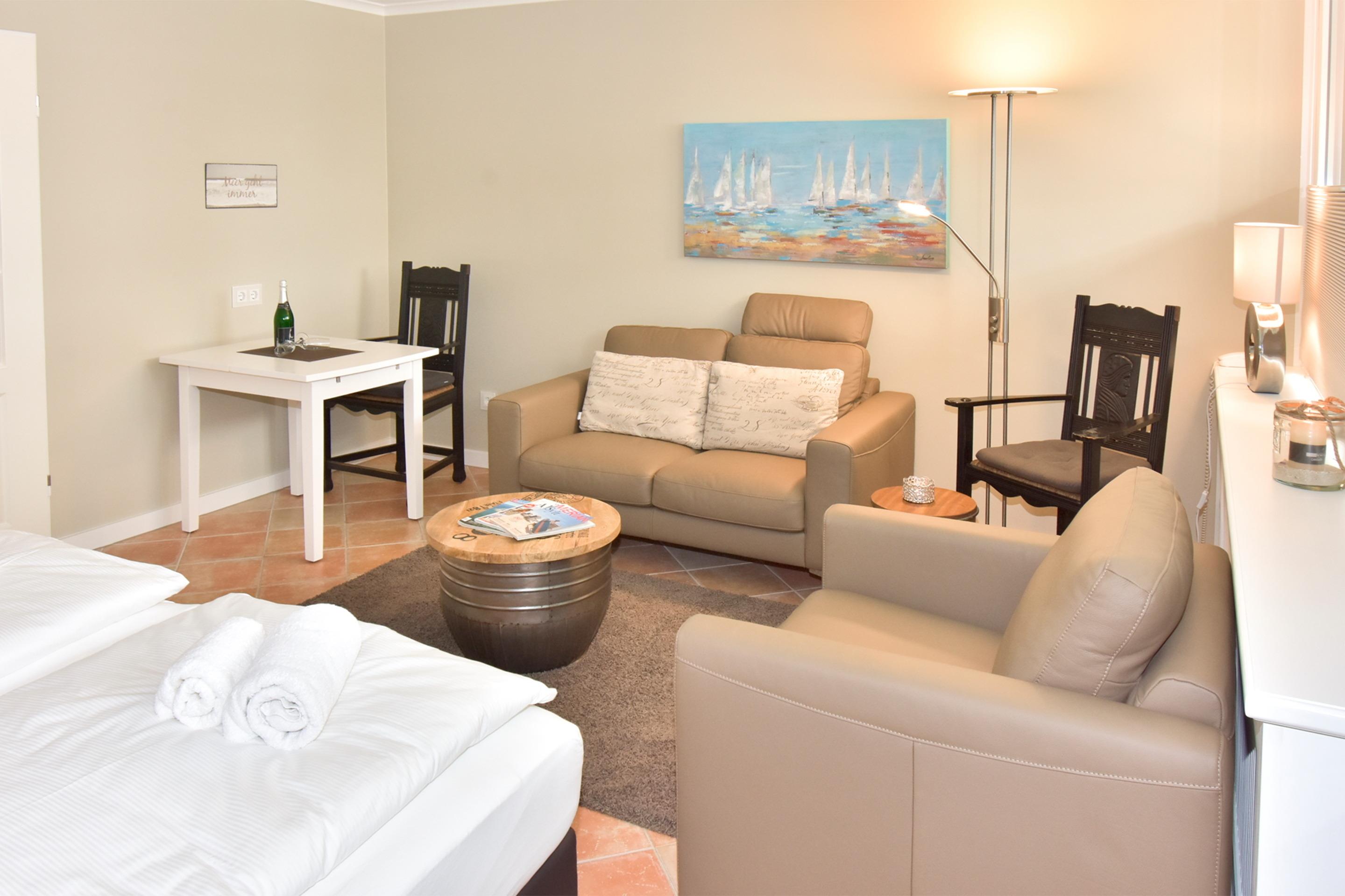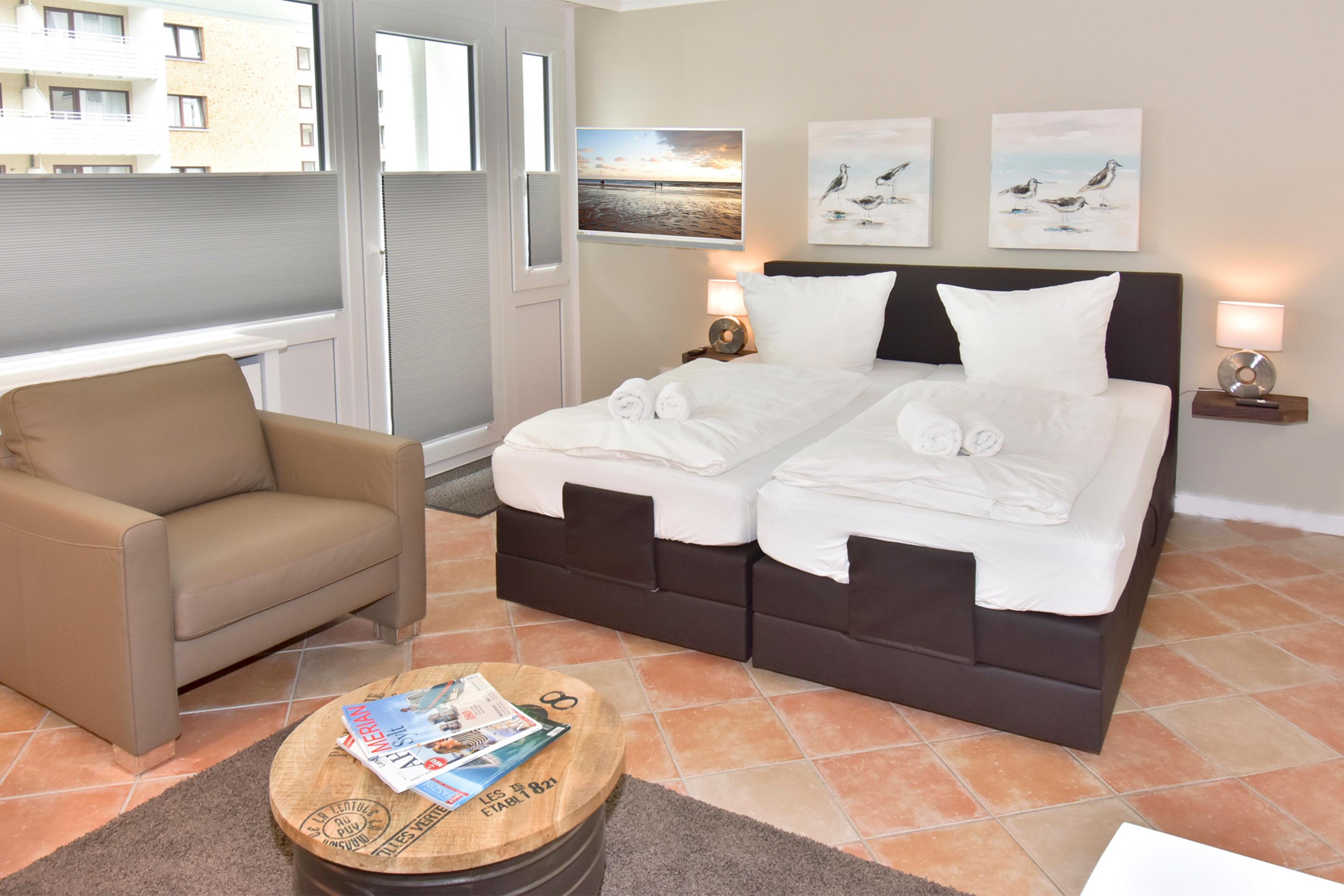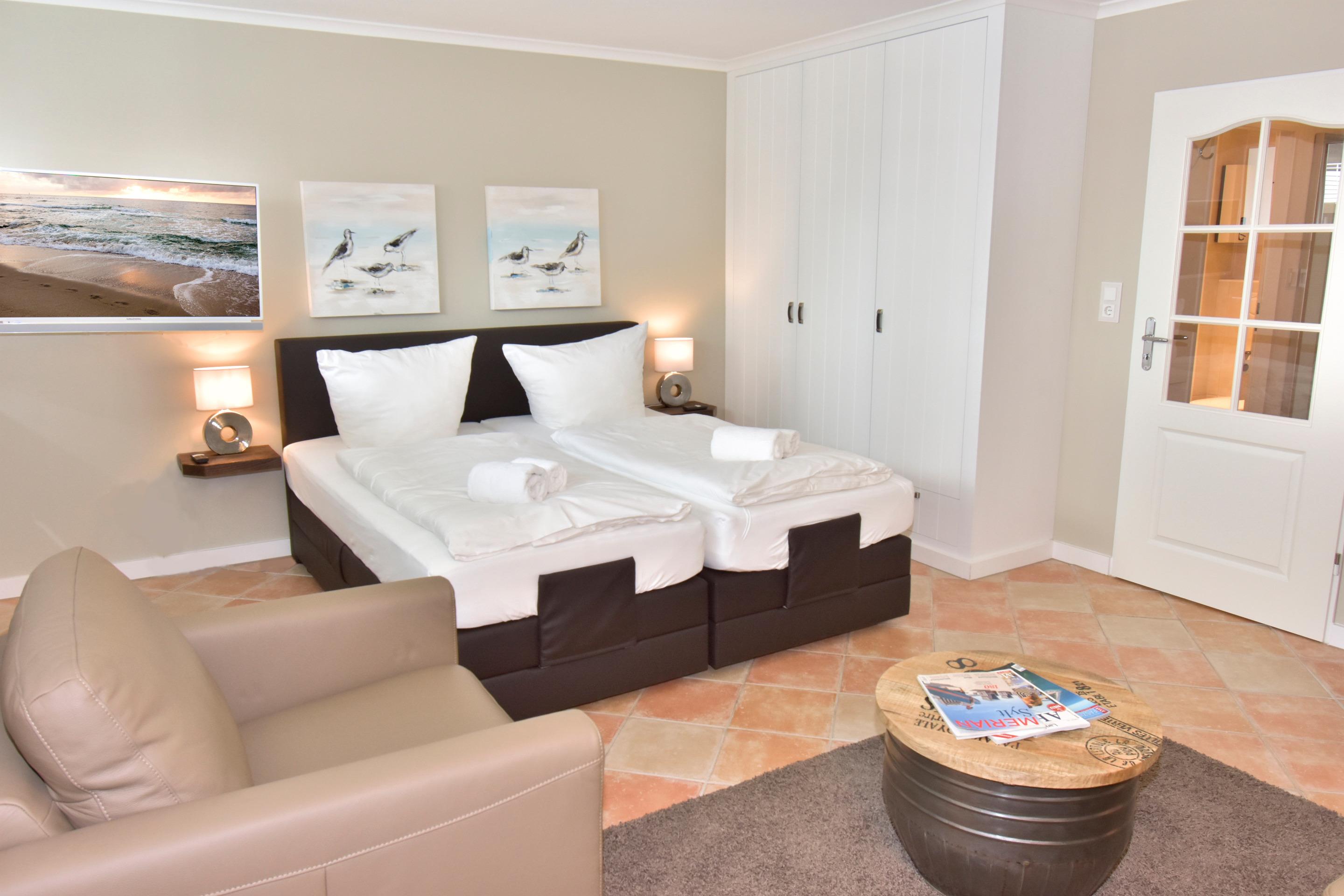 Der Wohn-/Schlafraum besteht aus einer gemütlichen Sitzgarnitur (Zweisitzer und ein Sessel), einem neuen Boxspringbett (1,80 x 2,00m, sehr gute Einzelmatratzen) mit elektrisch verstellbarem Kopf- und Fußteil, einem gemütlichen Essplatz, extragroßem Flachbild-TV (48-Zoll-Bildschirmdiagonale, Kabelempfang), Radio.