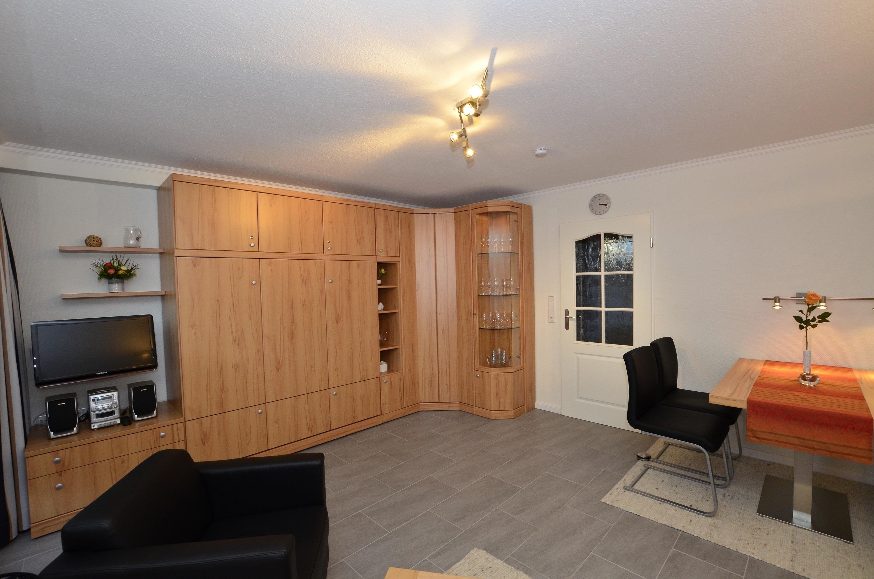 Der Wohn-/Schlafraum besteht aus einer gemütlichen Sitzgarnitur (2-Sitzer-Couch und ein Sessel), einem Essplatz, Doppelschrankbetten, einem Kabel-Flachbild-TV, Radio/CD.