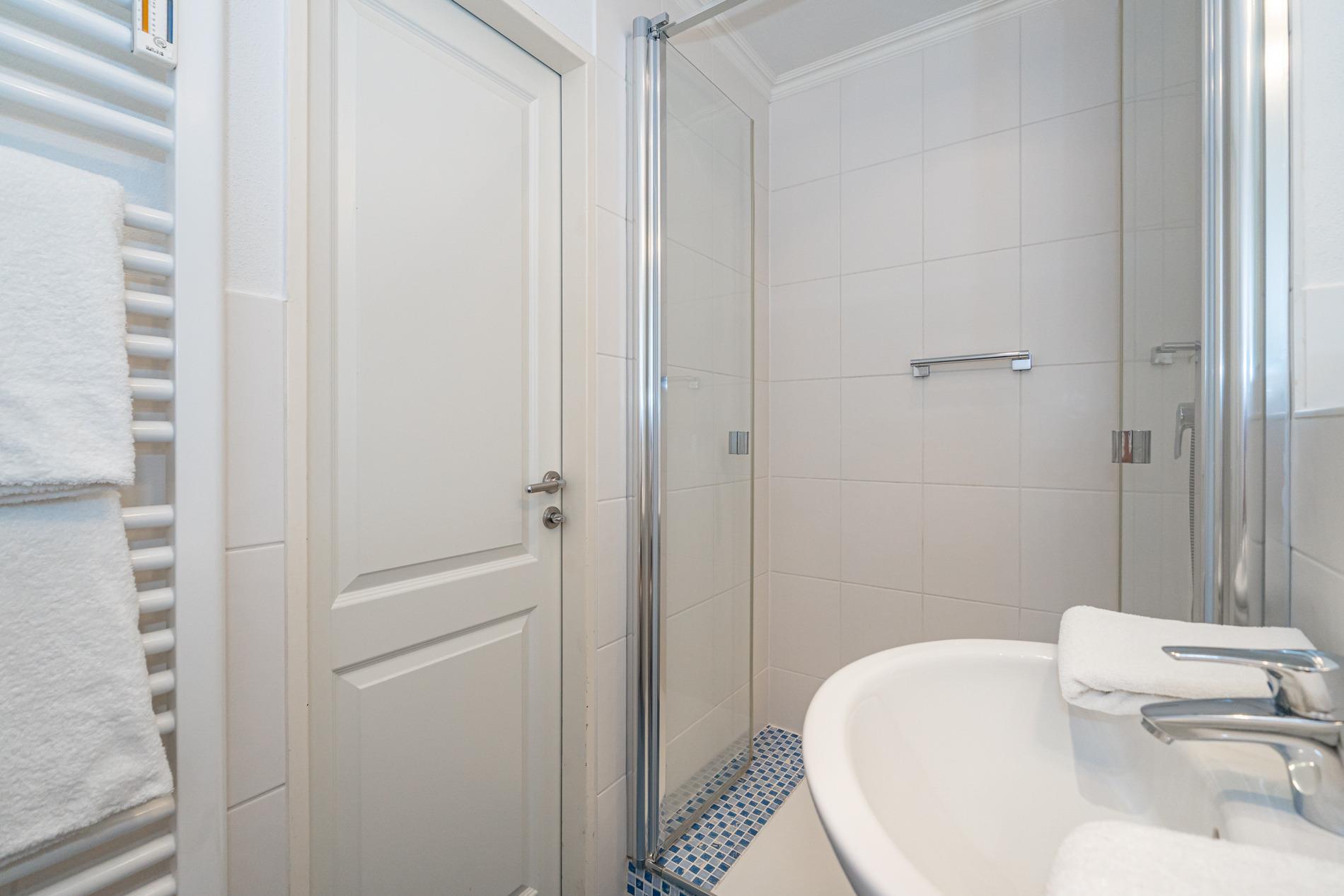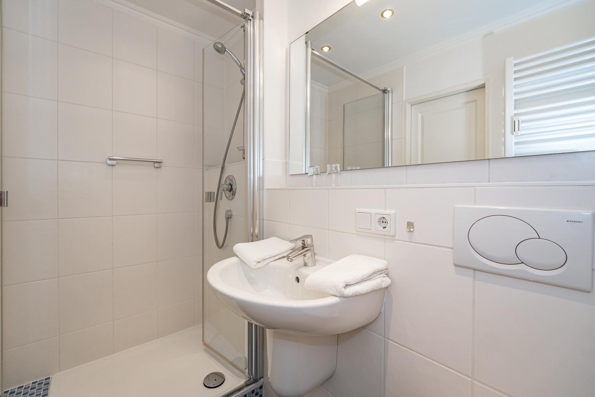 Im Bad befinden sich eine Dusche, ein WC, ein Waschtisch und ein Handtuchtrockner.