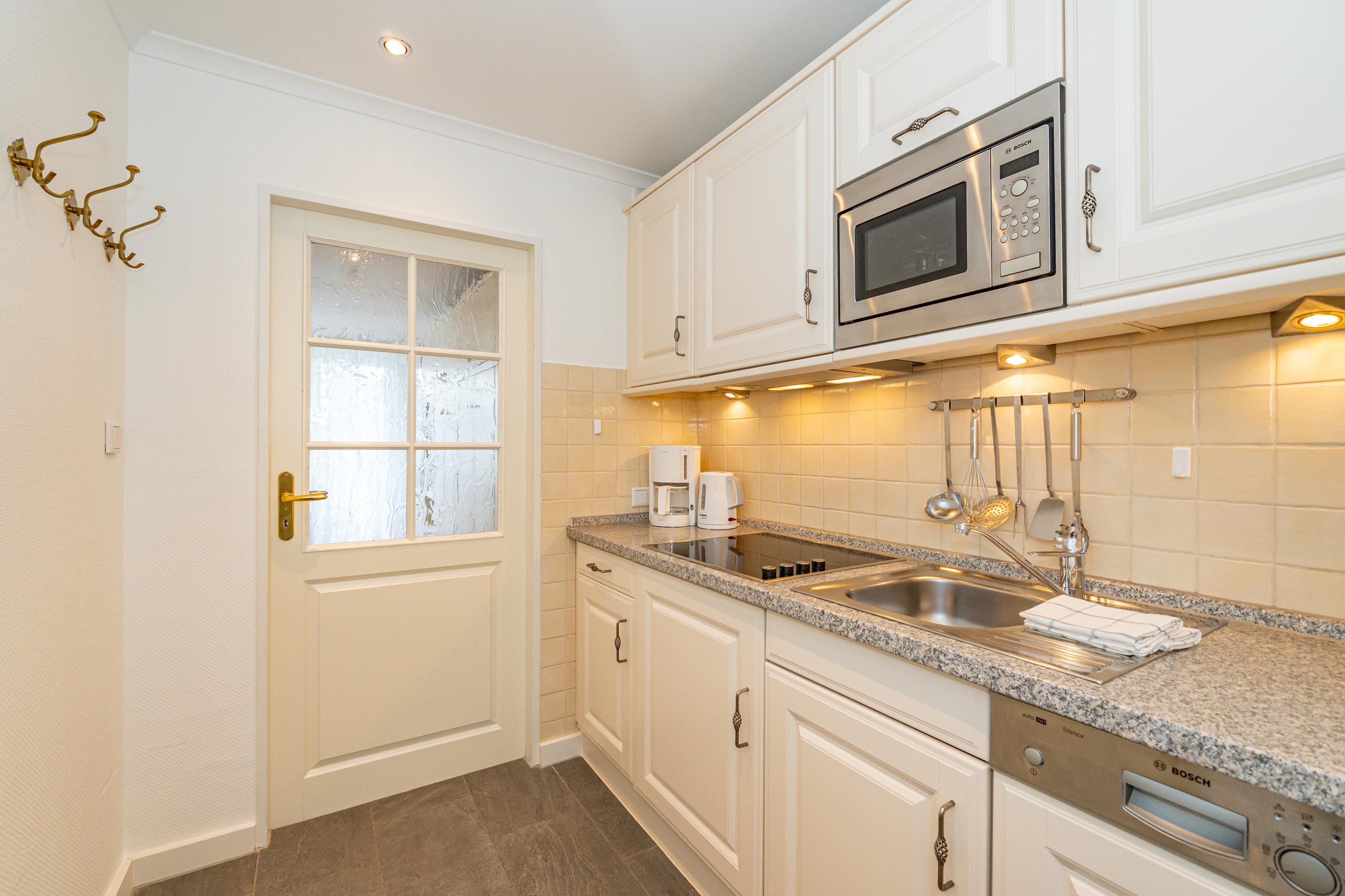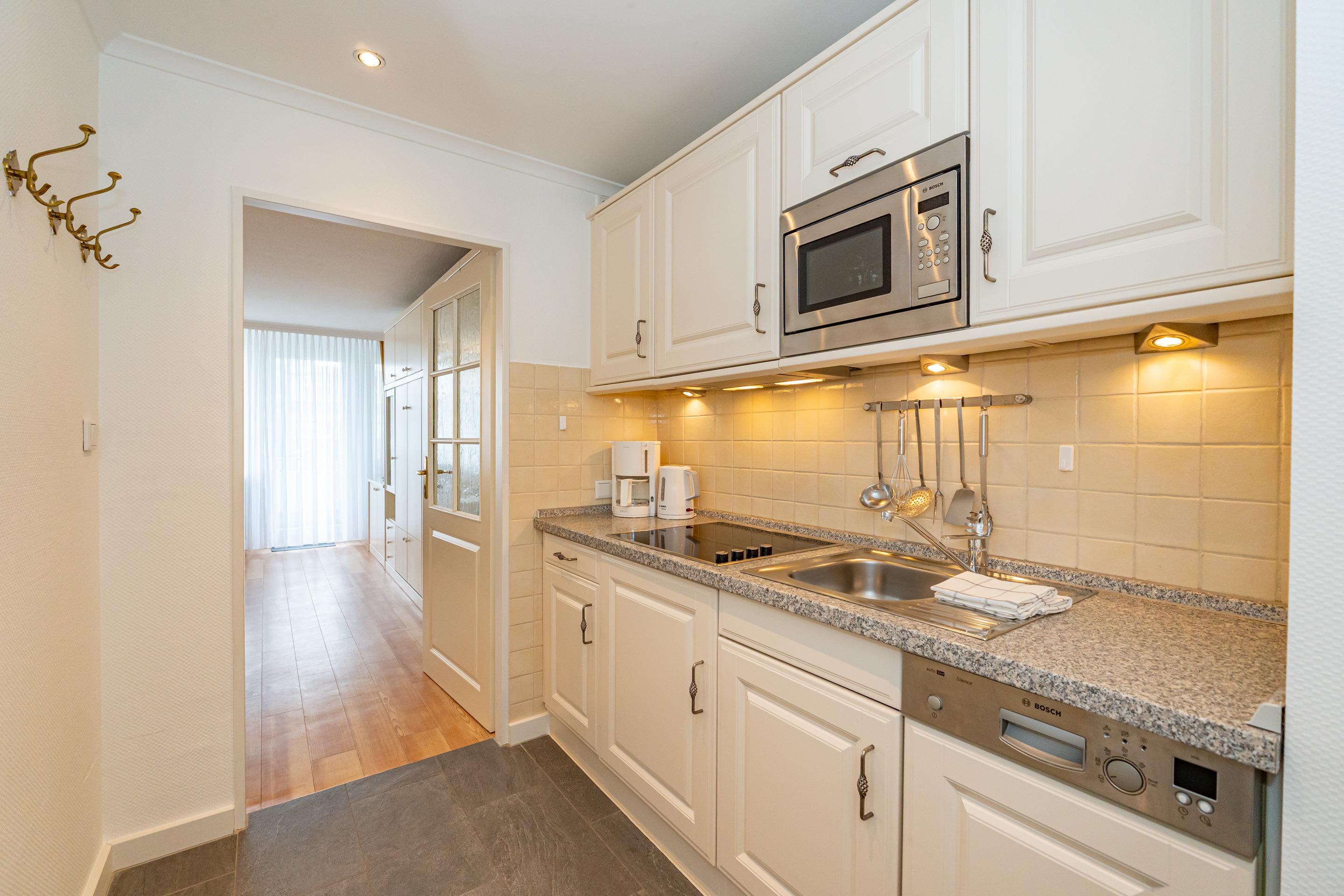 Die neue Küchenzeile hat einen Geschirrspüler, eine Mikrowelle und ein Ceranfeld mit 4 Kochstellen. Kaffeemaschine, Wasserkocher und Toaster gehören zur Grundausstattung.