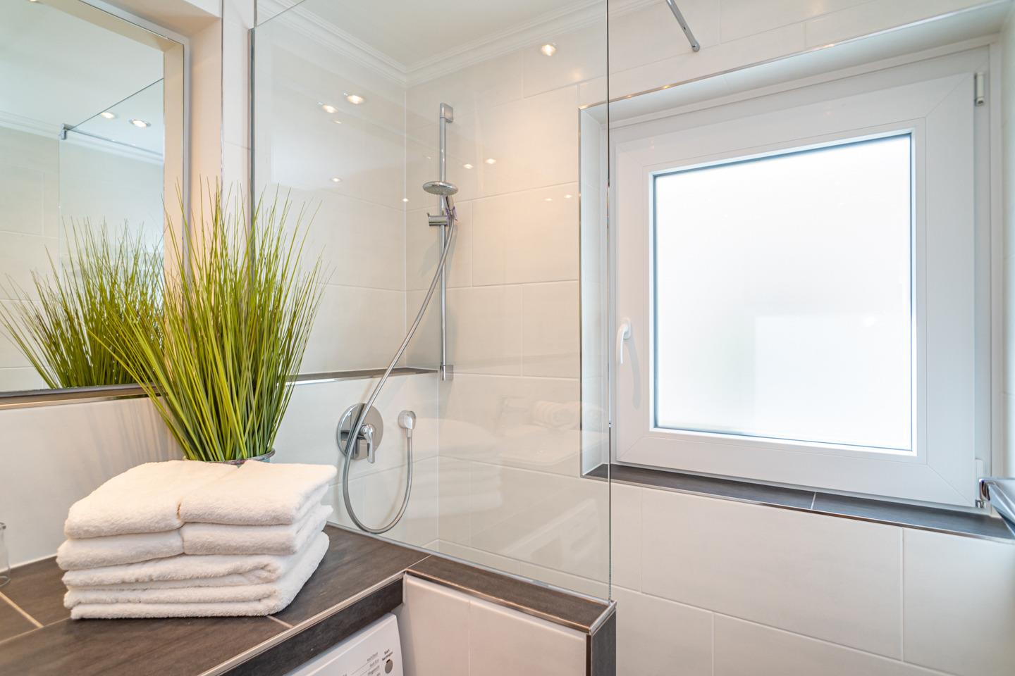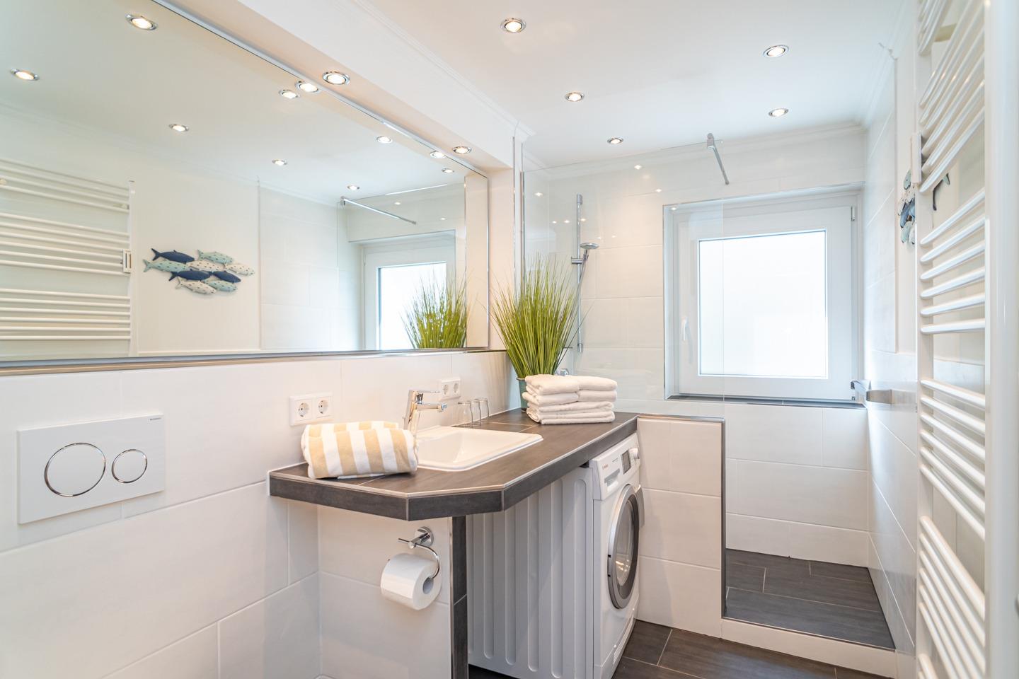Das großzügige Duschbad/WC hat ein Fenster, einen Waschtisch, einen Handtuchtrockner, ein Fön und ein Waschmaschinen/Trockner-Kombigerät.