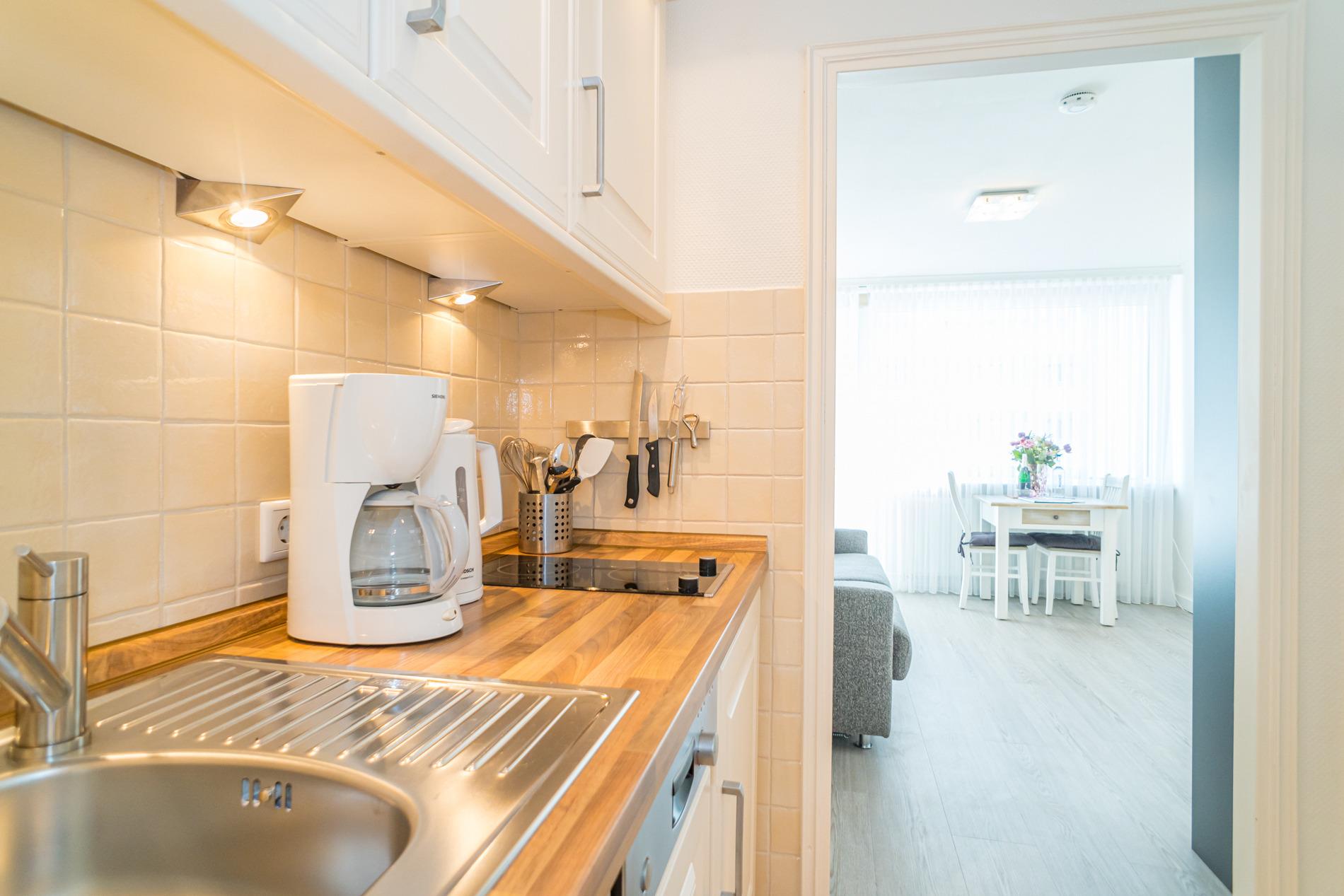 Die moderne, neue Küchenzeile hat einen Geschirrspüler, ein Cerankochfeld, eine Delonghi Nespresso Kapselmaschine und einen Kühlschrank mit 3*-Gefrierfach. Kaffeemaschine, Wasserkocher und Toaster gehören zur Grundausstattung.