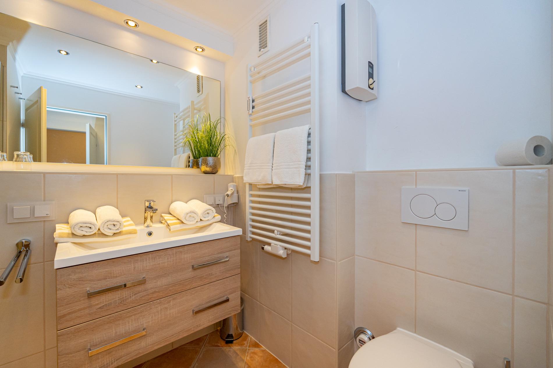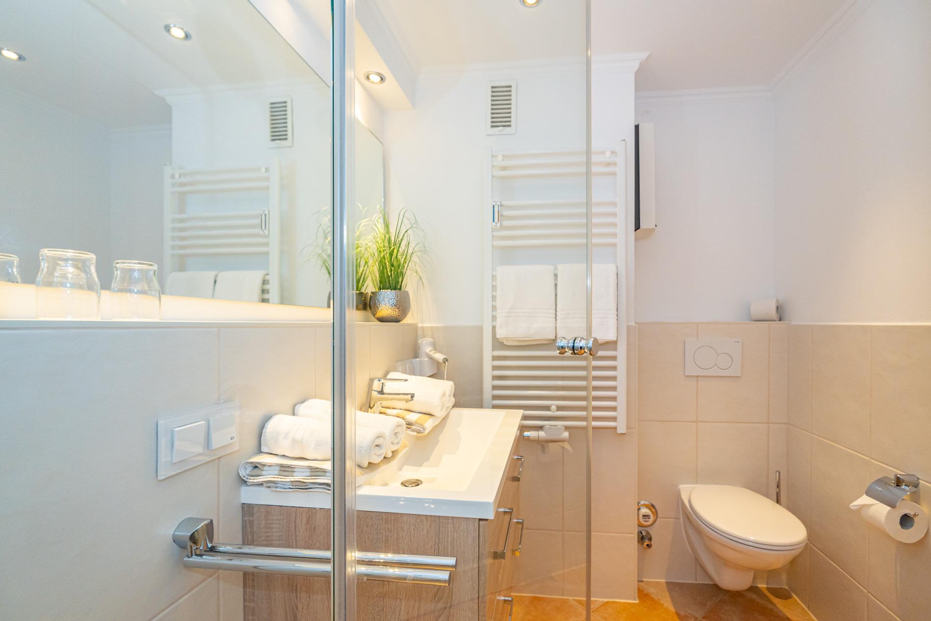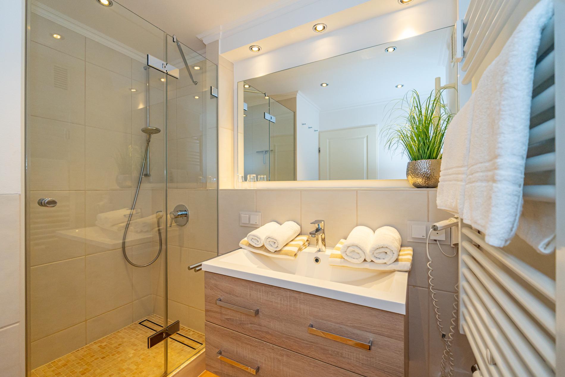 Das neue, helle Badezimmer ist mit einer Dusche mit extraflachem Einstieg, einem Waschtisch, ein WC und einem festinstallierten Fön ausgestattet.