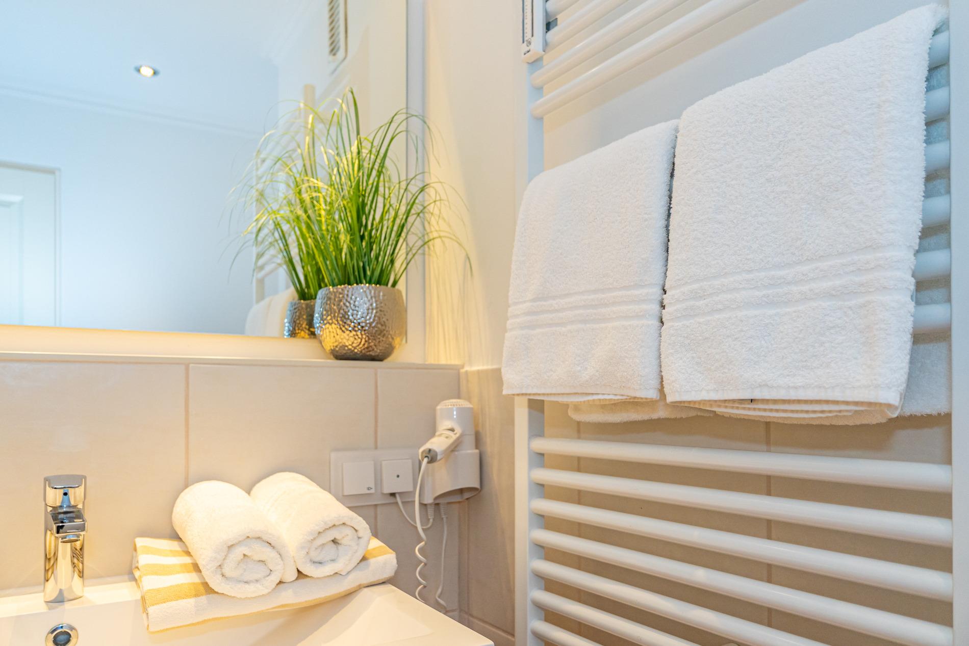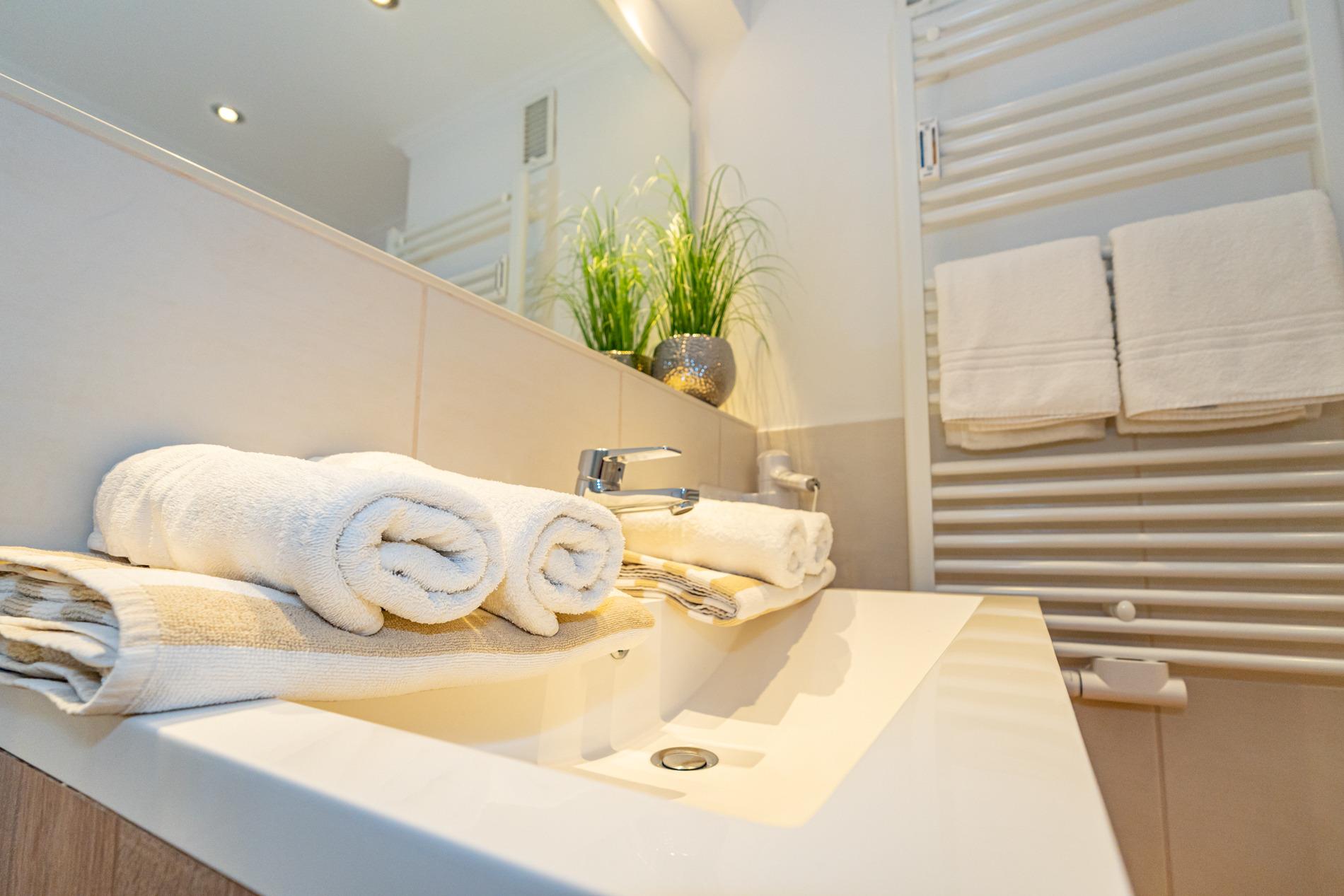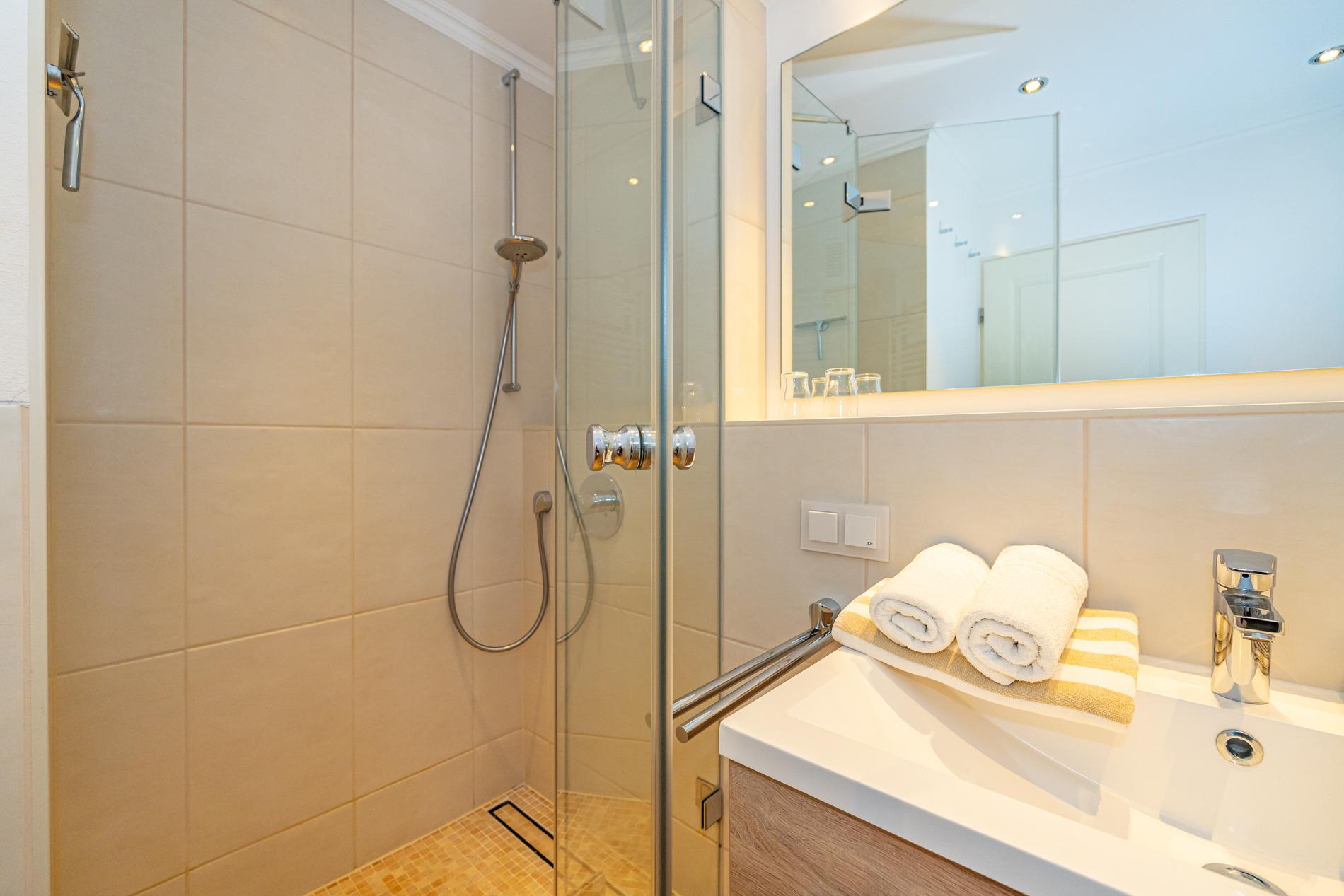 Das neue, helle Badezimmer ist mit einer Dusche mit extraflachem Einstieg, einem Waschtisch, ein WC und einem festinstallierten Fön ausgestattet.