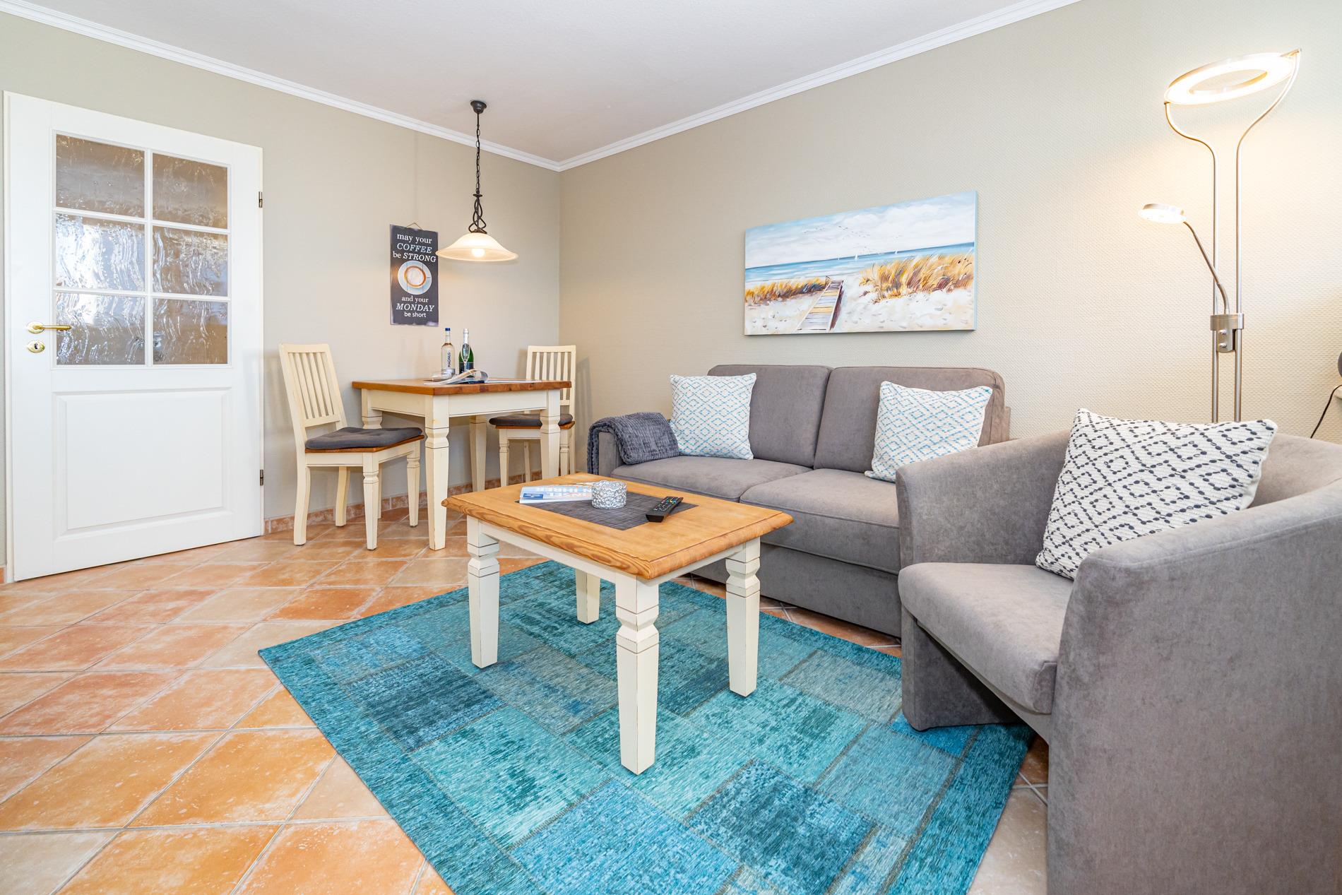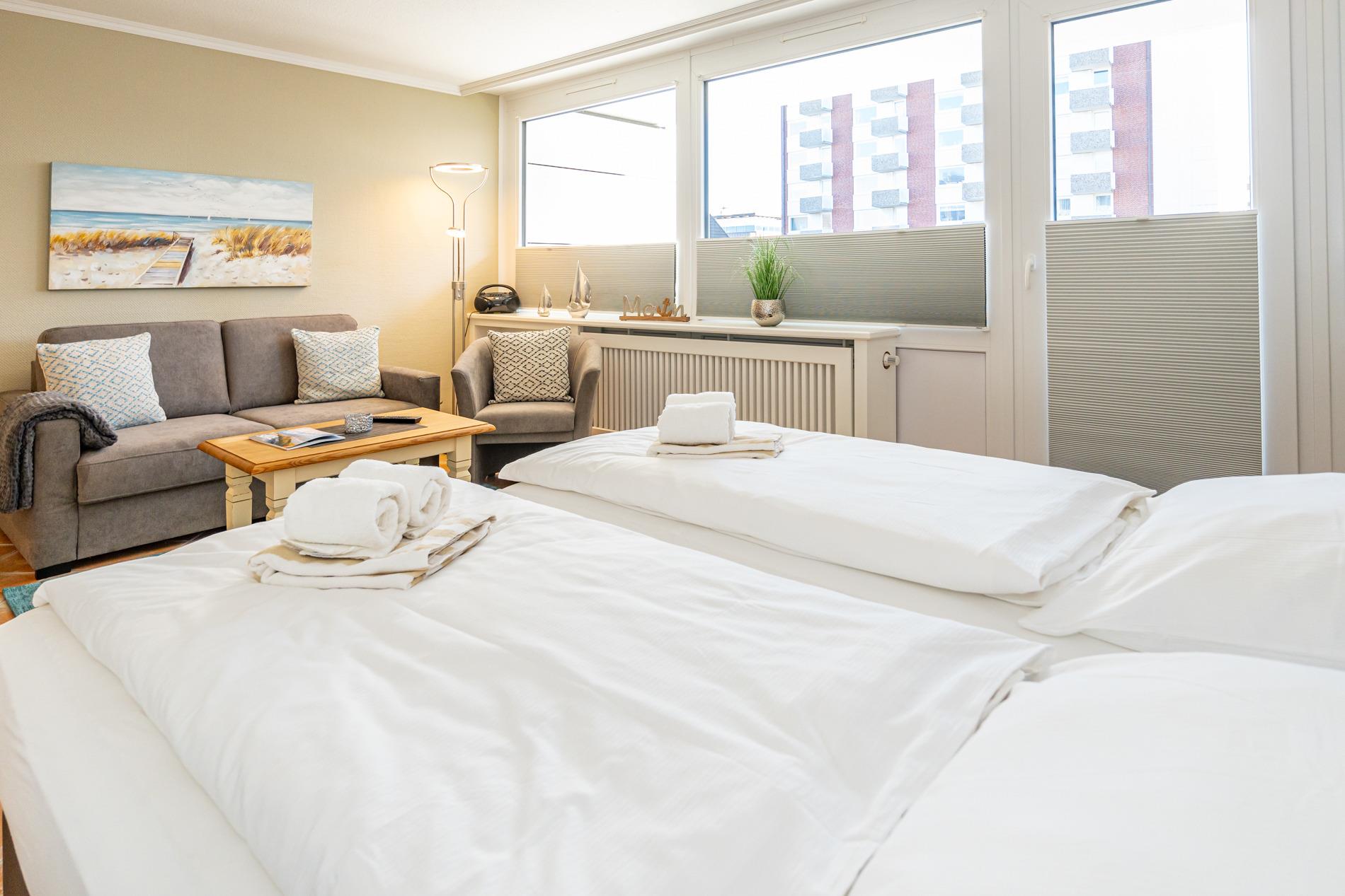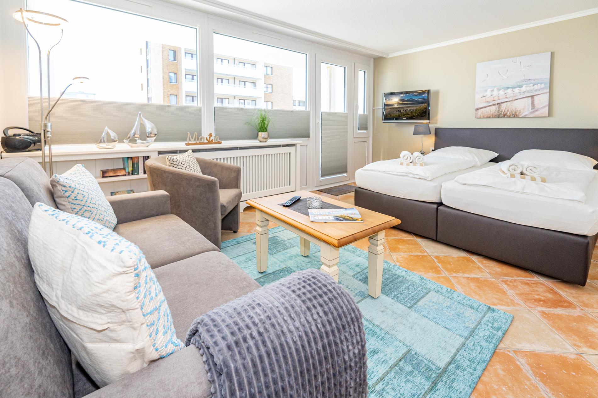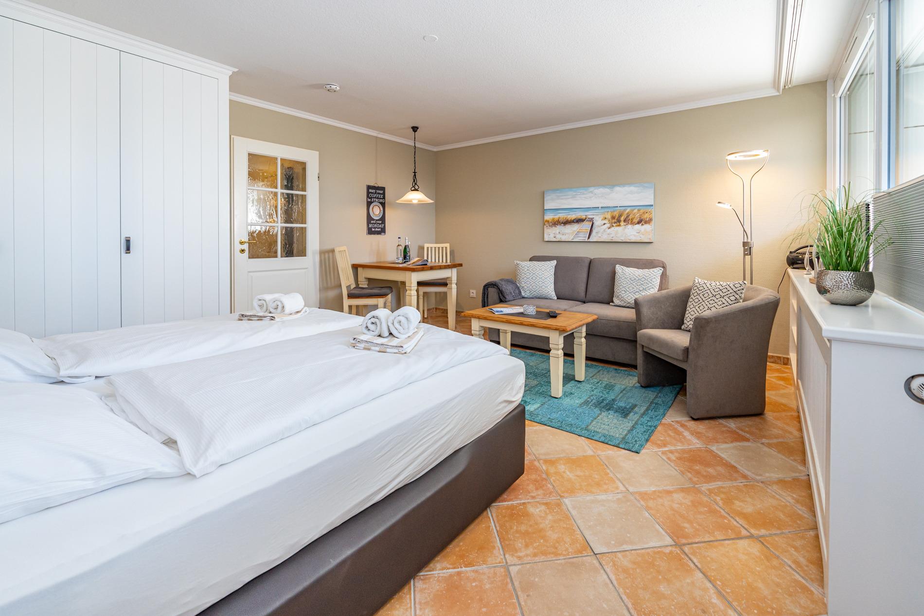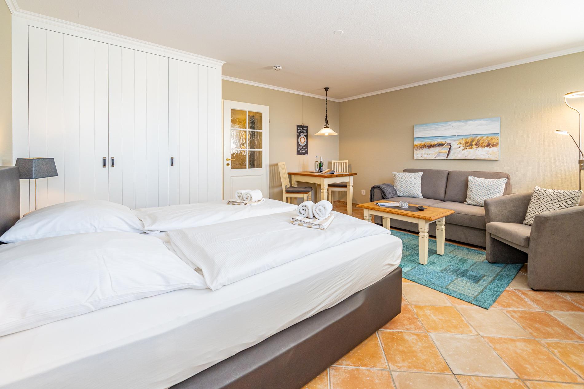 Der Wohn-/Schlafraum besteht aus einer gemütlichen Sitzgarnitur (Zweisitzer und einem Sessel mit Fußhocker), einem neues Boxspringbett (zwei Einzelmatratzen), einem Essplatz, Kabel-Flachbild-TV, Radio.