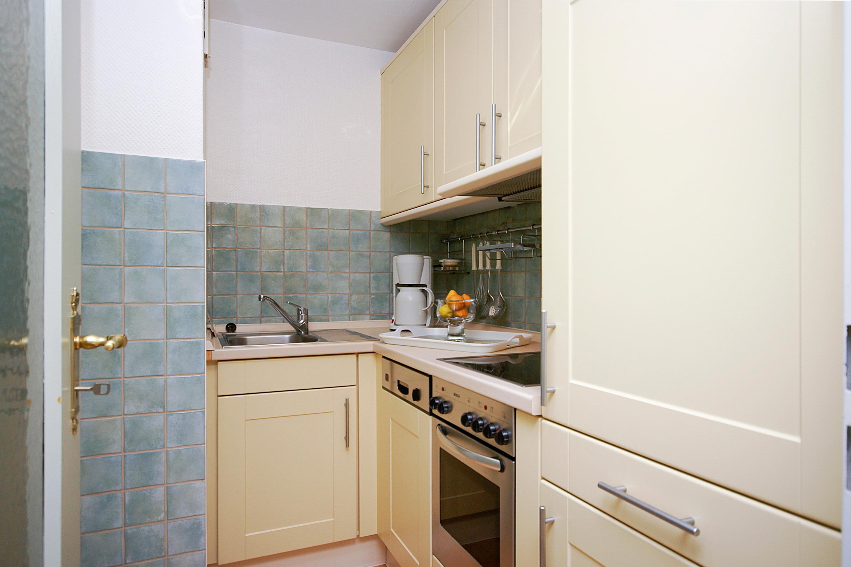 Der Wohnbereich ist mit einer besonders hochwertigen Leder-Sitzgarnitur der Bielefelder Werkstätten eingerichtet – bestehend aus einer 2-Sitzer-Doppelschlafcouch (Liegefläche 1,40 x 2,00m) mit optimaler Liegehöhe und zwei Sesseln – und bietet zusätzlich einen separaten Essplatz, einen Kabel-Flachbild-TV sowie eine HiFi-Anlage. Eine neue, offene Küche rundet das Raumkonzept ab. Sie ist ausgestattet mit einem Geschirrspüler, einem Cerankochfeld mit Backofen und einem Kühlschrank inklusive 3-Sterne-Gefrierfach. Kaffeemaschine, Wasserkocher und Toaster gehören selbstverständlich zur Grundausstattung.