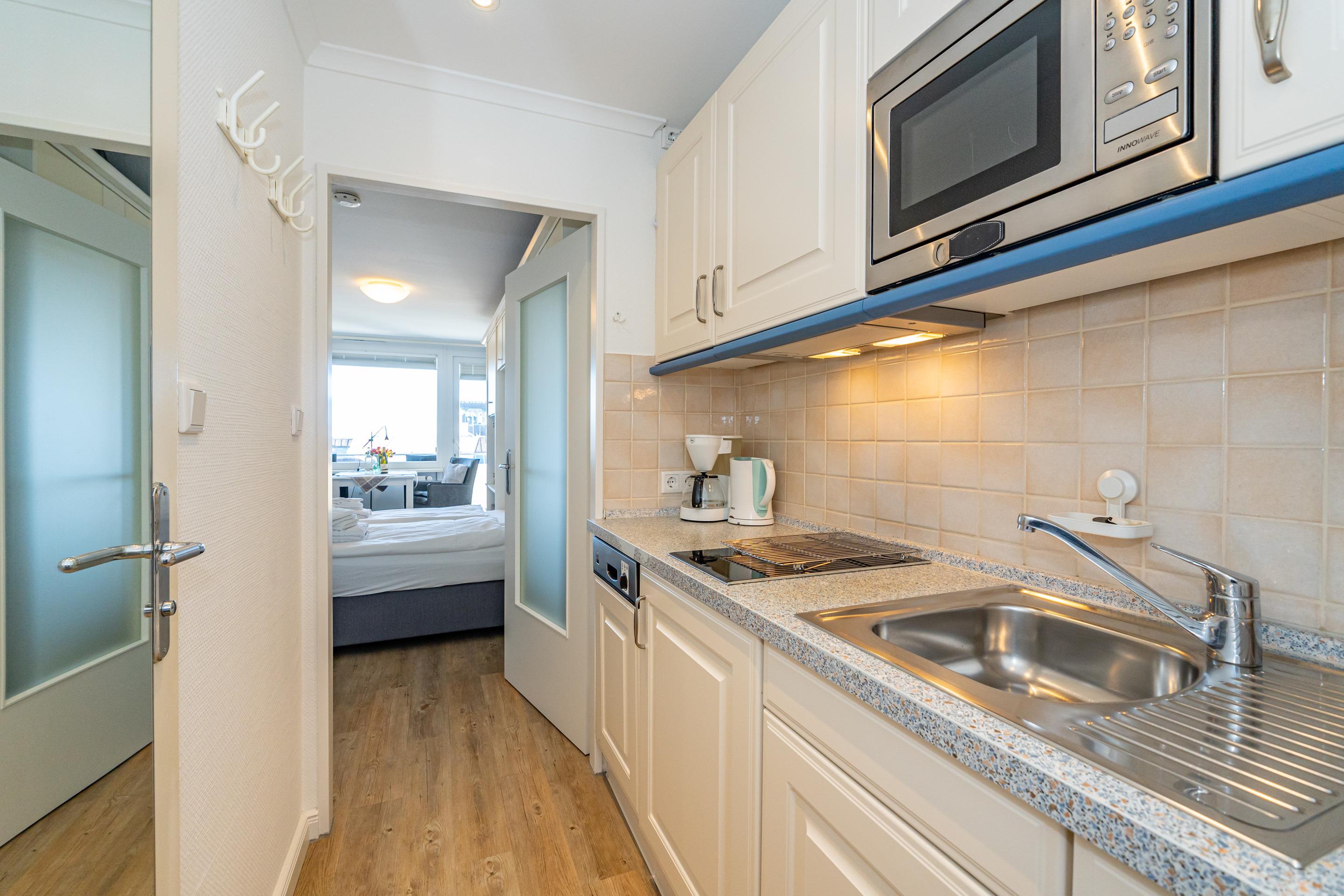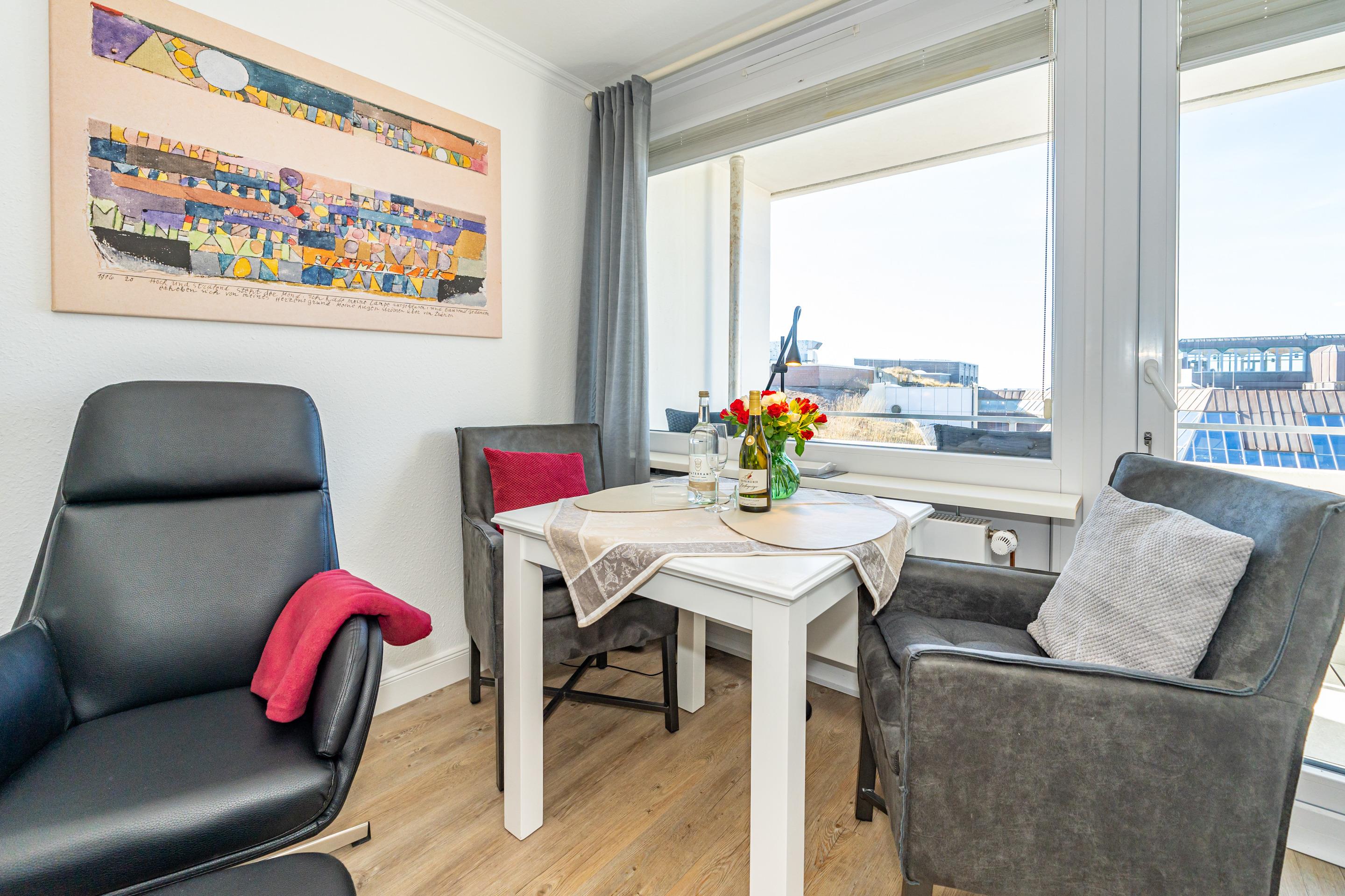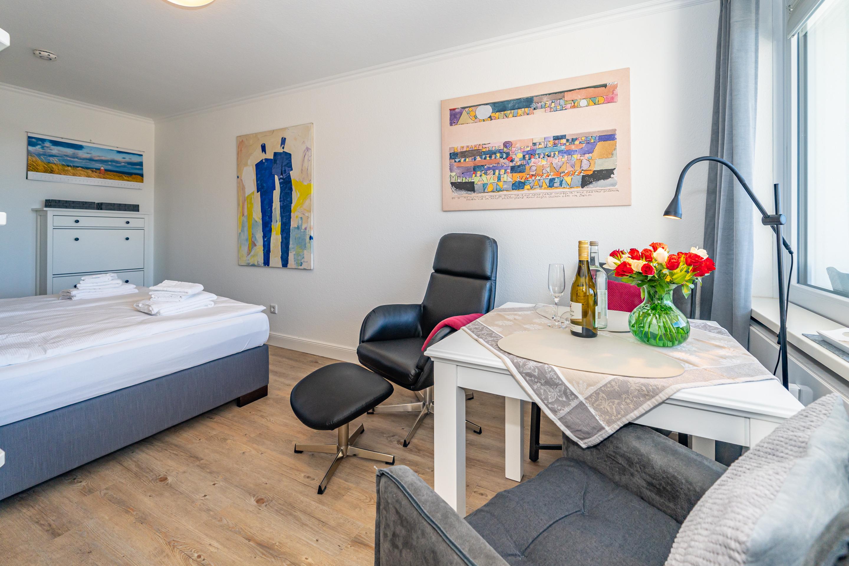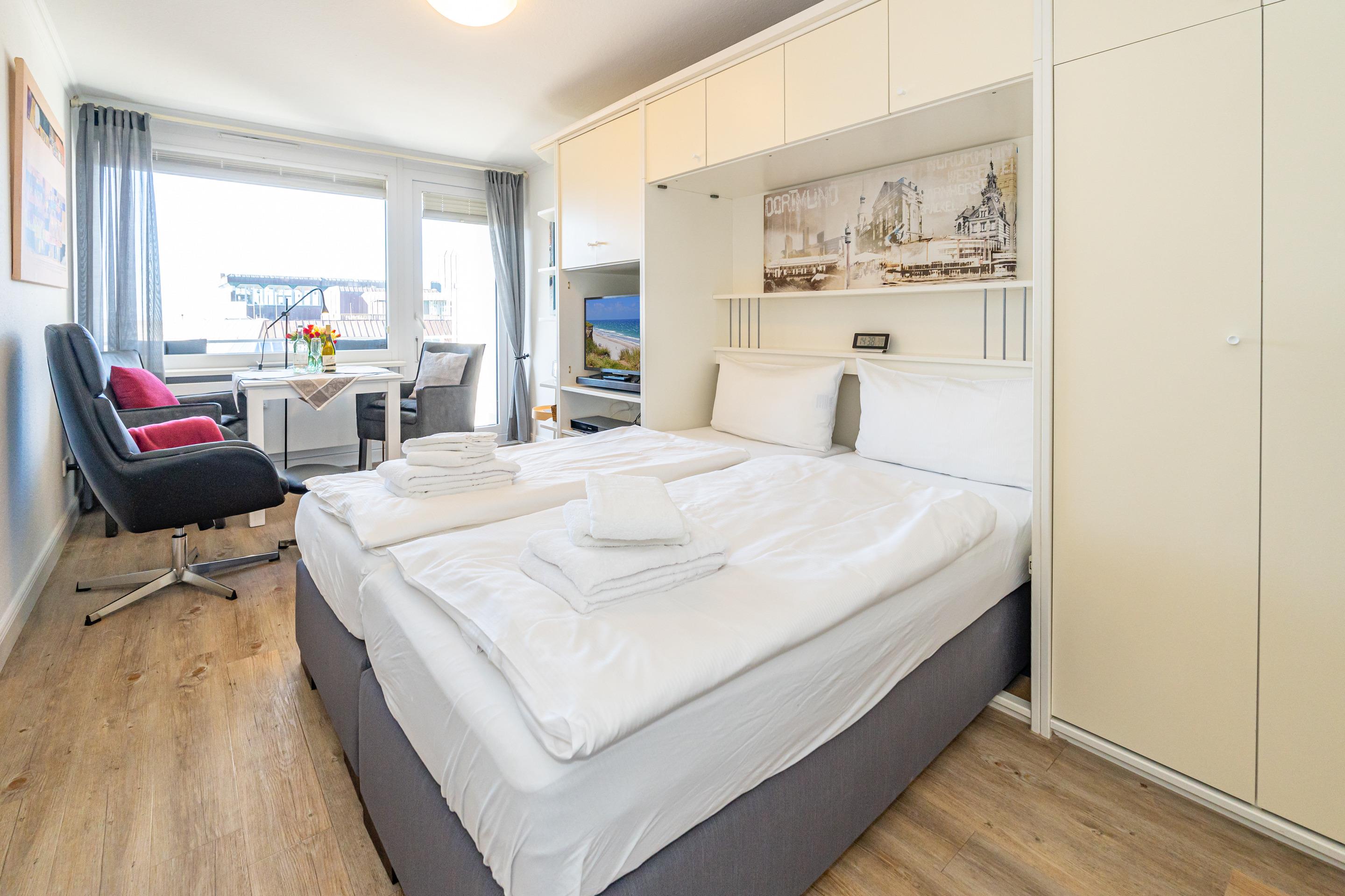 Moderne 1-Zimmer-Ferienwohnung mit Balkon und Meerblick in Westerland, ideal für 2 Personen.