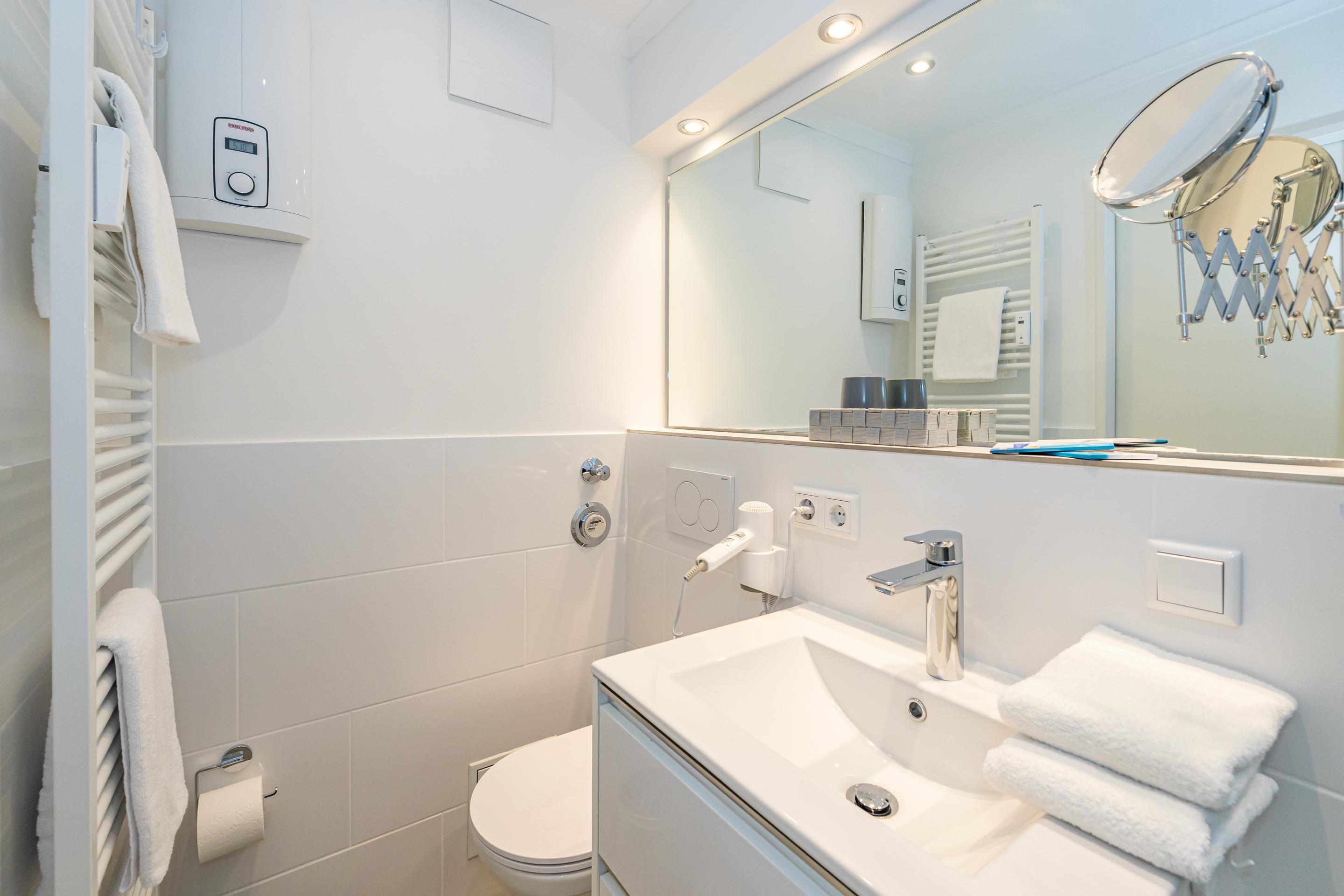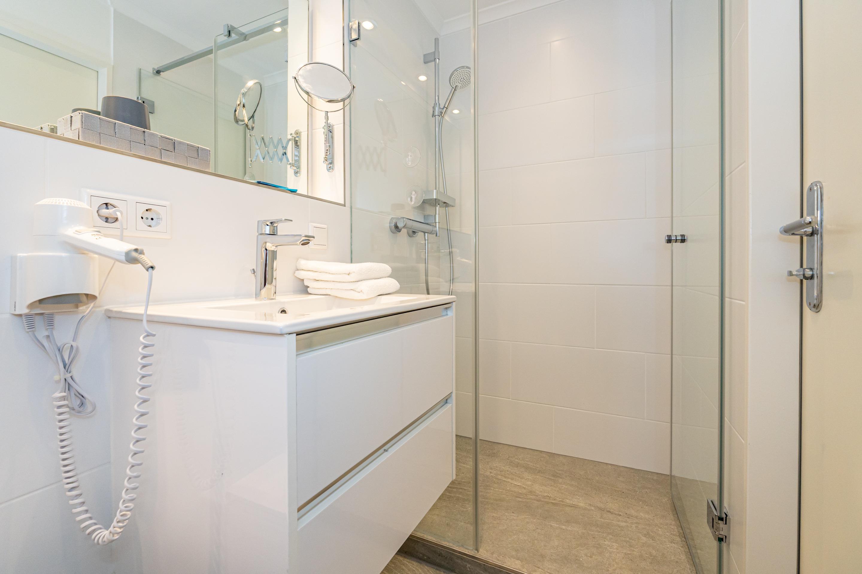 Im neuen Badezimmer befindet sich eine Dusche mit flachem Einstieg, ein WC, ein Waschtisch und ein Fön.