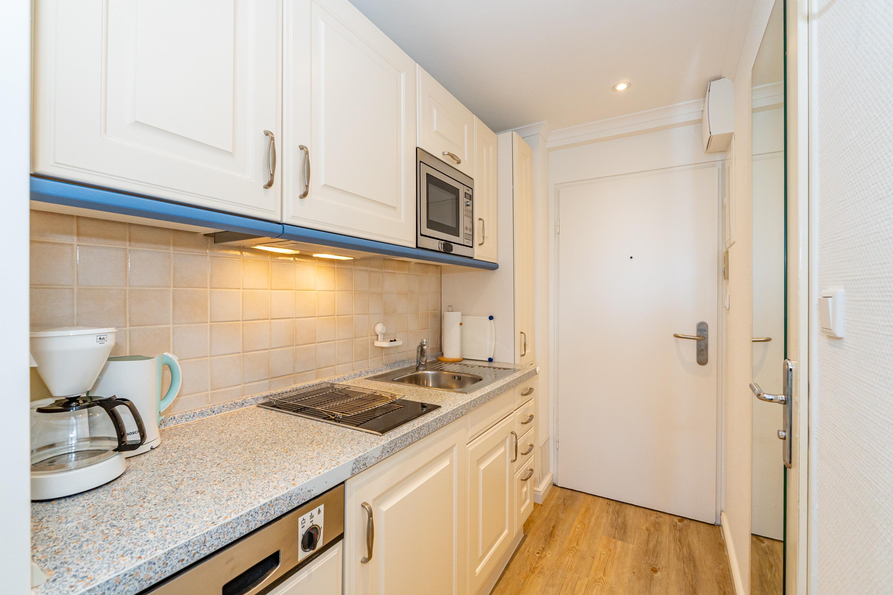 Die Küchenzeile hat einen Geschirrspüler, eine Mikrowelle, ein Cerankochfeld und einen Kühlschrank mit 3* Gefrierfach. Kaffeemaschine, Wasserkocher und Toaster gehören zur Grundausstattung.