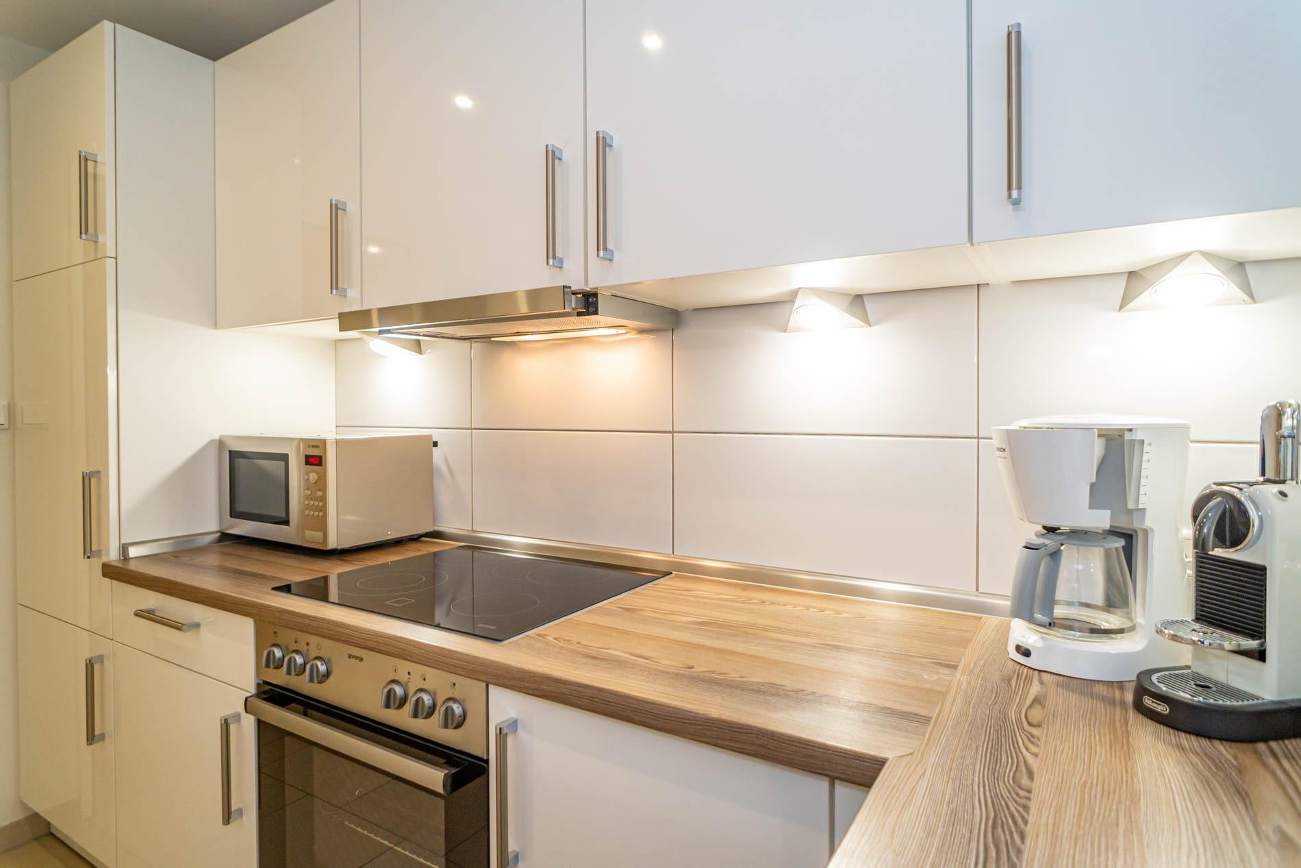 Die Küchenzeile hat einen Herd mit Backofen und Cerankochfeld, einen Geschirrspüler, eine Mikrowelle und einen Kühlschrank mit 3-Sterne-Gefrierfach. Nespresso-Kapsel-Kaffeemaschine und Kaffee-Filtermaschine, Wasserkocher und Toaster gehören zur Grundausstattung.