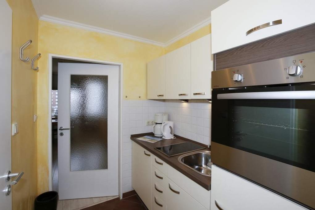Die Küchenzeile hat ein Backofen und ein Cerankochfeld (2Kochfelder), einen Kühlschrank, Kaffeemaschine, Wasserkocher und Toaster gehören zur Grundausstattung.
