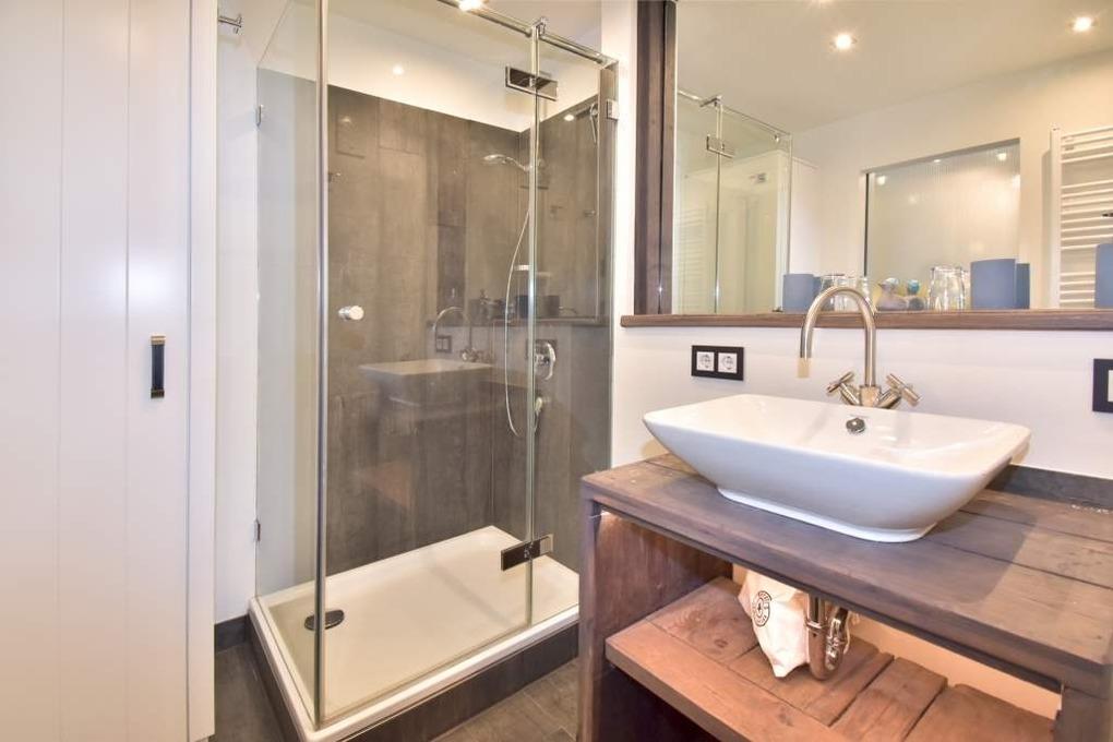Das neue Badezimmer überzeugt mit einer großzügigen Dusche mit extraflachem Einstieg, einem gemauerten Waschtisch sowie WC – funktional, hochwertig und geschmackvoll gestaltet.