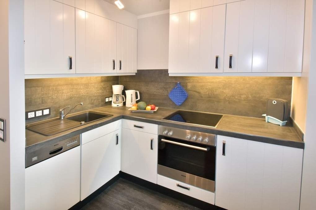 Die offene, moderne Küche ist mit einem Cerankochfeld, einem Geschirrspüler sowie Kaffeemaschine, Wasserkocher und Toaster ausgestattet – perfekt für eine unkomplizierte Selbstverpflegung.