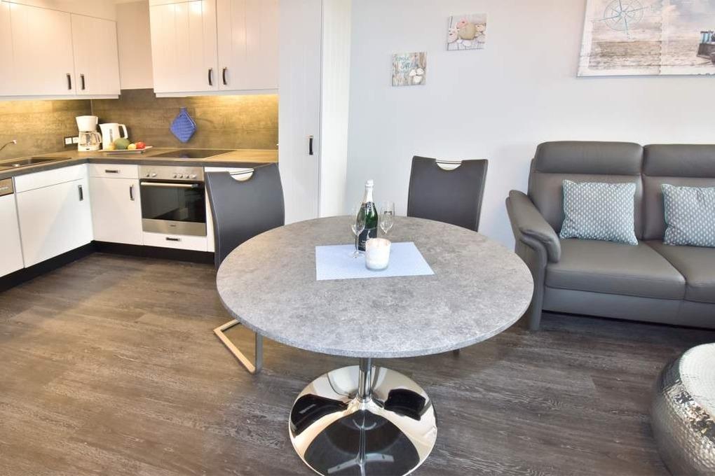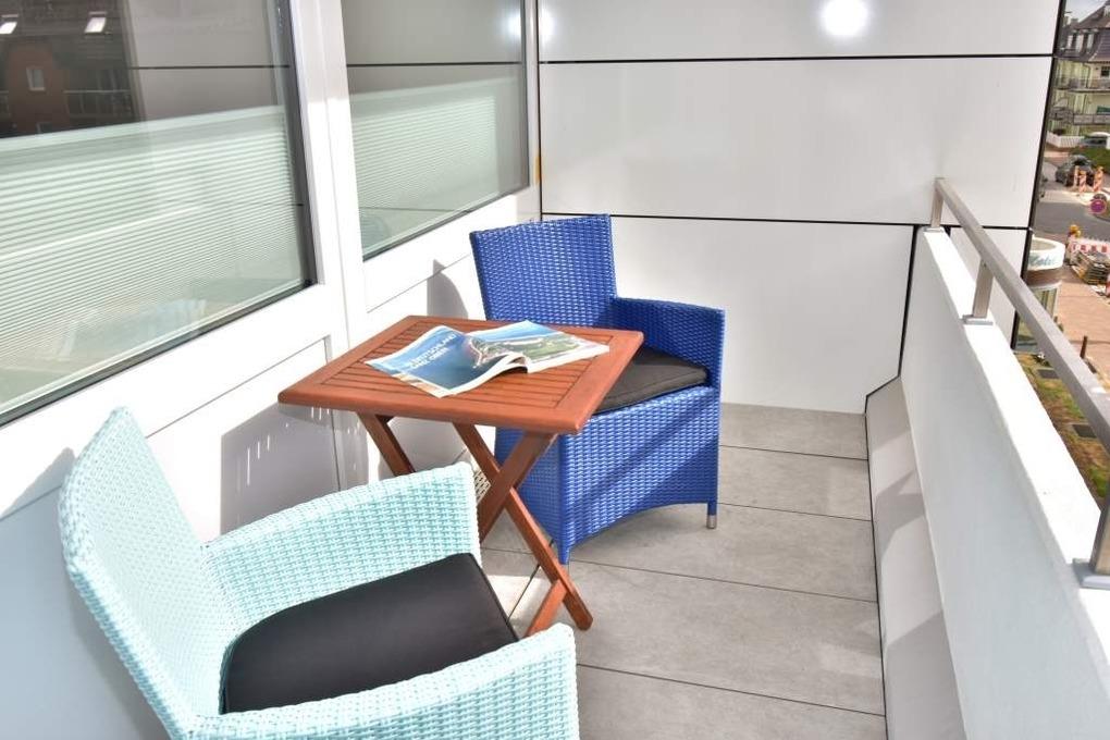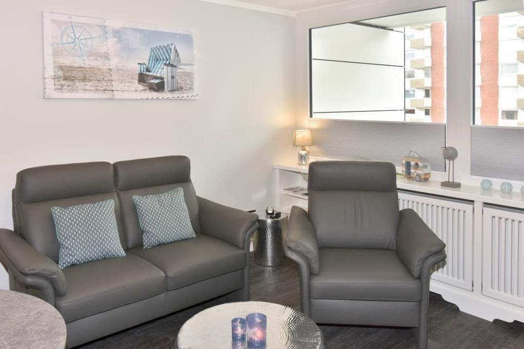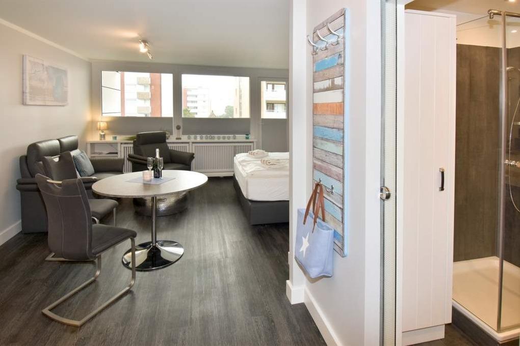 Modernes City-Appartement mit Ostloggia – hochwertig renoviert und geschmackvoll eingerichtetDiese renovierte 1-Zimmer-Nichtraucherwohnung in der 2. Etage bietet auf ca. 38 m² stilvollen Wohnkomfort für zwei Erwachsene – ideal für einen entspannten Aufenthalt im Herzen von Westerland. Die nach Osten ausgerichtete Loggia lädt mit Morgensonne, Balkonmöbeln und Auflagen zu einem gemütlichen Start in den Tag ein.