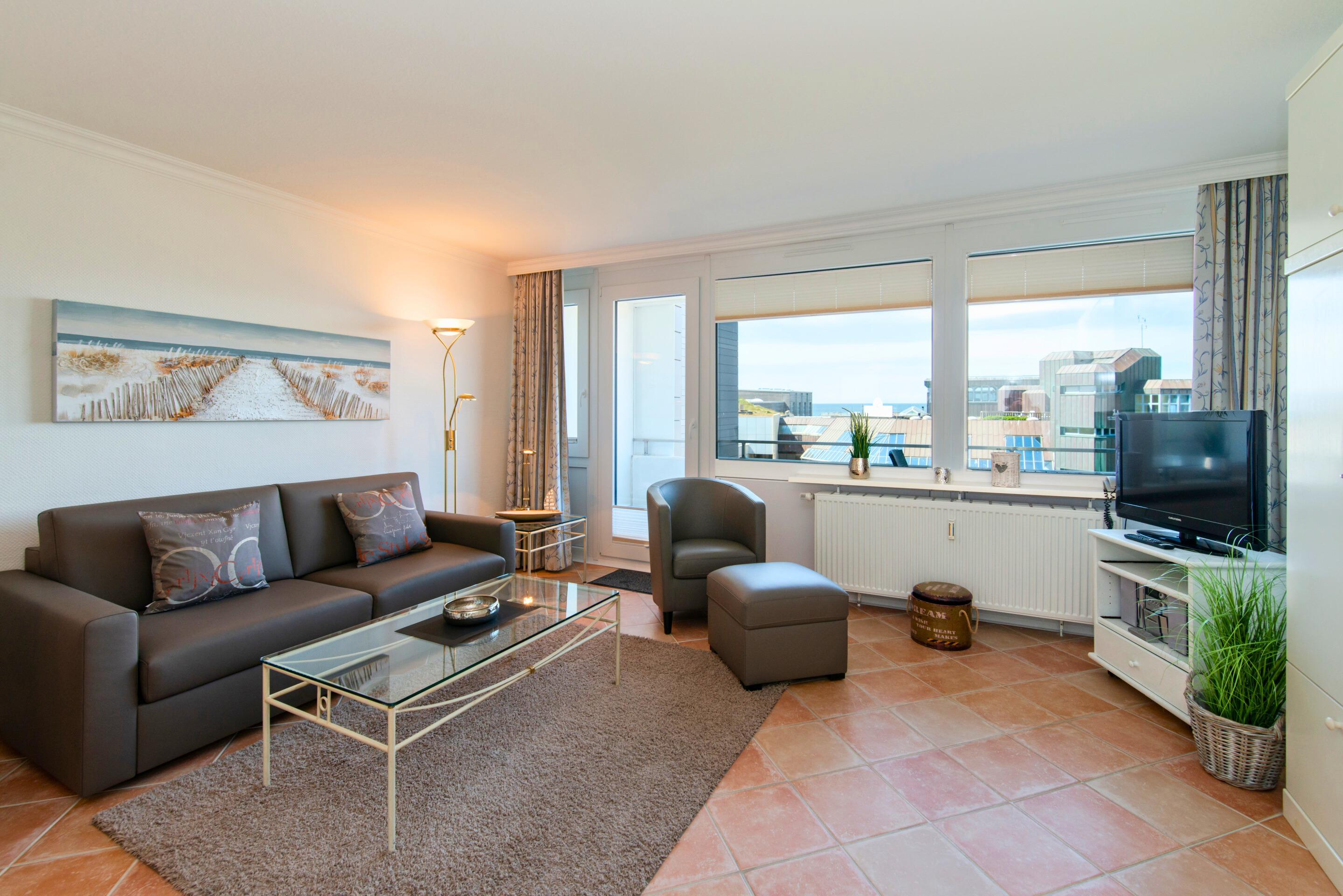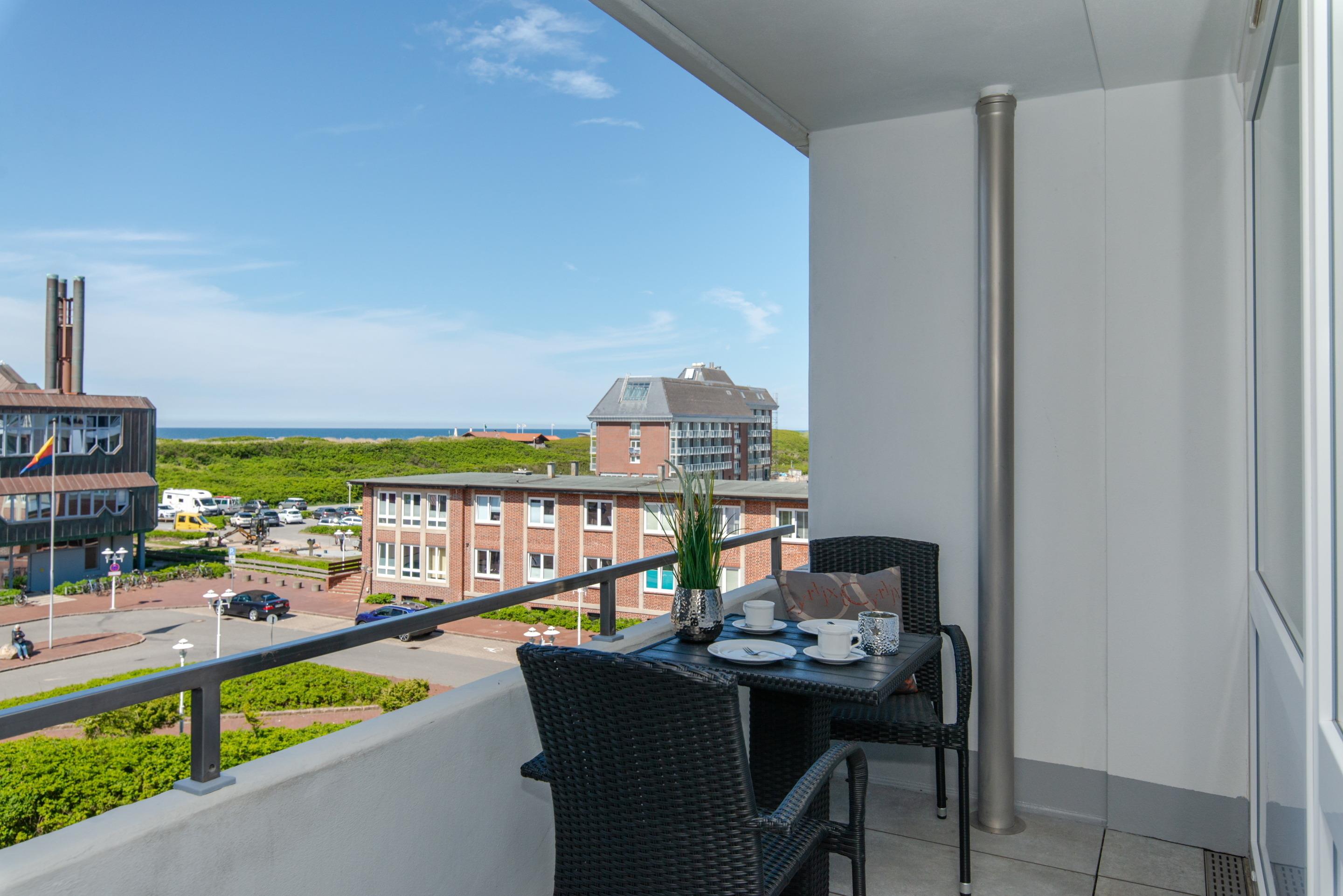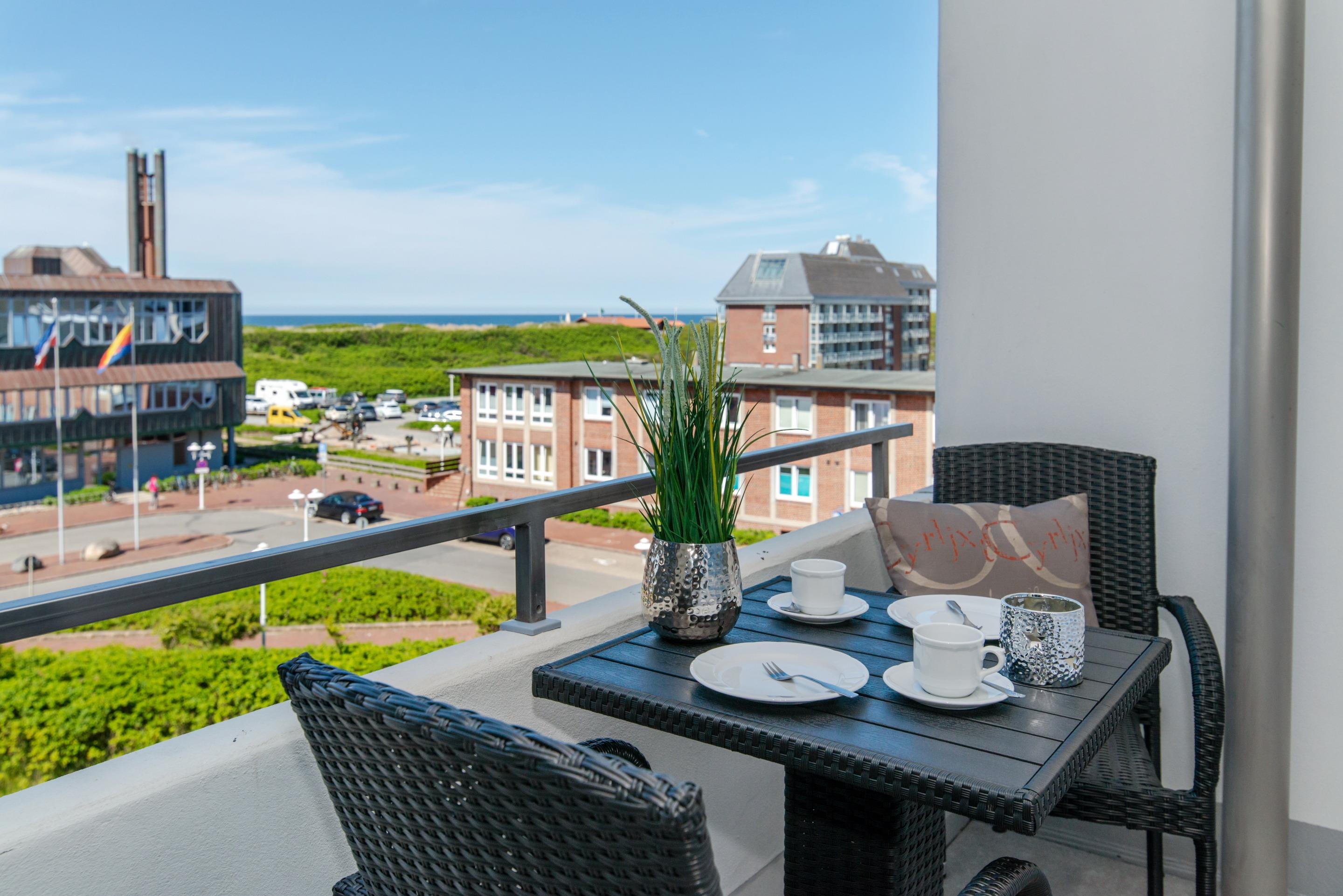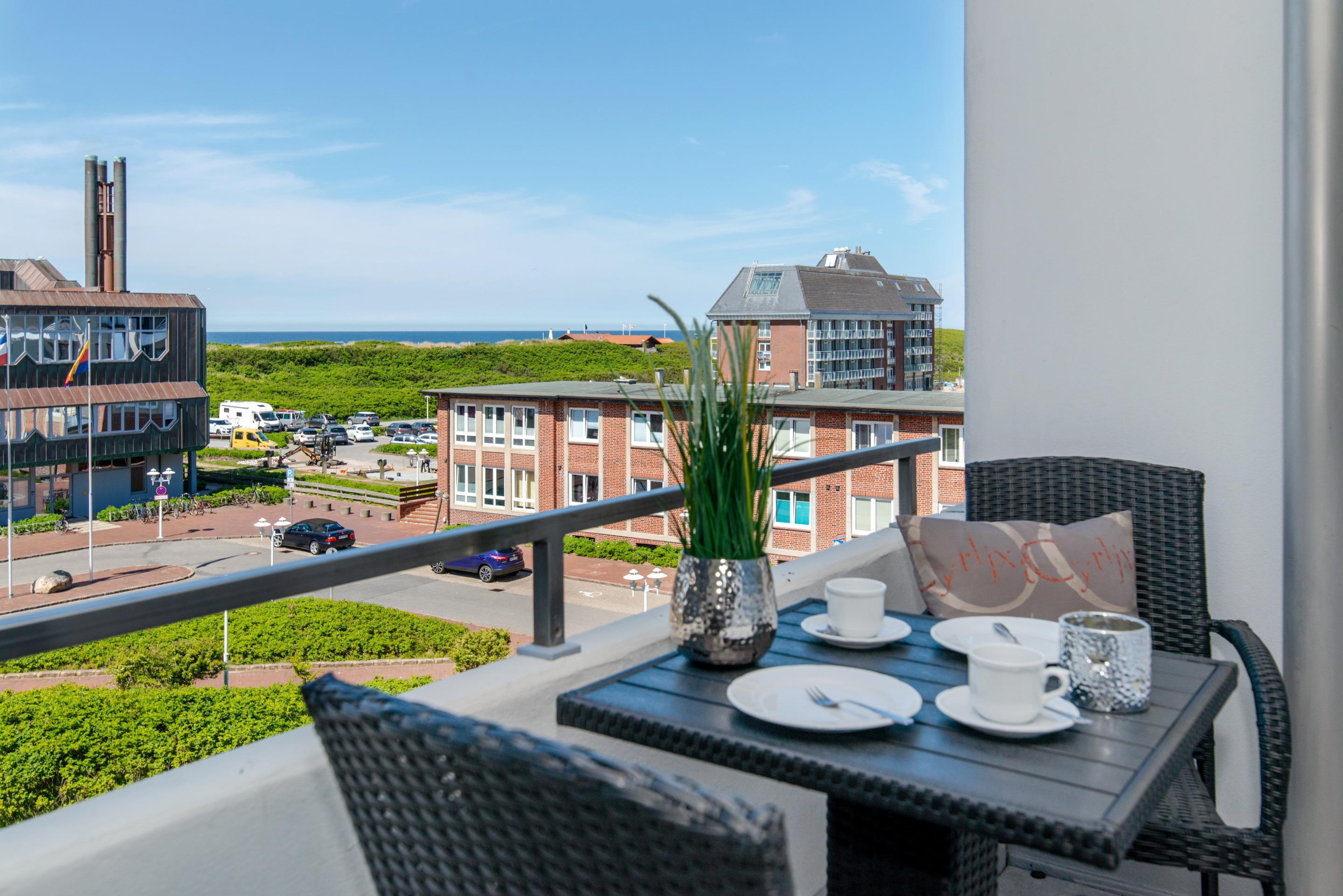 Moderne Ferienwohnung in Westerland mit Meerblick, Balkon und kompletter Ausstattung für einen komfortablen Aufenthalt.