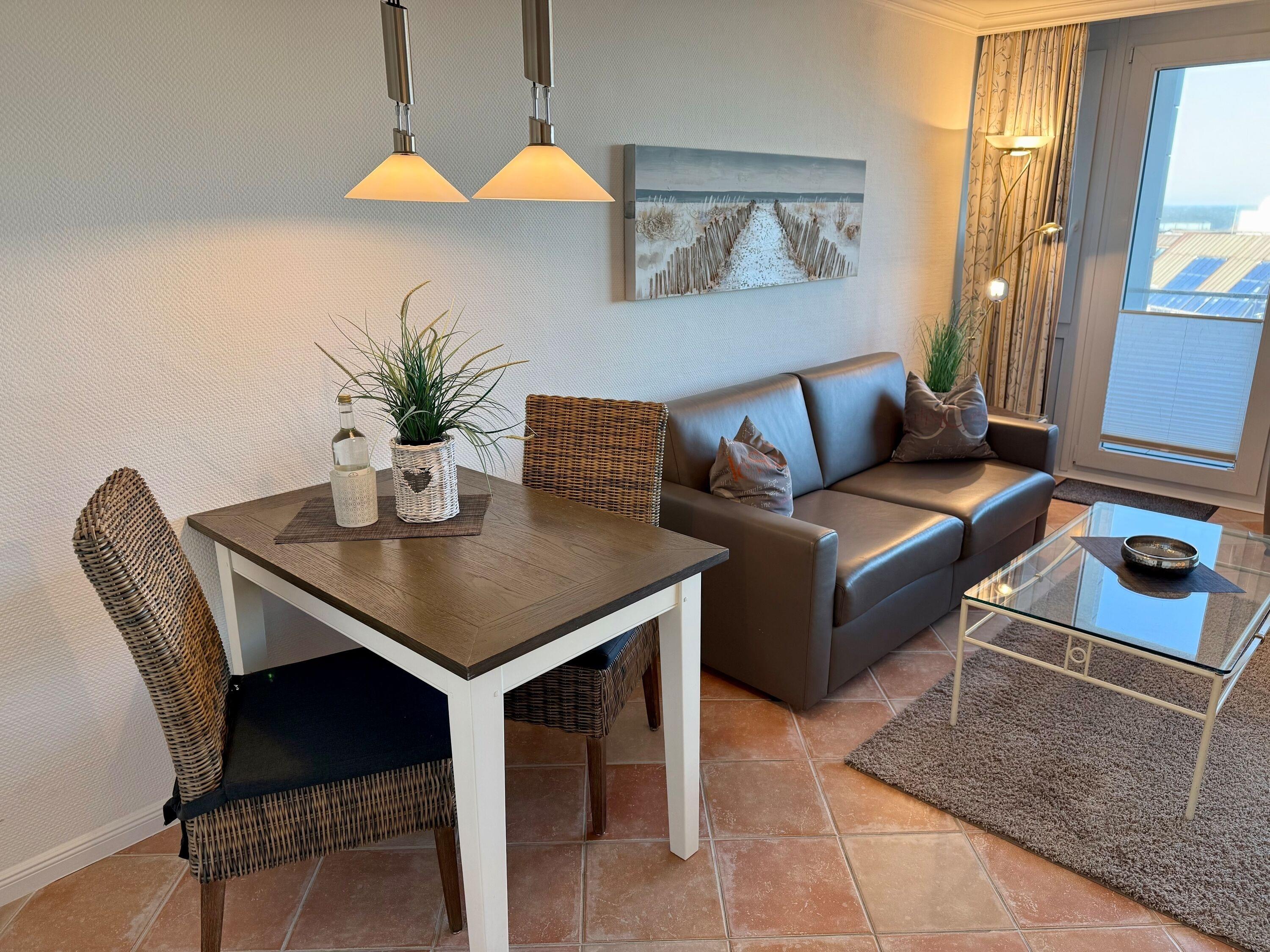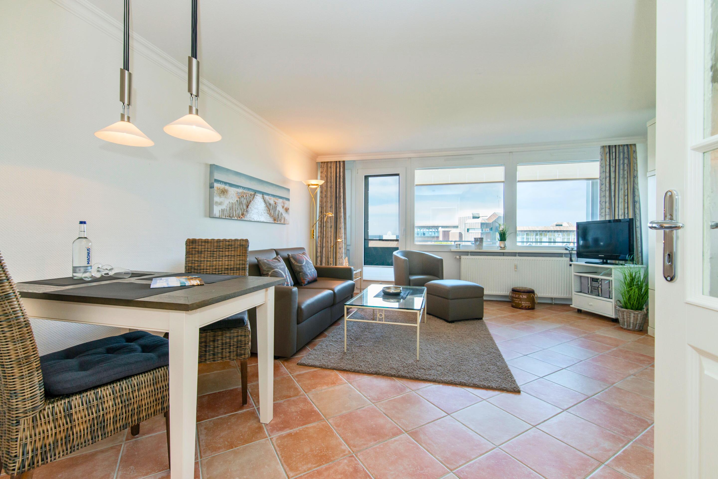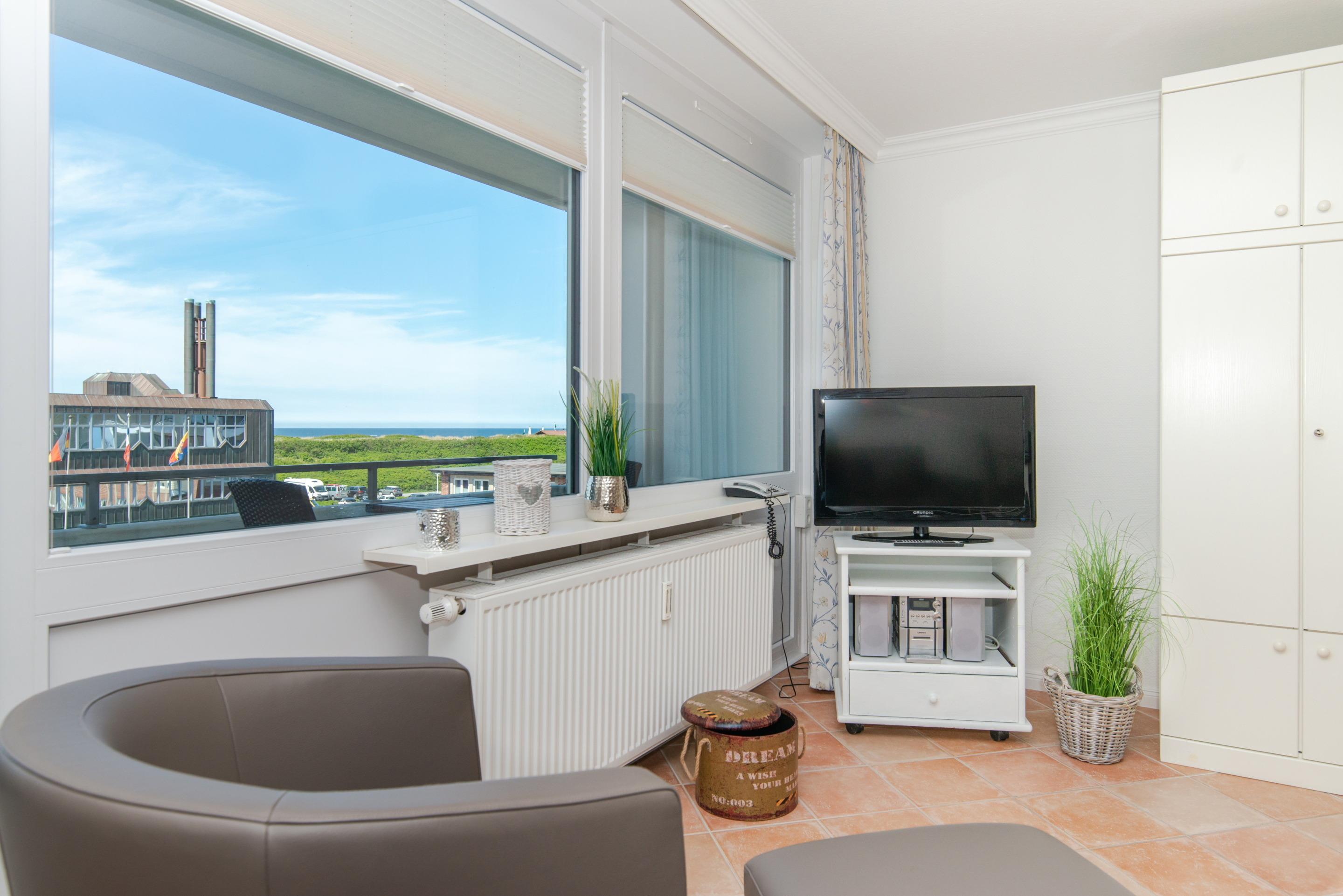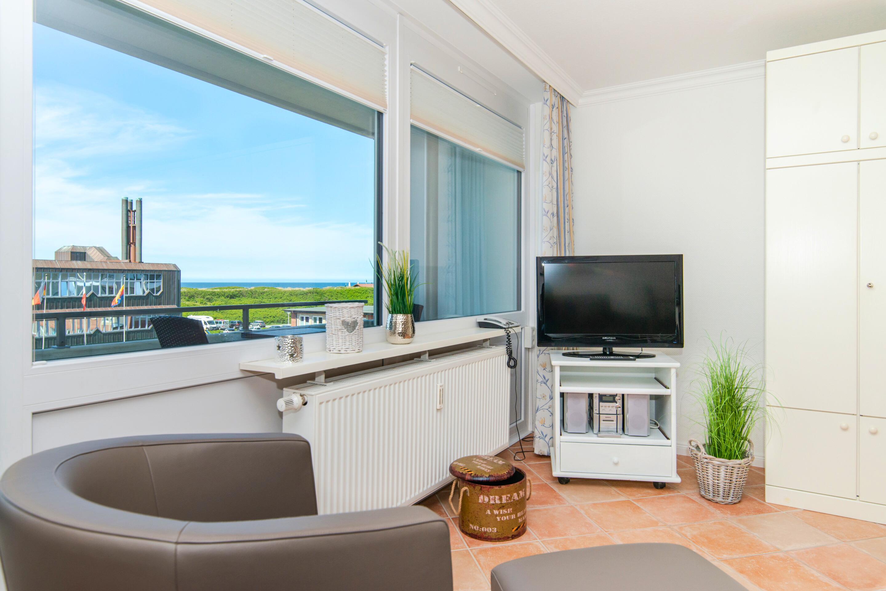 Moderne Ferienwohnung in Westerland mit Meerblick, Balkon und kompletter Ausstattung für einen komfortablen Aufenthalt.