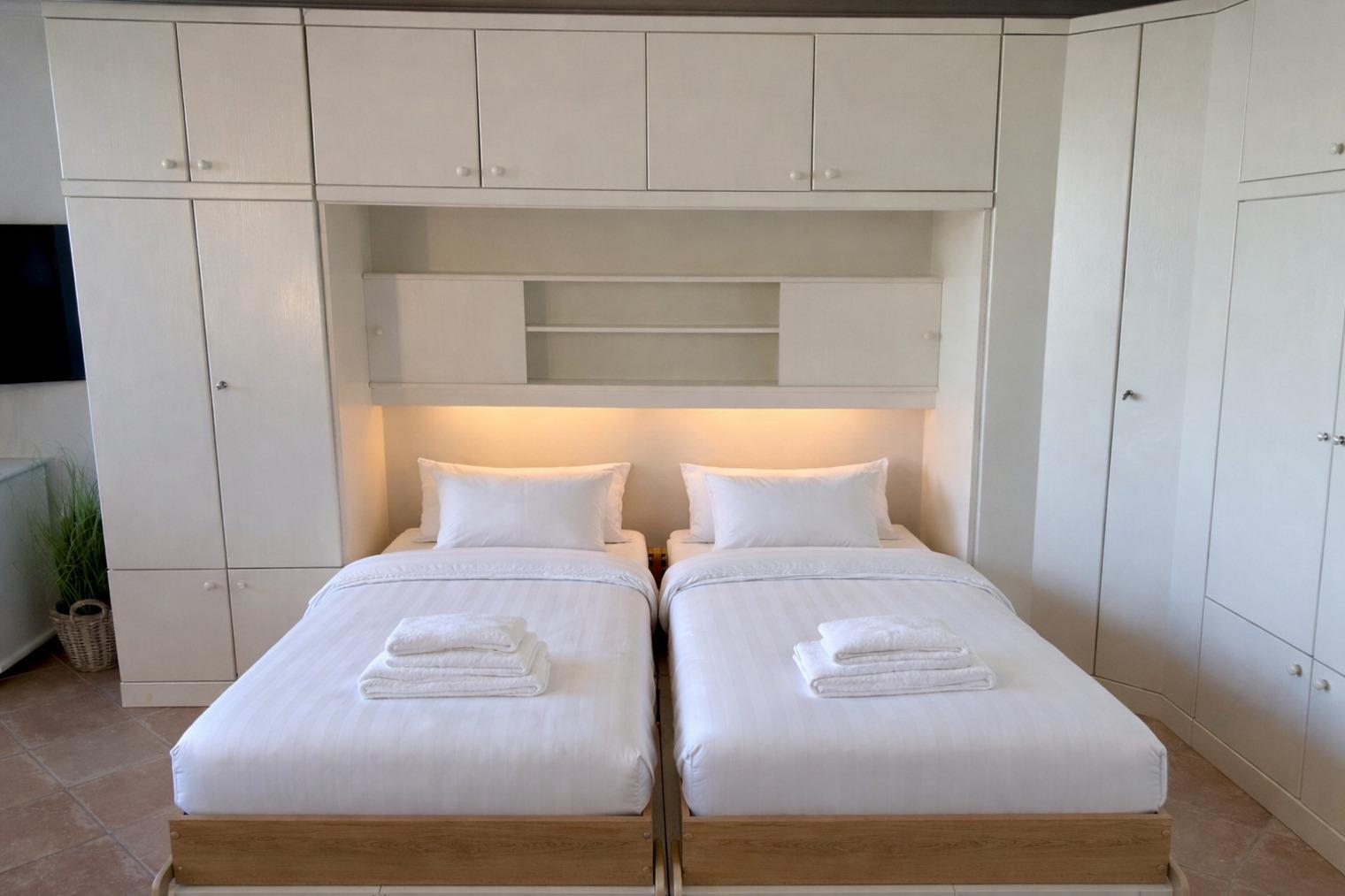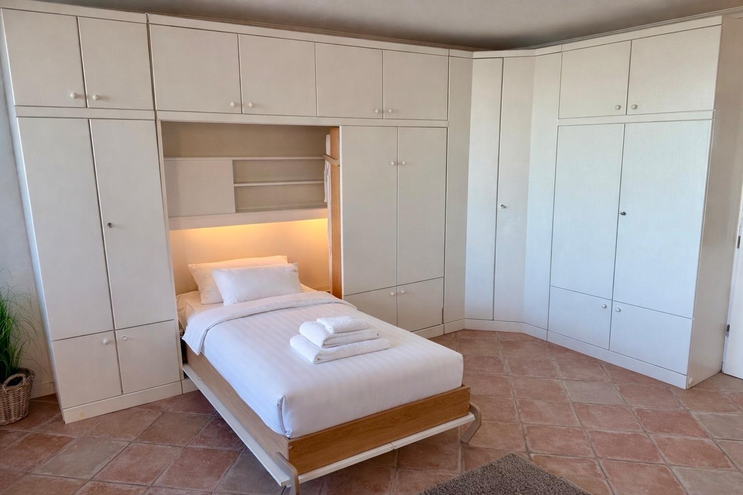 Der Wohn-/Schlafraum besteht aus einer hochwertigen Sitzgarnitur von Bielefelder Werkstätten (2-Sitzer-Couch und ein Fußhocker), Doppelschrankbetten (einzeln ausklappbar, Federkernmatratzen), einem Essplatz, einem großen Kabel-Flachbild-TV, Radio/CD-Player.