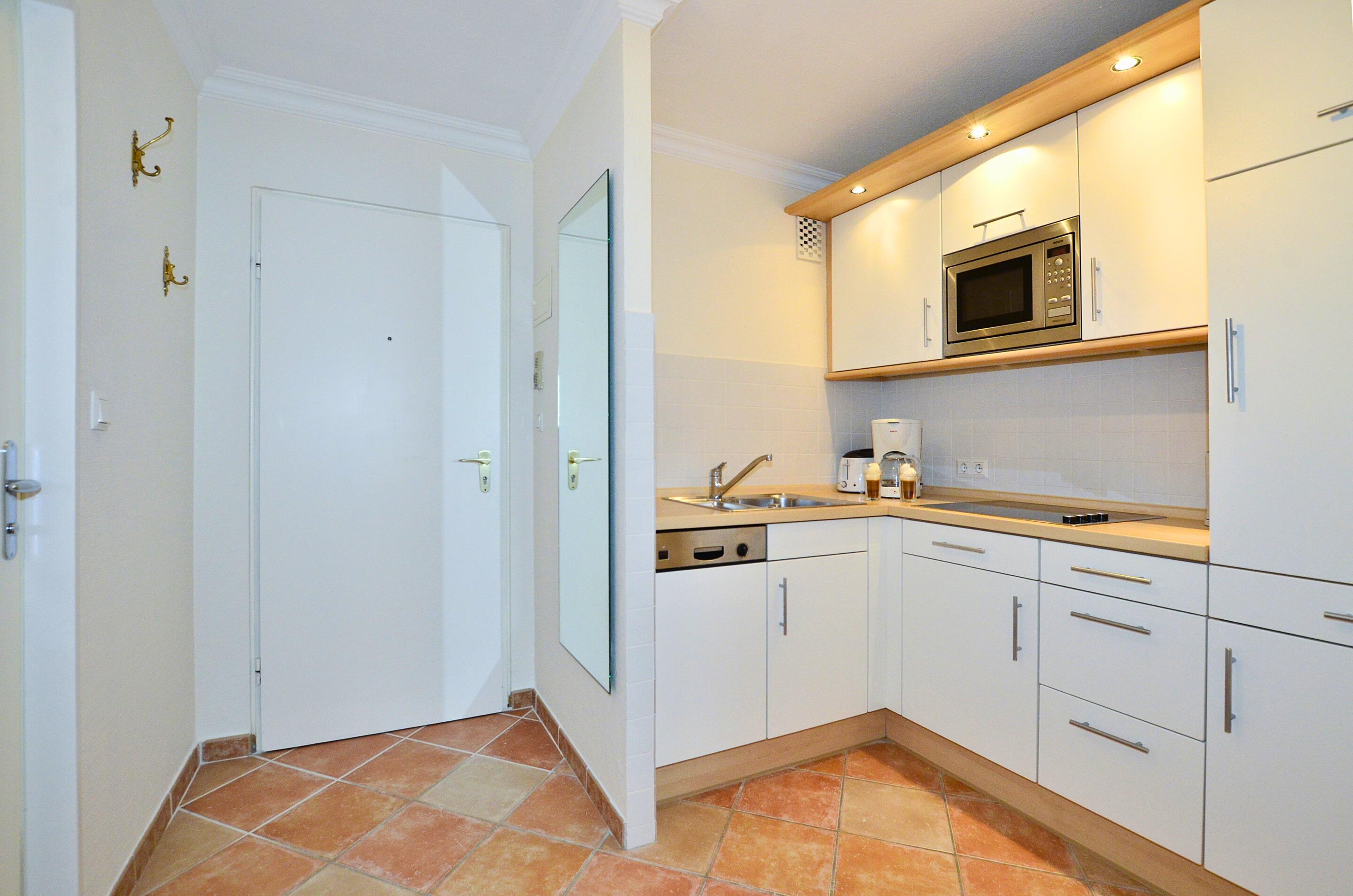 Die separate Küche hat einen Geschirrspüler, eine Mikrowelle (mit Grillfunktion), eine Nespresso-Maschine, ein Cerankochfeld und einen Kühlschrank mit 3*-Gefrierfach.