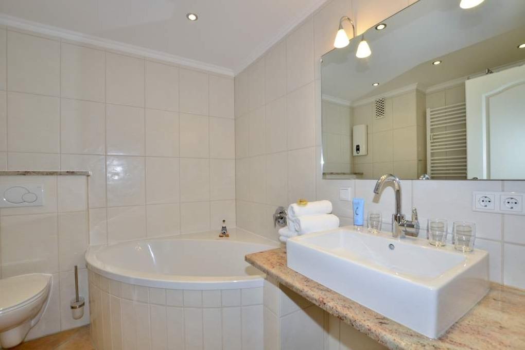 Im modernen, großzügigen Bad befinden sich eine Dusche, eine Eckbadewanne, ein WC, ein Waschtisch, ein Handtuchtrockner und Fön.