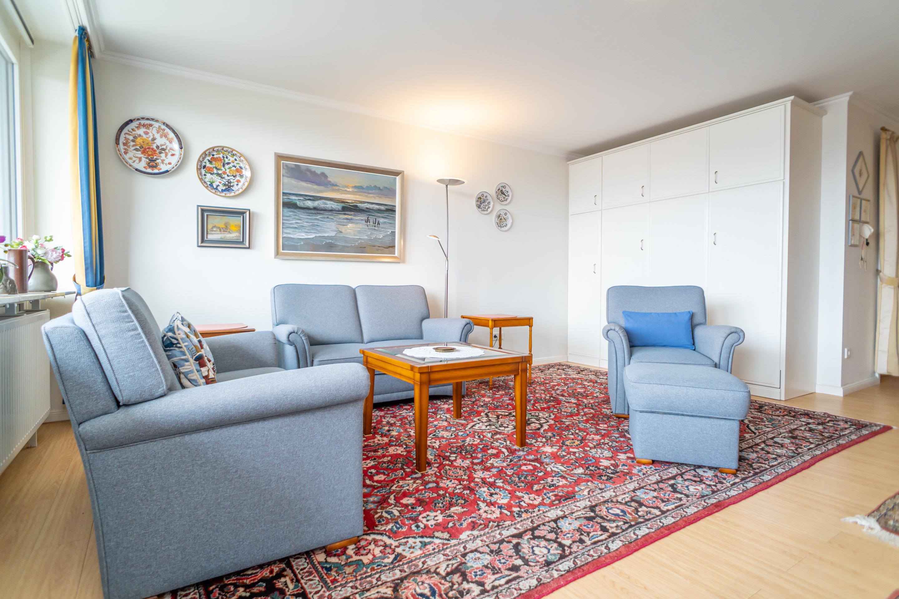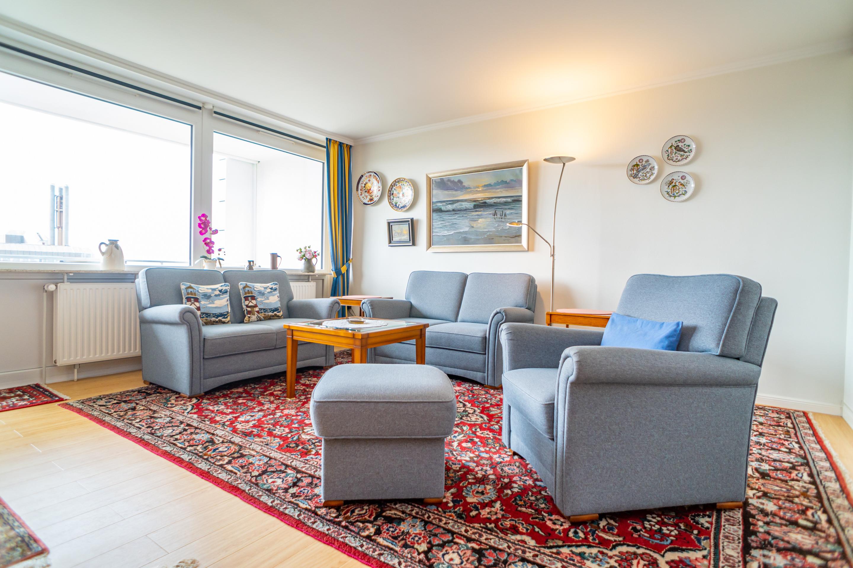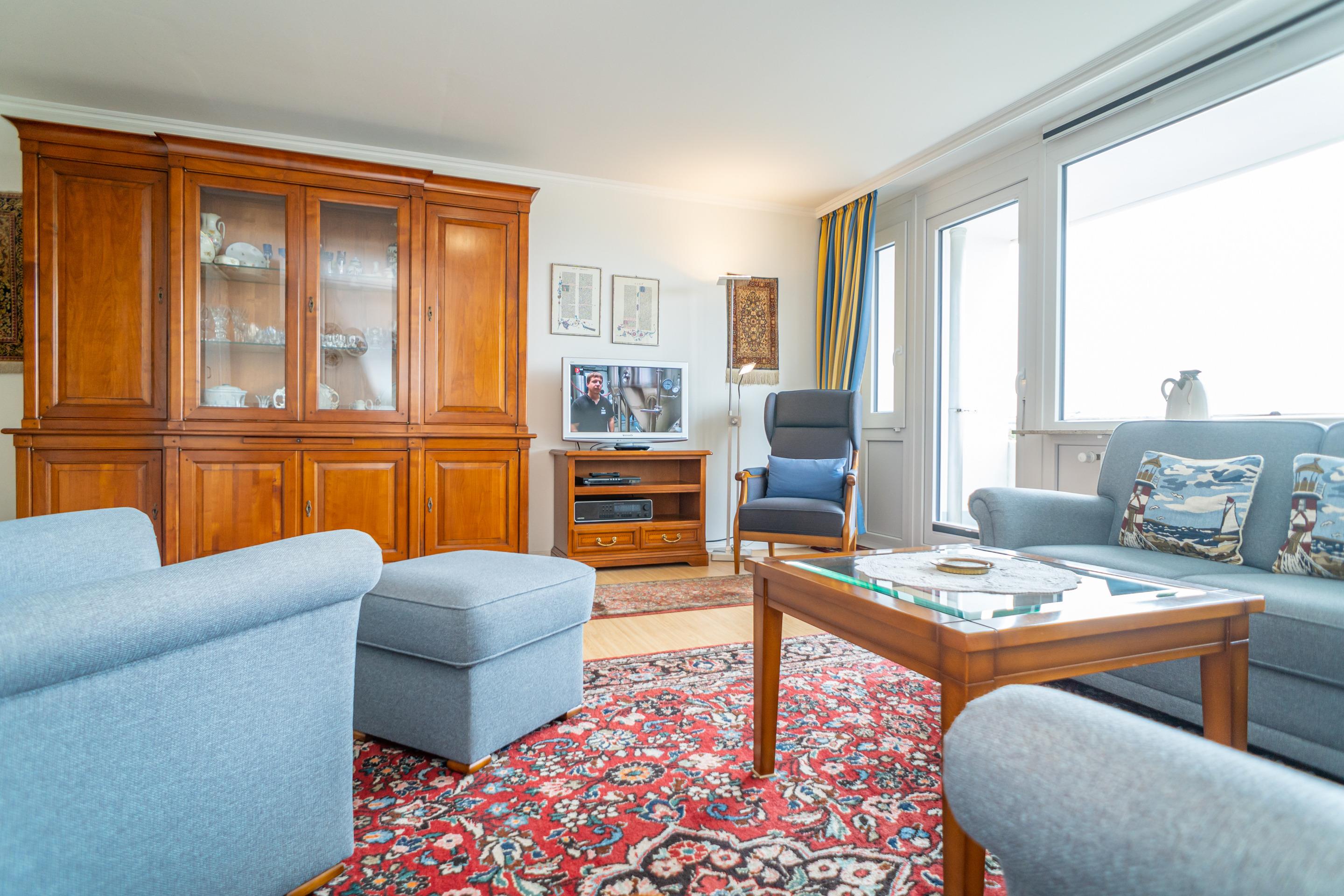 Komfortable 2-Zimmer-Nichtraucher-Ferienwohnung (ca. 76 qm) in der 3. Etage zur See- und Landseite mit Westloggia (Nachmittagssonne, mit Balkonmöbeln und Auflagen) und Ostloggia (Morgensonne, mit Balkonmöbeln und Auflagen) für max. 4 Personen.