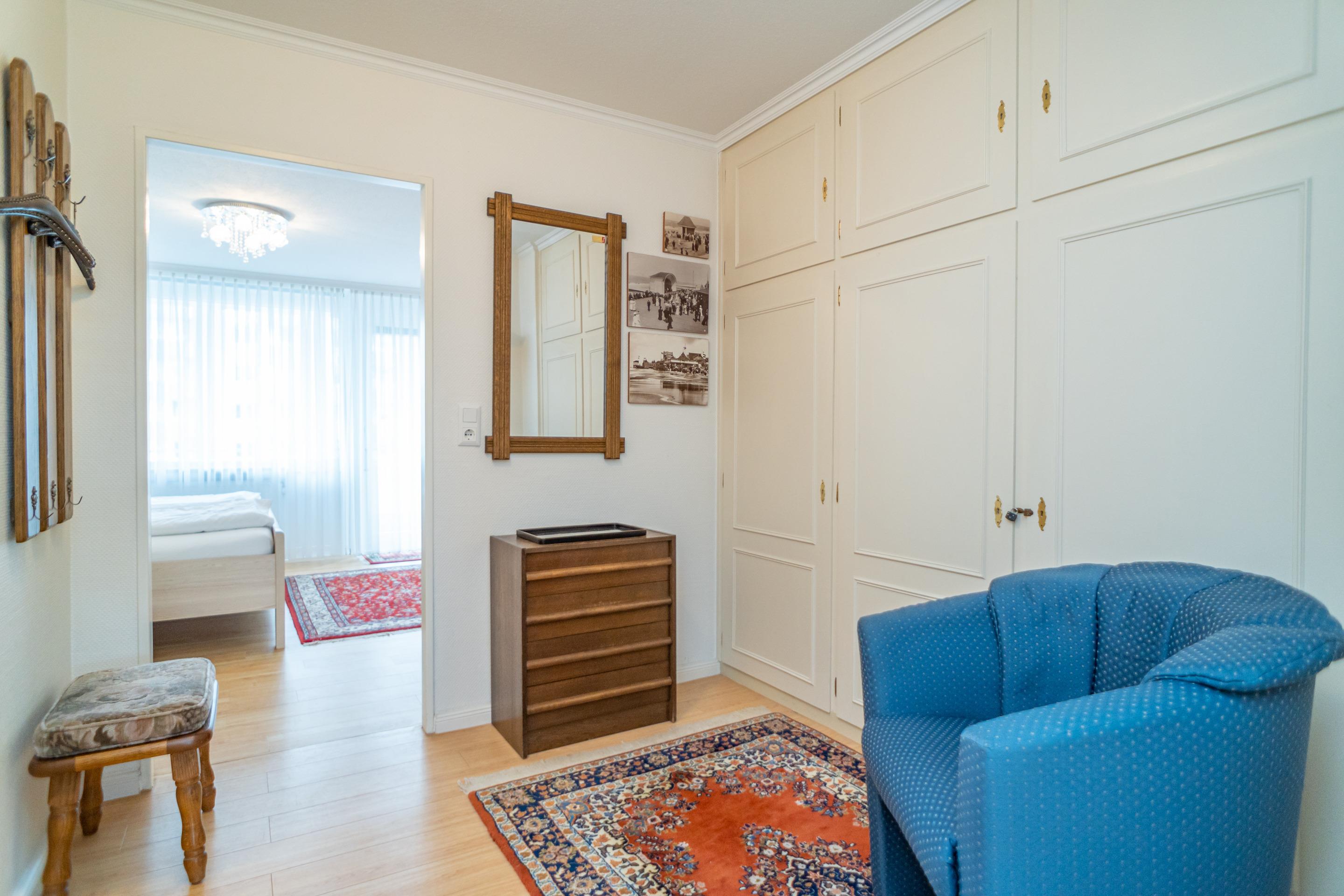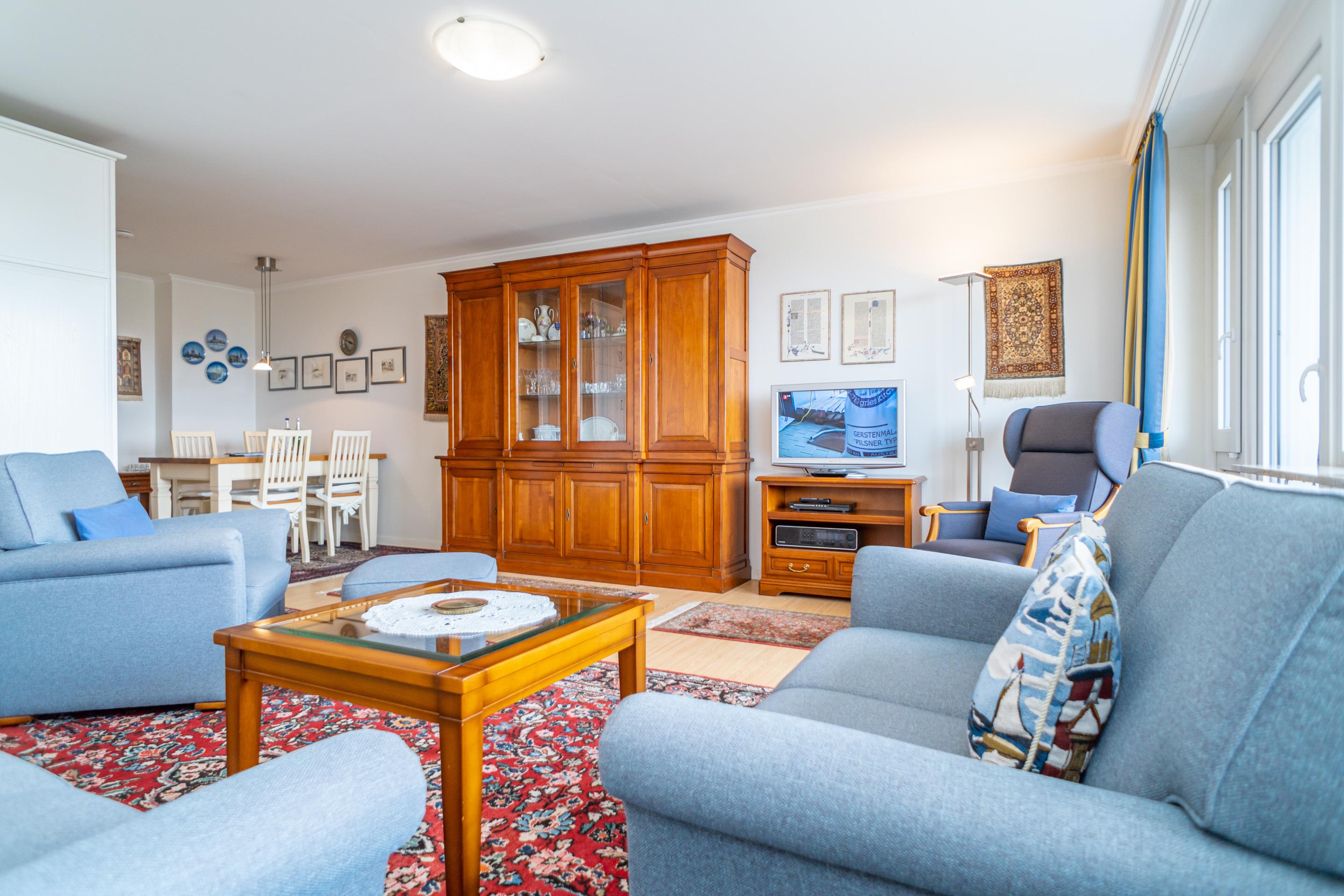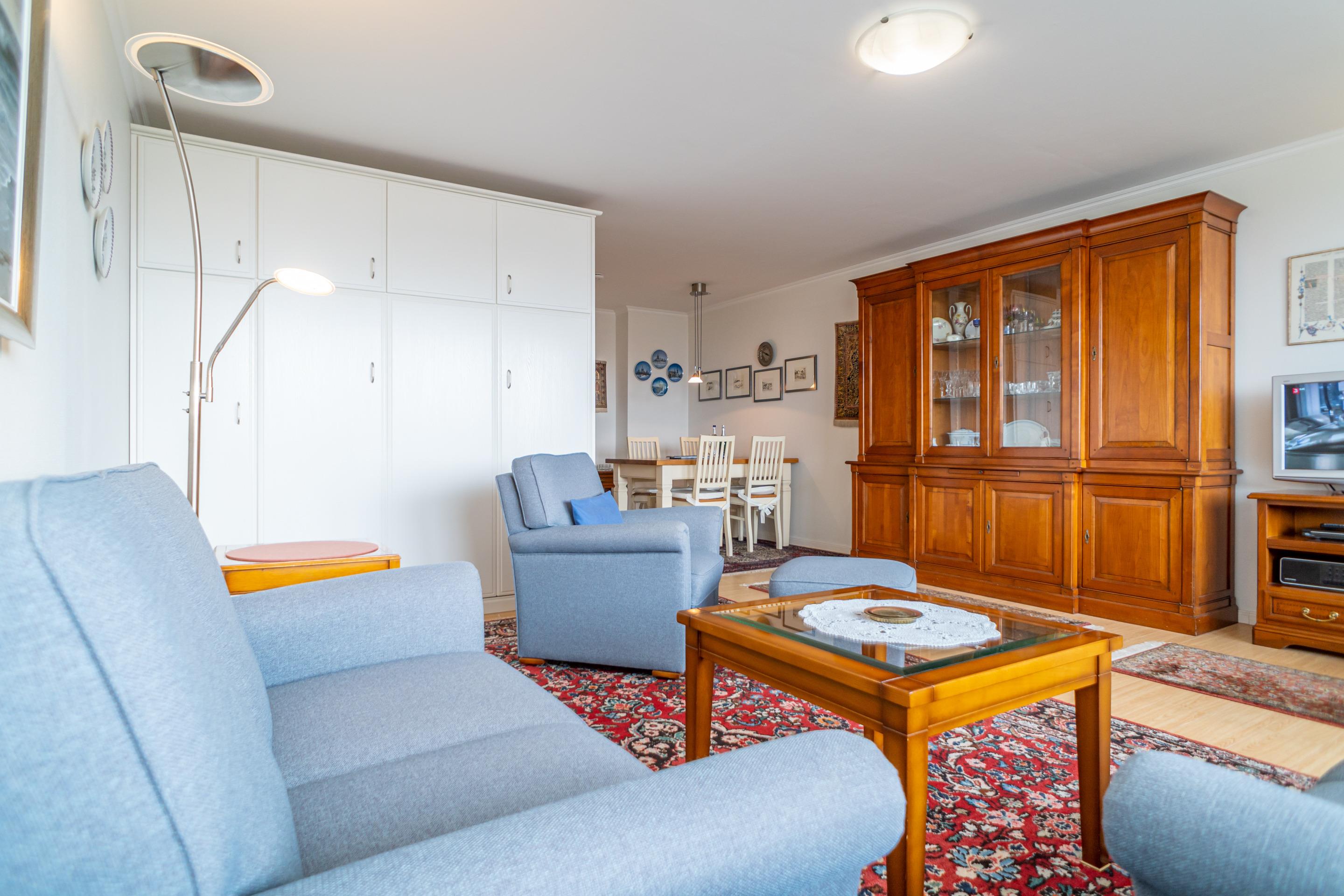 Komfortable 2-Zimmer-Nichtraucher-Ferienwohnung (ca. 76 qm) in der 3. Etage zur See- und Landseite mit Westloggia (Nachmittagssonne, mit Balkonmöbeln und Auflagen) und Ostloggia (Morgensonne, mit Balkonmöbeln und Auflagen) für max. 4 Personen.
