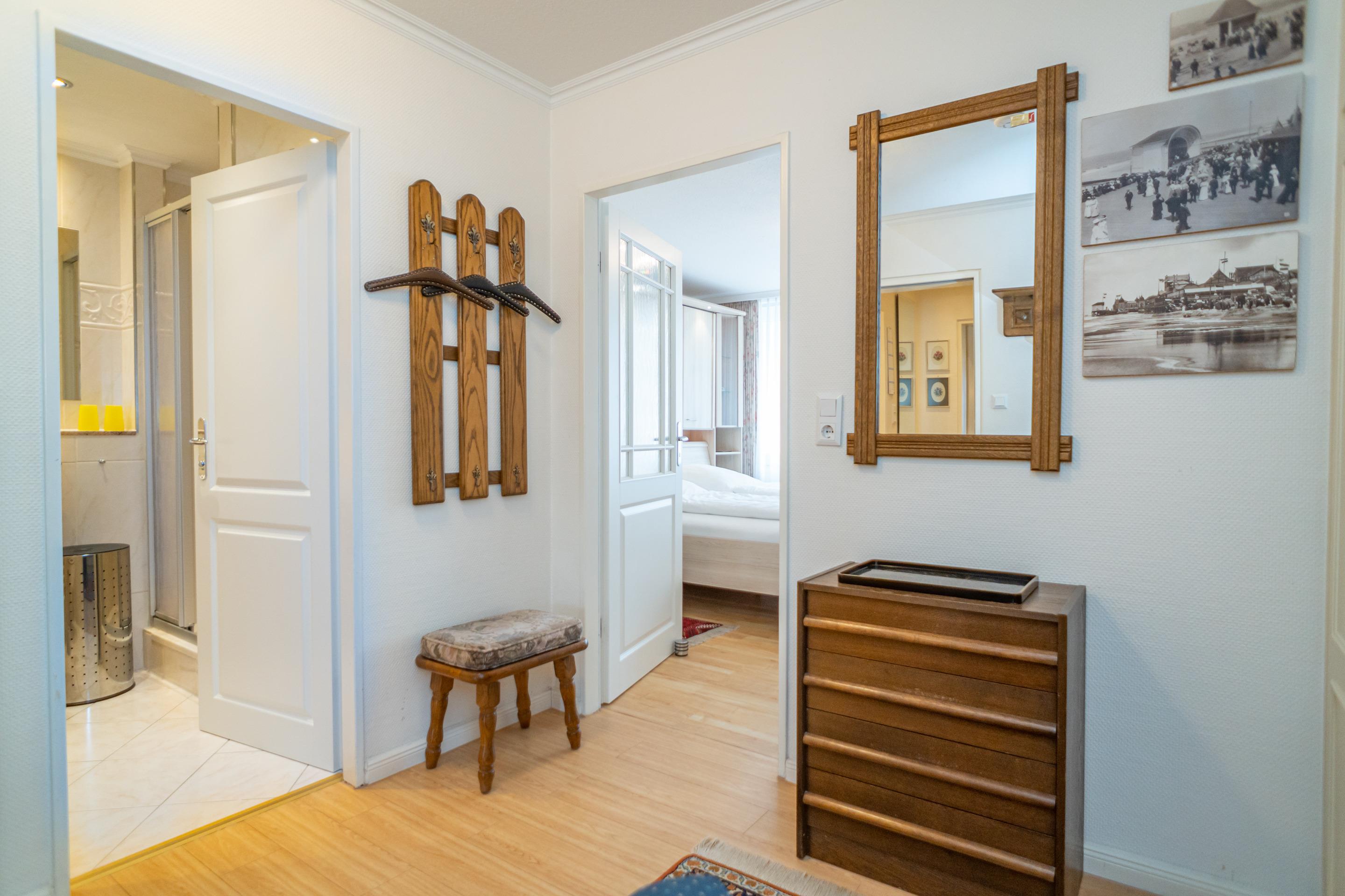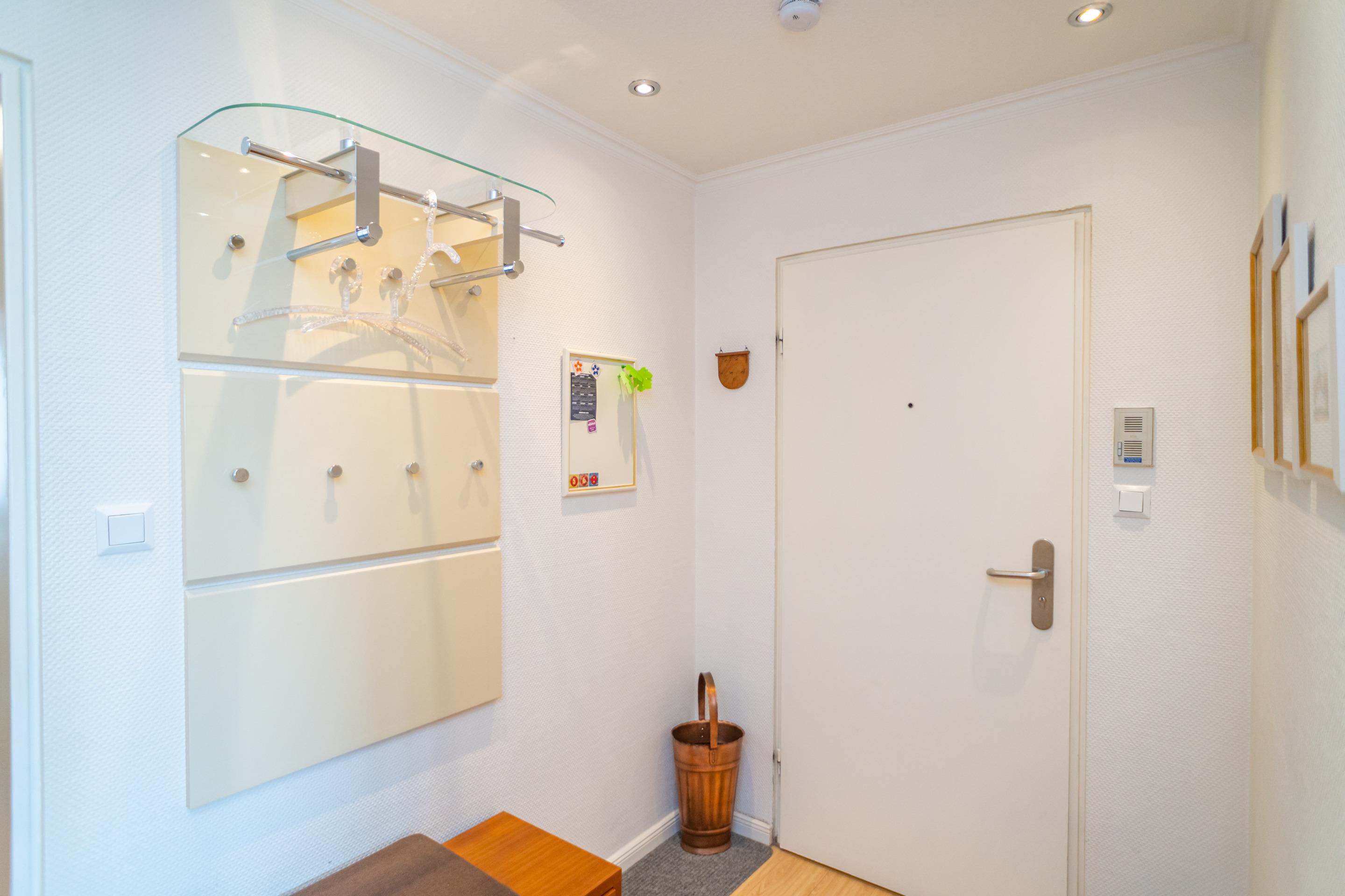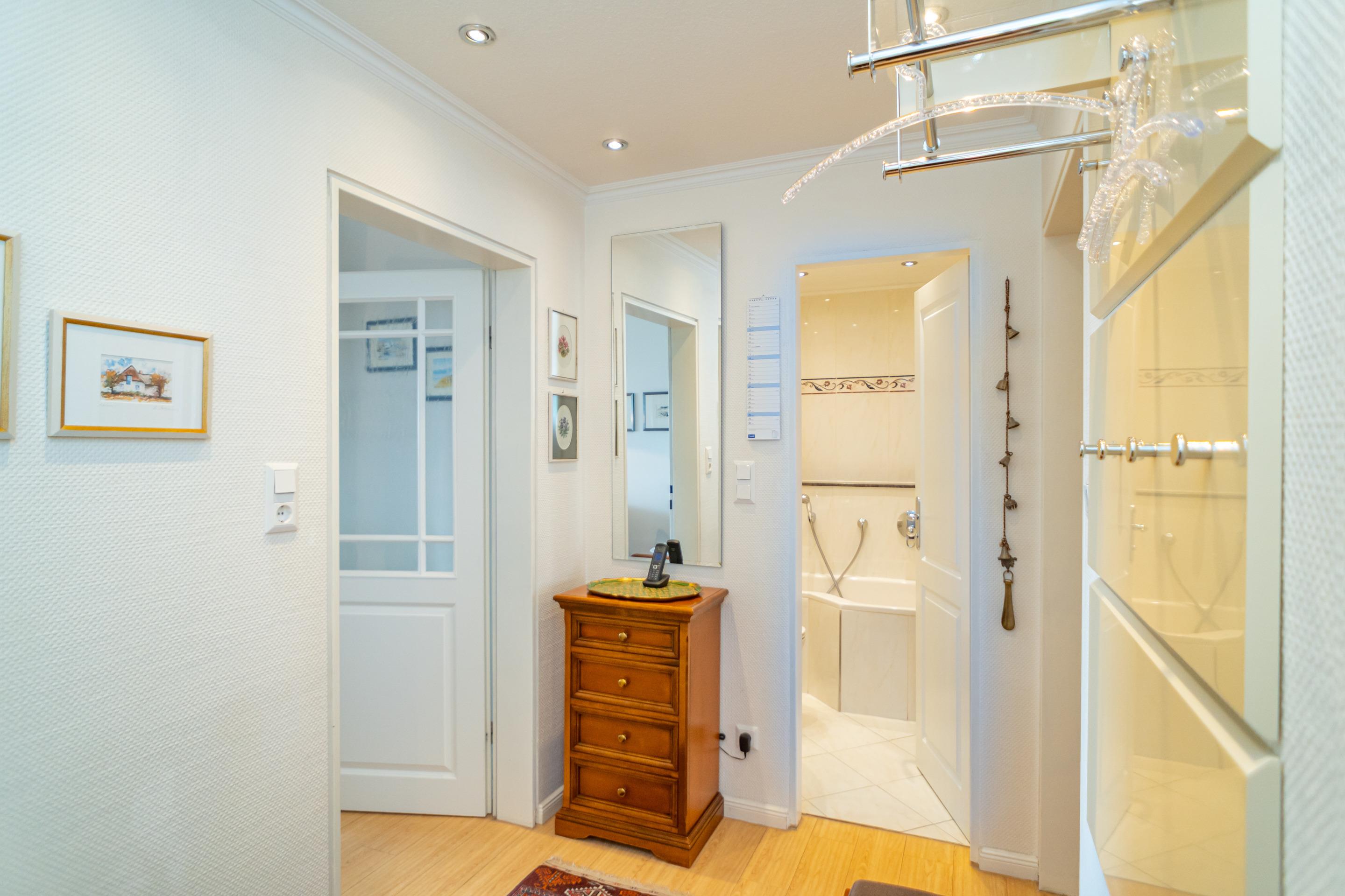 Vom Vorflur mit Garderobe gelangt man in das großzügige Wohnzimmer, in das neue Wannenbad/WC und in den Zwischenflur mit Zugang zum neuen Duschbad/WC und Schlafzimmer.