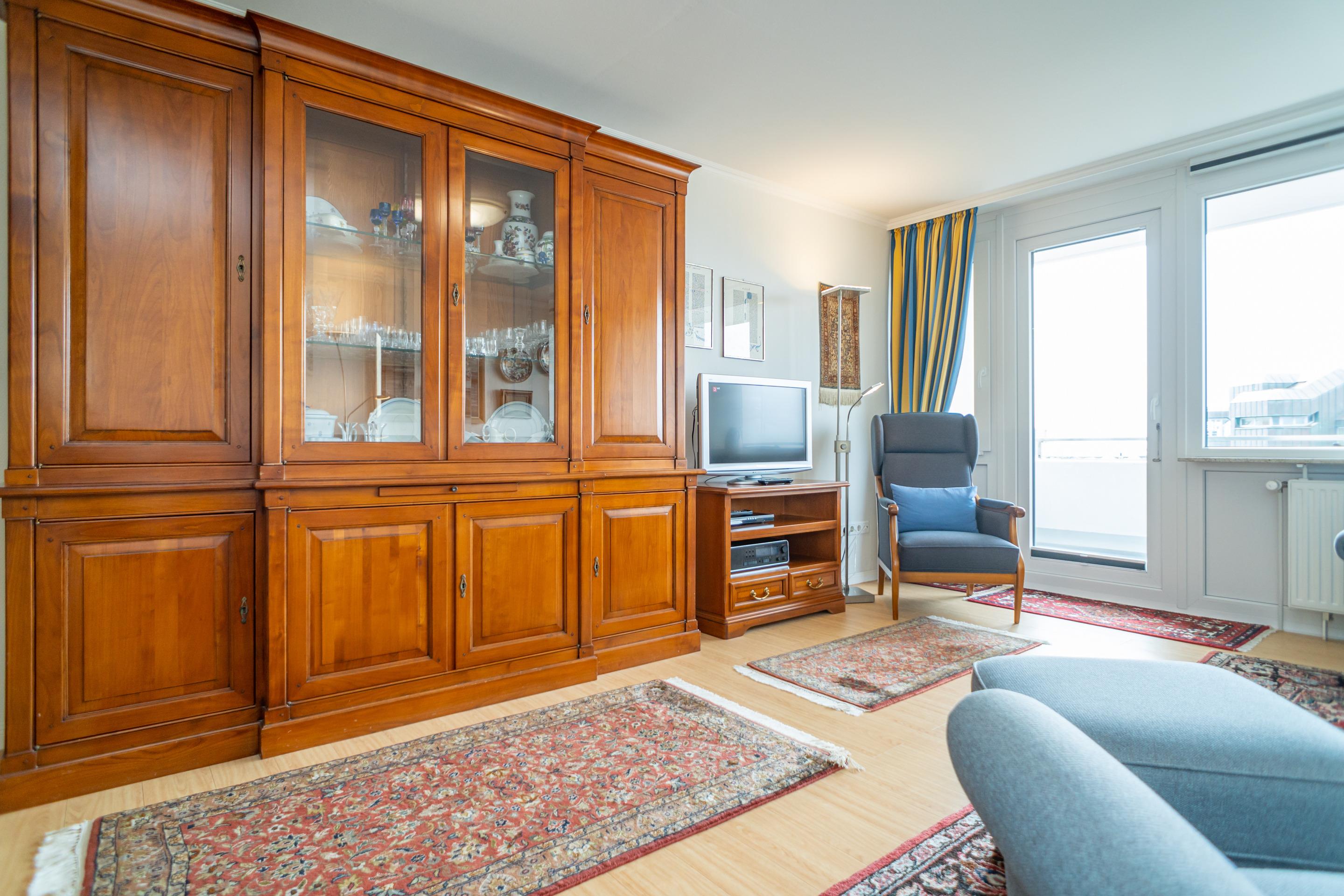 Das Wohnzimmer mit Austritt zur Westloggia hat eine Couchgarnitur mit zwei 2-Sitzer-Sofas, 2 Sesseln, einem Essplatz, einem Doppelschrankbett mit 1-türigem Kleiderschrank, Kabel-Flachbild-TV mit digitalem Empfang, Radio. Vom Wohnzimmer gelangt man in die neue, vollausgestattete, großzügige Küche mit Geschirrspüler, Backofen, Ceranfeld und mit Kühl- und separatem Gefrierschrank (mit 3 Gefrierfächern). Kaffeemaschine, Toaster, Wasser- und Eierkocher gehören zur Grundausstattung. Das große Schlafzimmer mit Austritt zur Ostloggia (Morgensonne) hat ein Doppelbett, viel Schrankraum und über den Zwischenflur direkten Zugang zum Badezimmer. Im 1. neuen Bad befinden sich eine Wanne, ein WC, ein Waschtisch und ein Handtuchtrockner. Im 2. neuen Bad befinden sich eine Dusche, ein WC, ein Waschtisch, ein Handtuchtrockner, eine Waschmaschine und ein Trockner (gebührenfreie Nutzung inklusive).