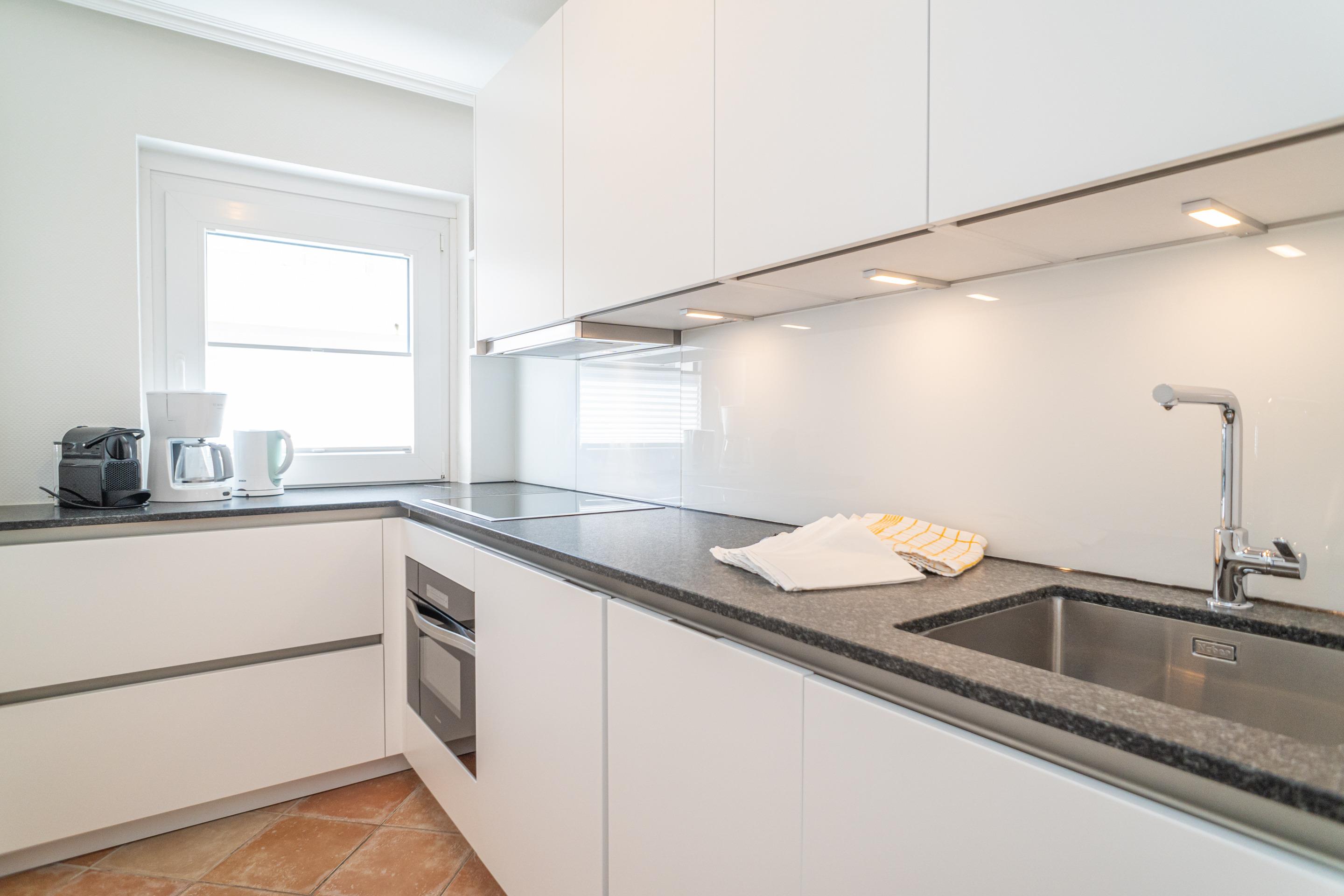 Die separate Küche hat einen Geschirrspüler, Herd mit Backofen und Cerankochfeld, eine Mikrowelle, einen Kühlschrank mit 3-Sterne-Gefrierfach und ein Fenster. Kaffeemaschine, Wasserkocher und Toaster gehören zur Grundausstattung.