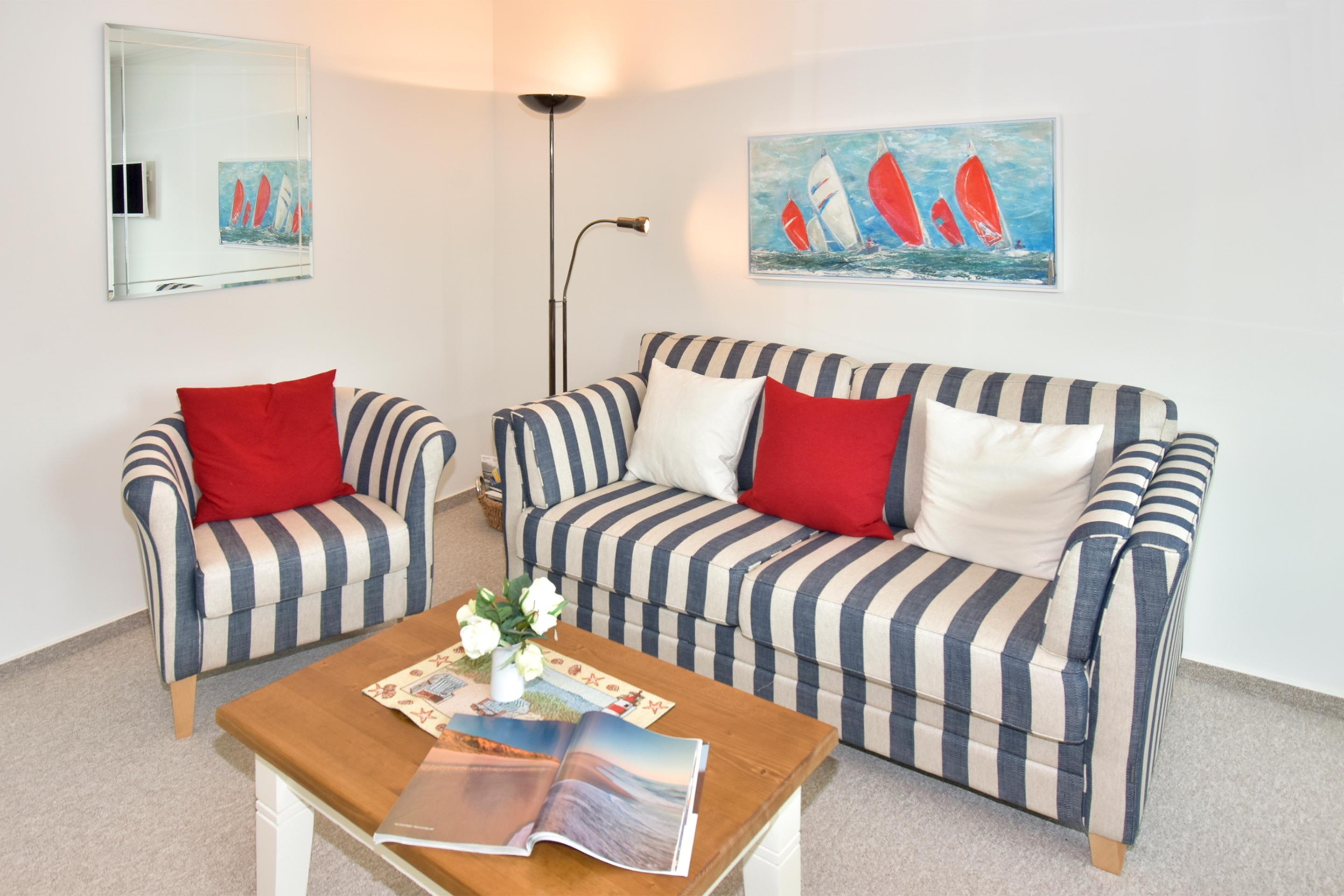 Der Wohn-/Schlafraum ist komplett neu gestaltet und besteht aus einer gemütlichen Sitzgarnitur (ein Zweisitzer und ein Stuhl), einem Essplatz, freistehenden Betten, Kabel-Flachbild-TV, Radio/CD. Die separate Küche hat einen Geschirrspüler, eine Mikrowelle, ein 2-Plattenkochfeld und Abzugshaube. Kaffeemaschine, Wasserkocher, und Toaster gehören zur Grundausstattung, sowie eine Saftpresse und ein Eierkocher. Im hellen, großzügig gestalteten Bad befinden sich eine Runddusche sowie ein beheizbarer Handtuchhalter.