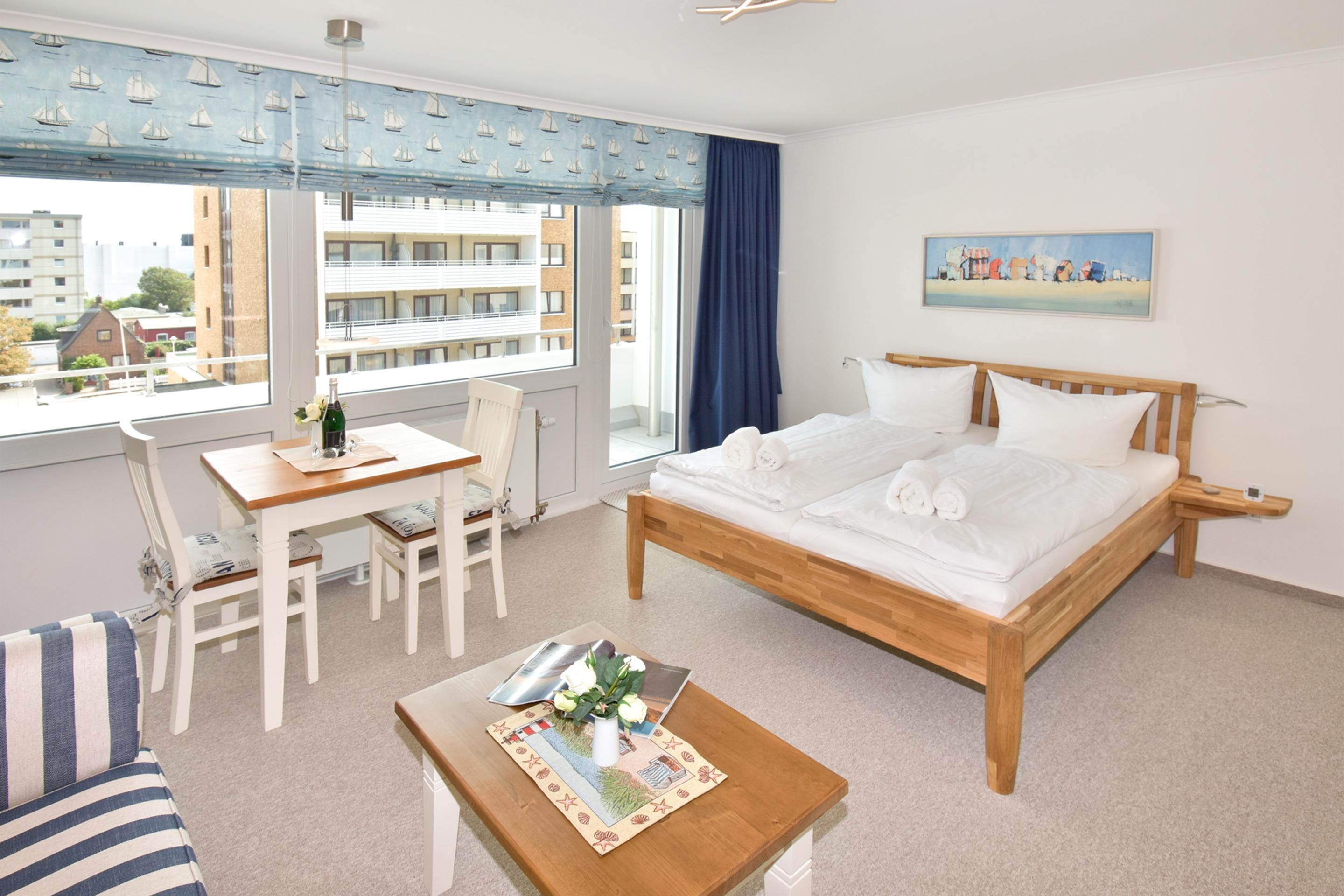 Moderne neu ausgestattete City-Ferienwohnung in unmittelbarer Nähe zum Strand (Sylter Welle) Großzügige 1-Zimmer-Nichtraucher-Ferienwohnung (38qm) in der dritten Etage zur Landseite mit Ostloggia(Vormittagssonne) und Balkonmöbeln für 2 Personen