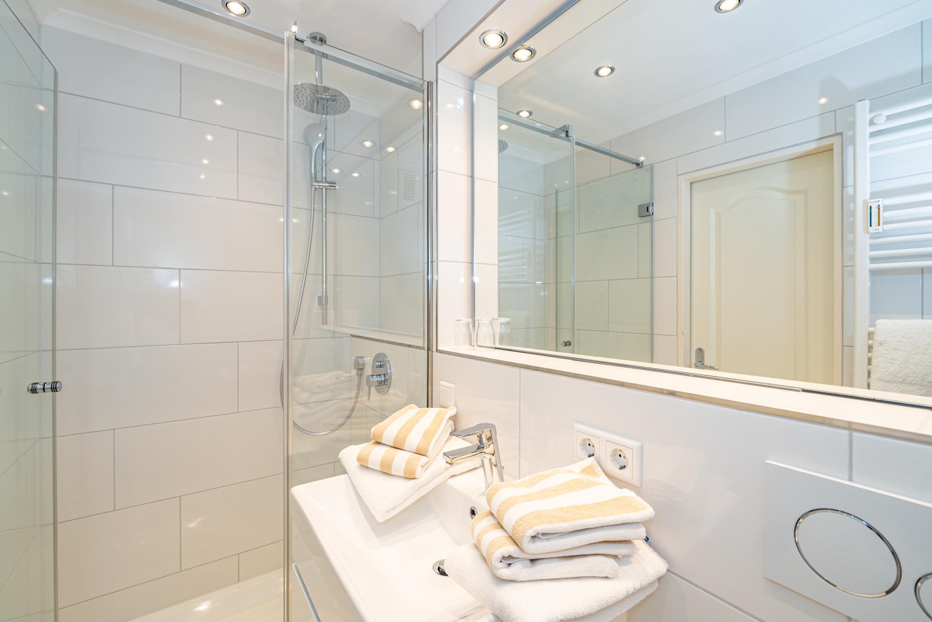 Im Bad befinden sich eine Dusche, ein WC und ein Waschtisch.