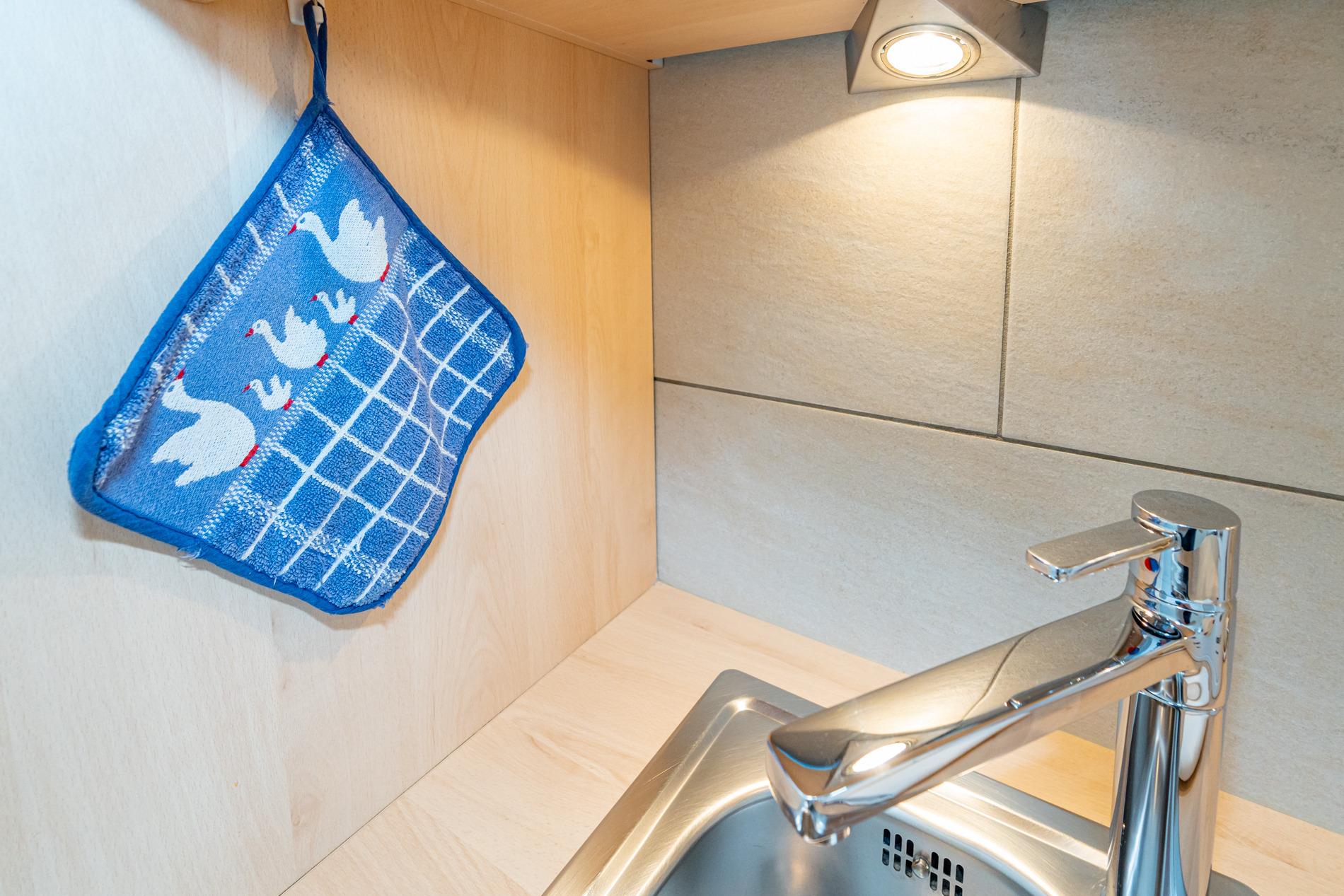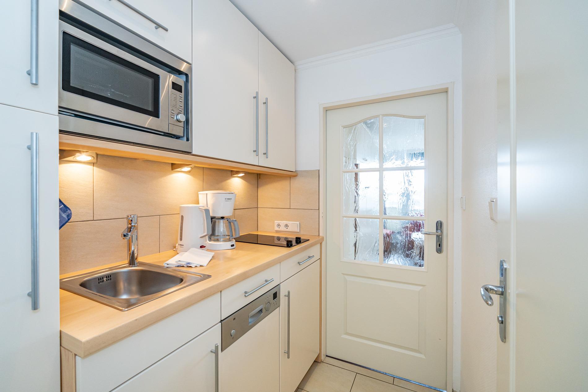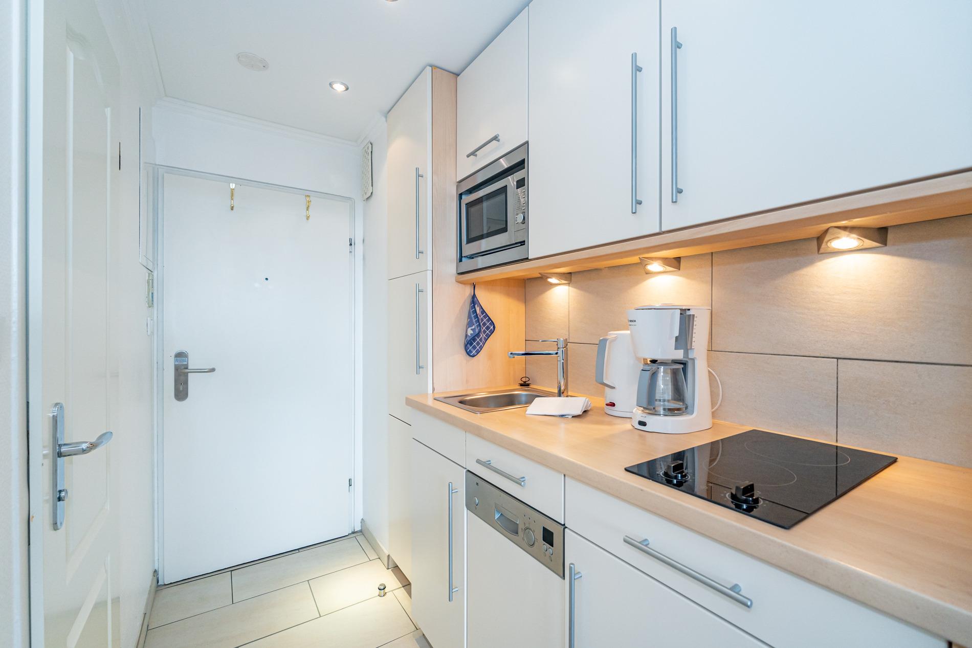 Die Küchenzeile hat einen Geschirrspüler, eine Mikrowelle mit Grillfunktion, 2-Platten-Ceranfeld, Kühlschrank mit 3* Gefrierfach. Kaffeemaschine, Wasserkocher und Toaster gehören zur Grundausstattung.