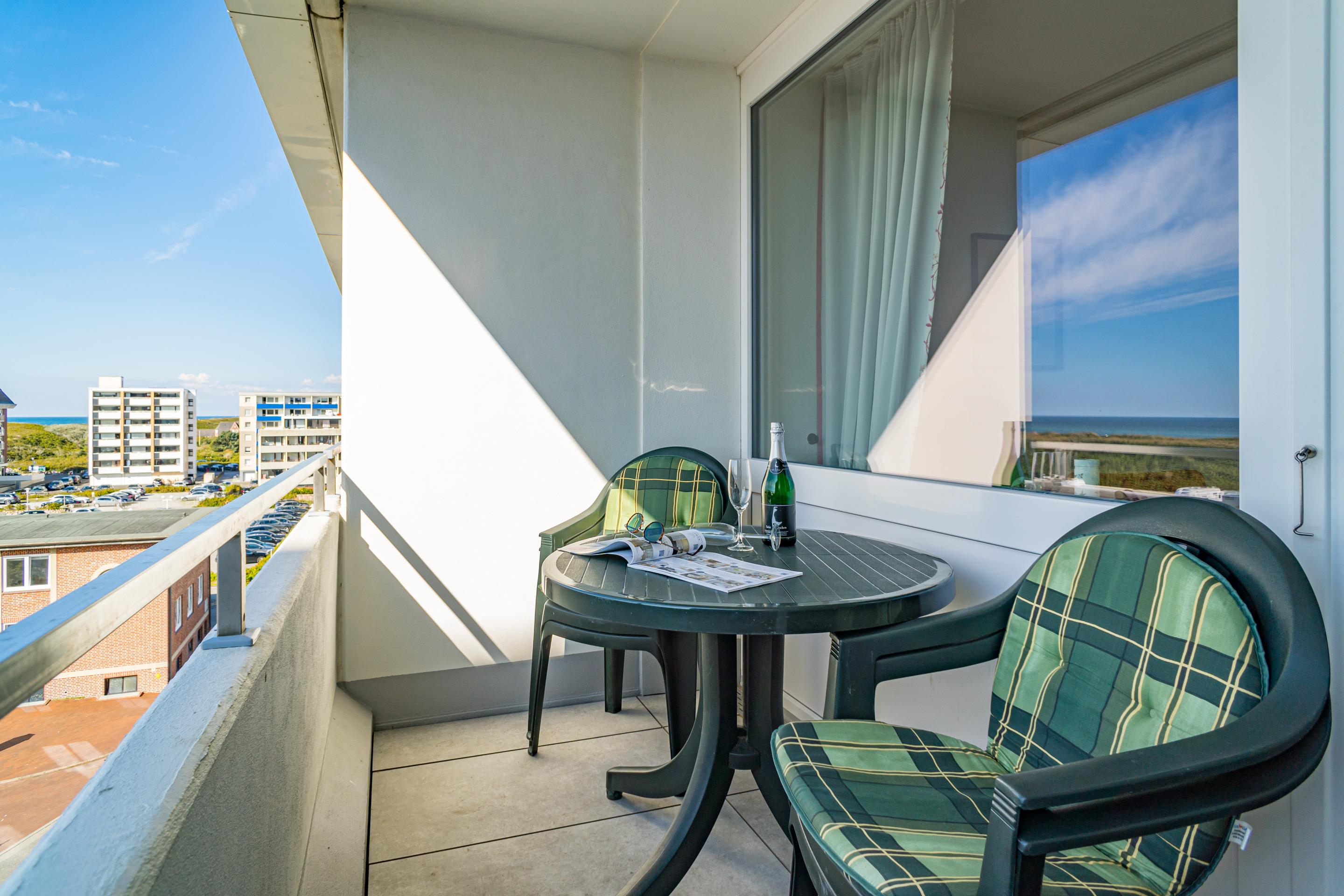 1-Zimmer-Nichtraucher-Ferienwohnung (ca. 25 qm) in der 4. Etage zur Seeseite mit Westloggia und Meerblick (Abendsonne, mit Balkonmöbeln und Auflagen) für max. 2 Personen.
