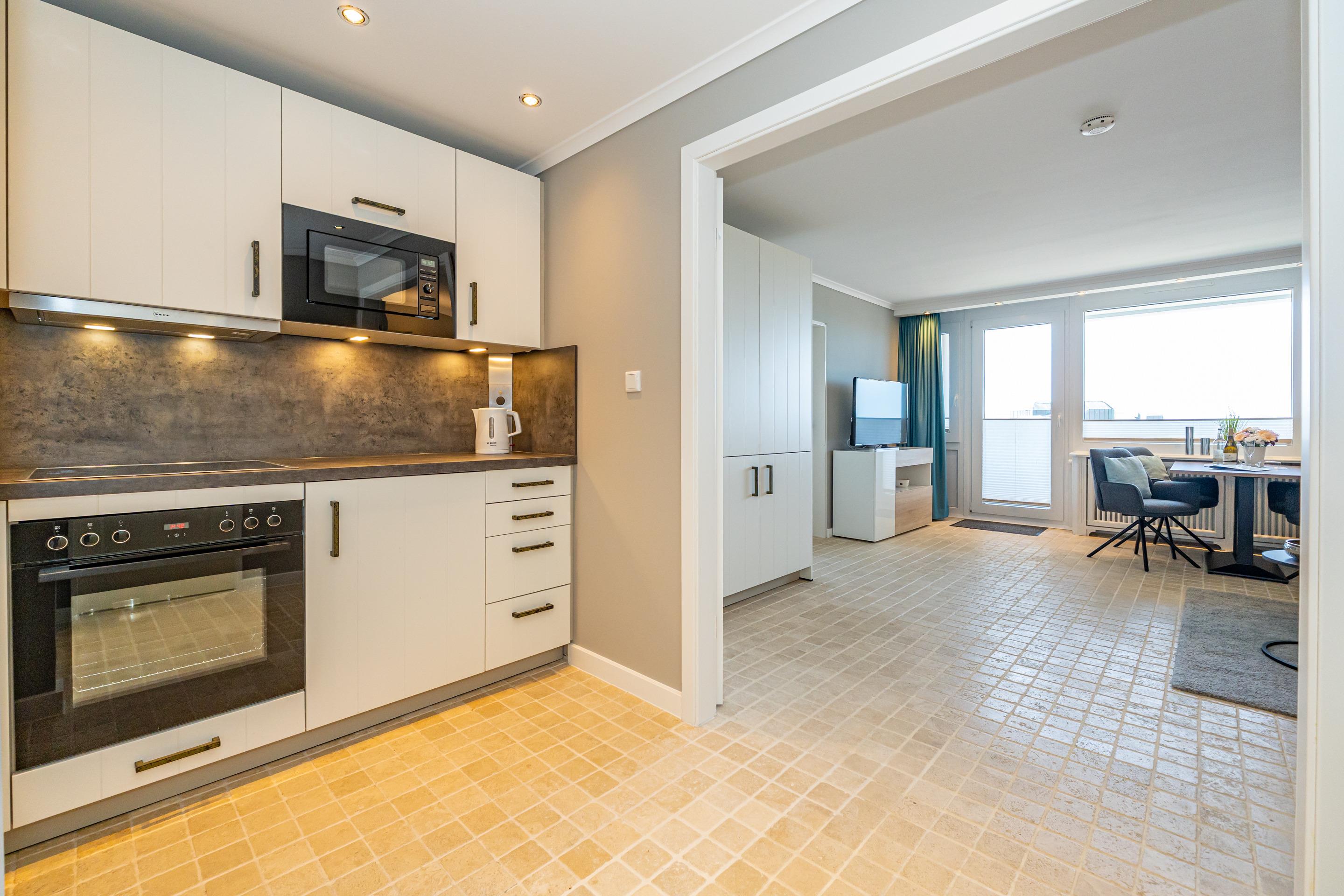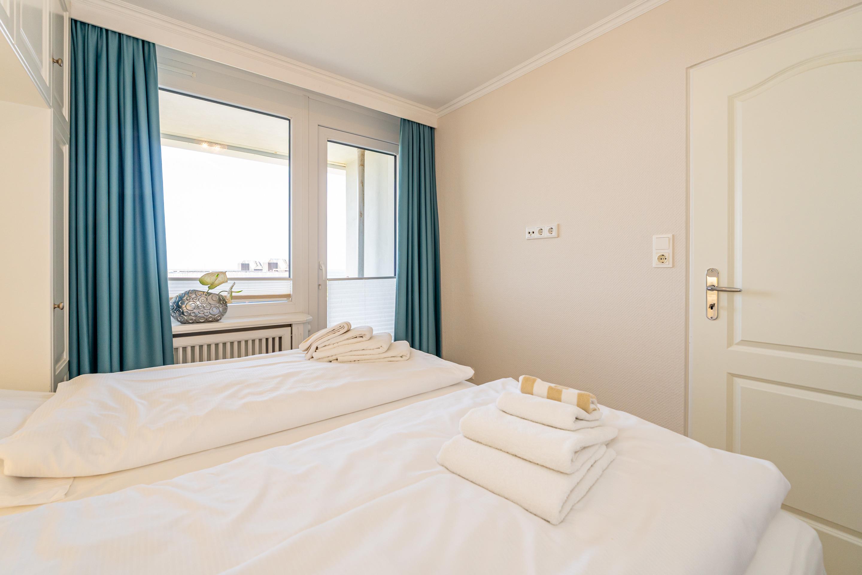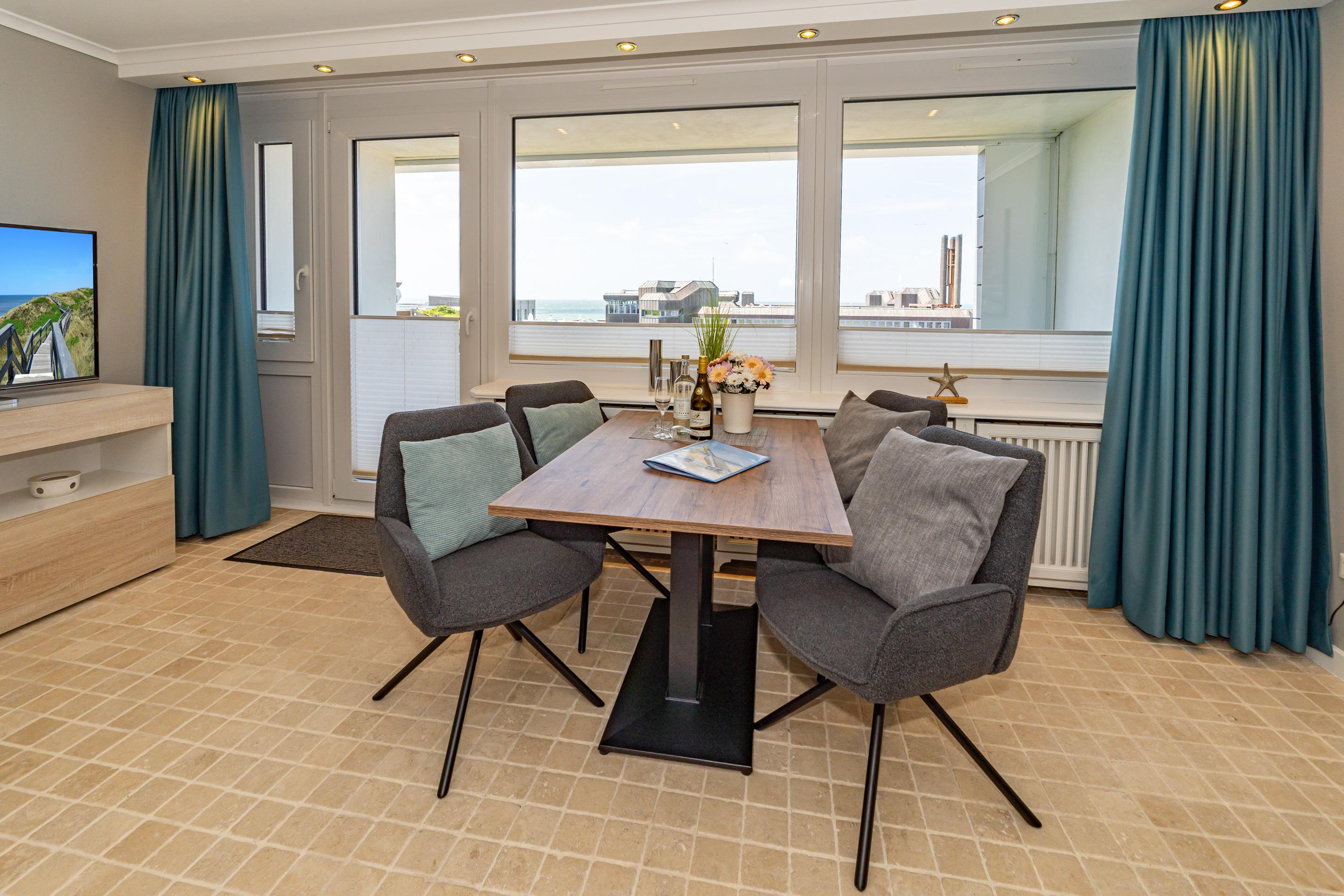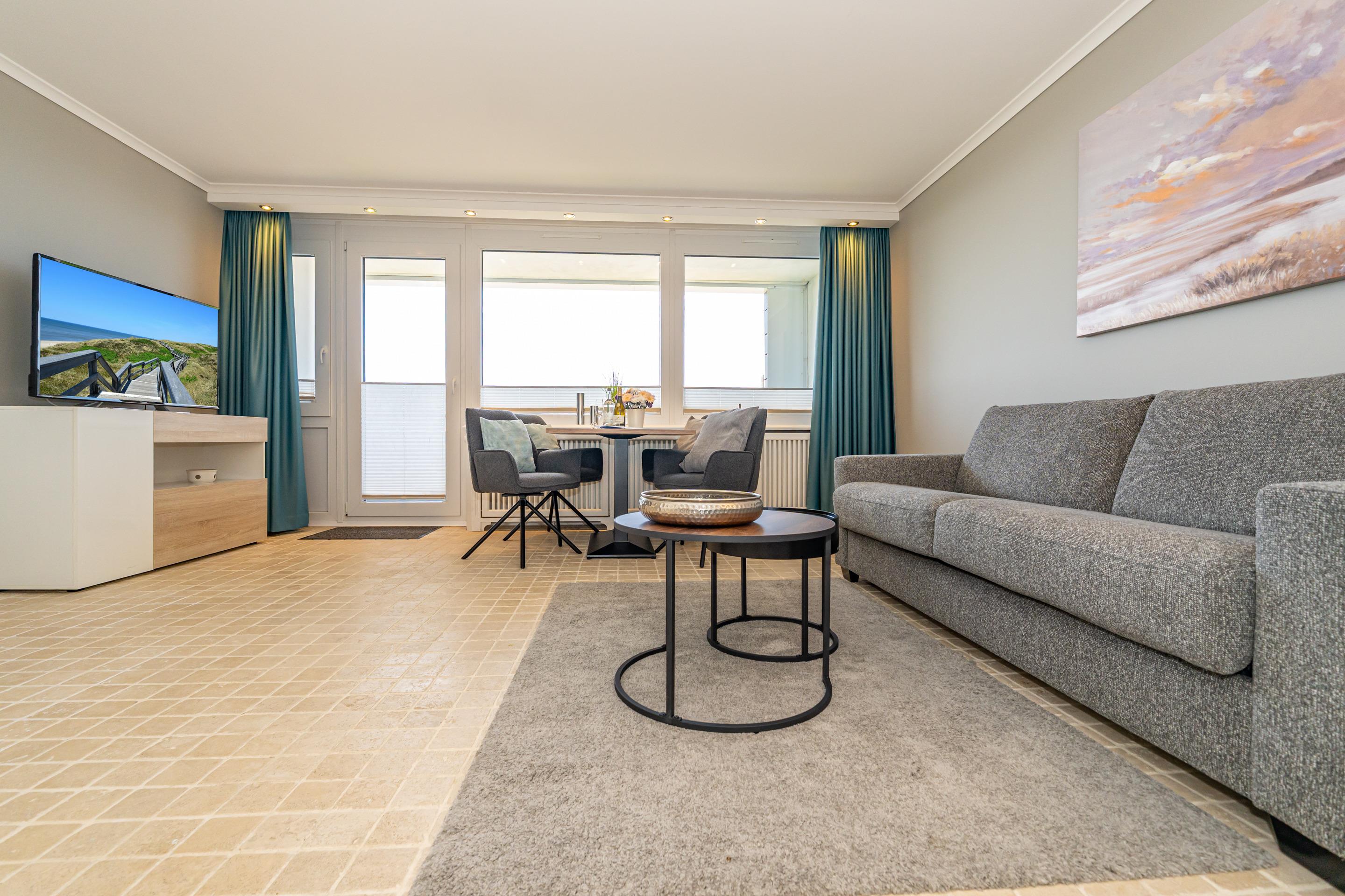 2025 renovierte, stilvolle 2-Zimmer-Nichtraucher-Ferienwohnung mit schönem Meerblick (ca. 51 qm) in der 4. Etage zur Seeseite mit 2 Westloggien (Nachmittagssonne, mit Balkonmöbeln und Auflagen) für max. 4 Personen.