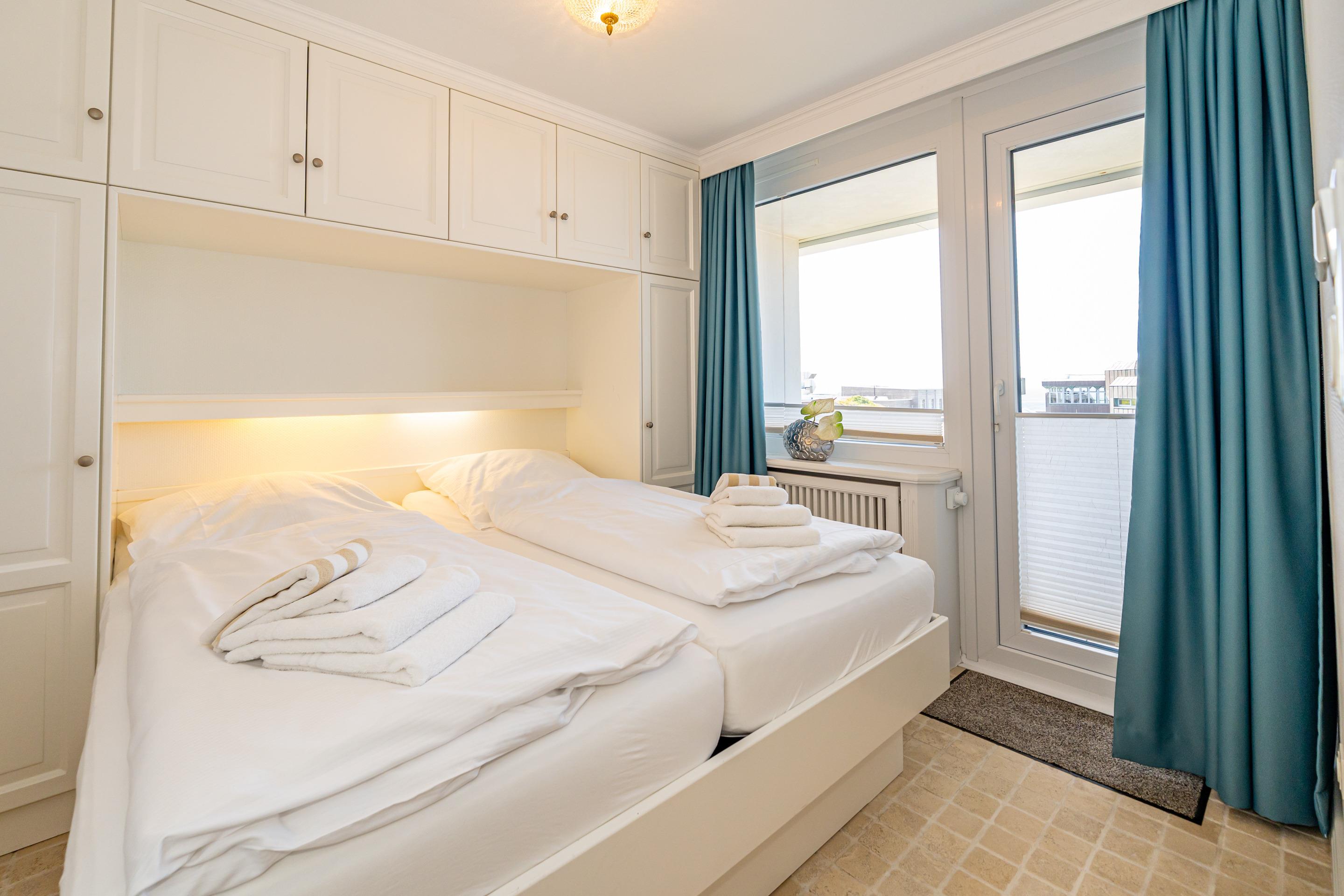 Das Schlafzimmer mit Austritt zur zweiten Loggia hat ein Doppelbett in Komforthöhe (ca. 60 cm, mit verstellbarem Kopf- und Fußteil, mit zwei Einzelmatratzen je 0,90 x 2,00 m).