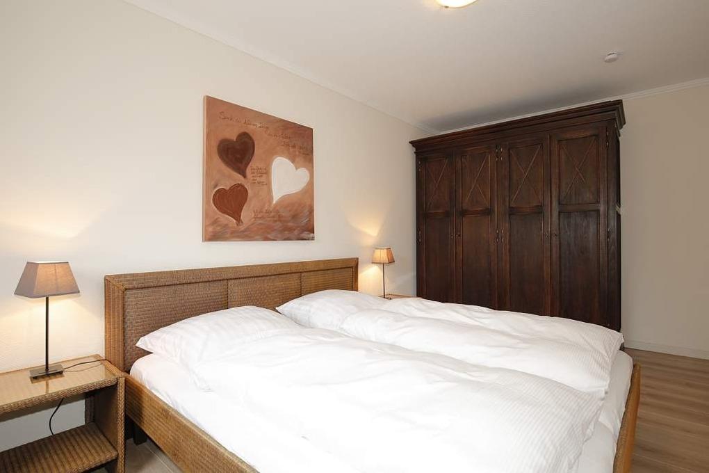 Das große Schlafzimmer ist mit einem Doppelbett (mit Einzelmatratzen) und das kleine Schlafzimmer mit zwei über Eck stehenden Einzelbetten ausgestattet.