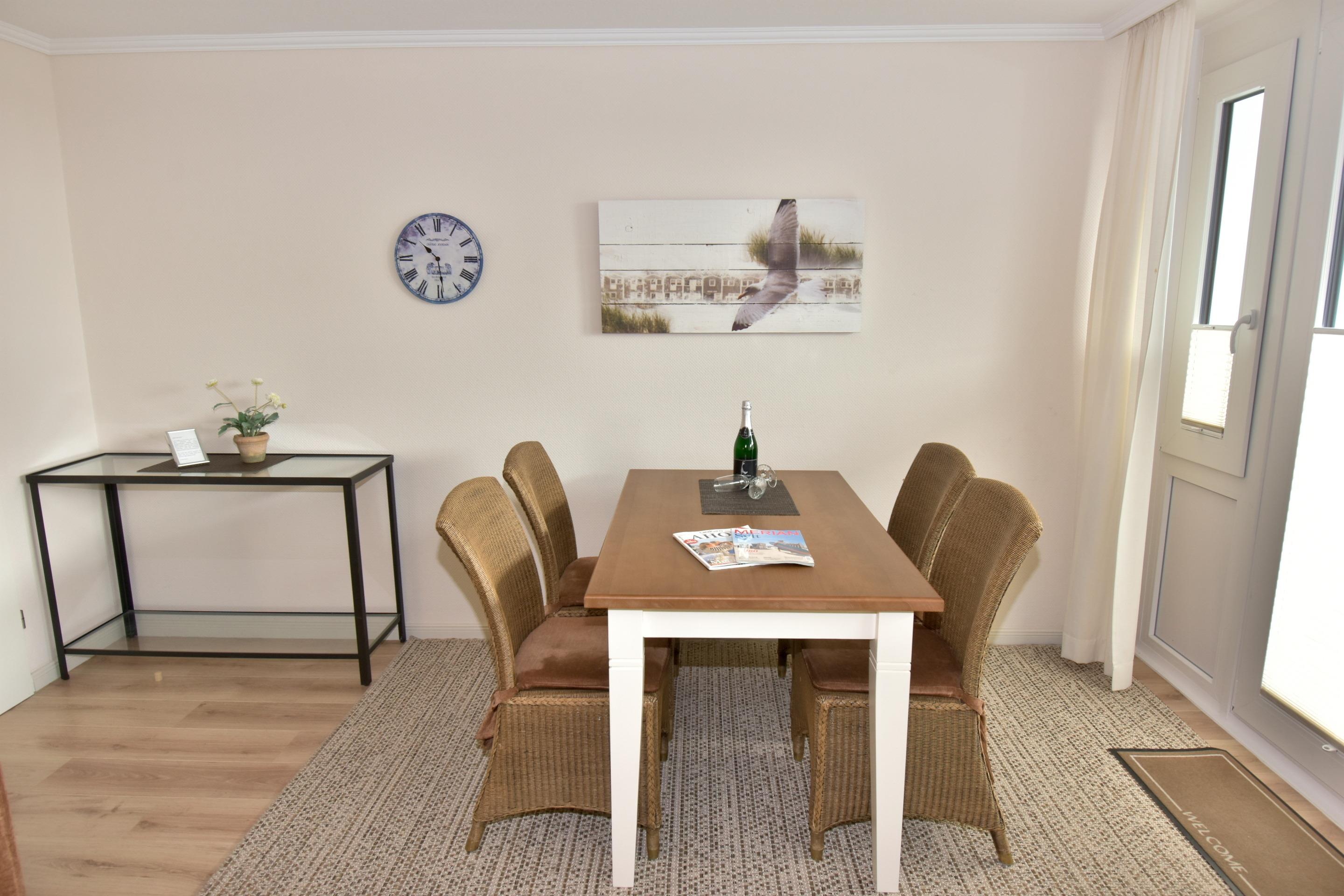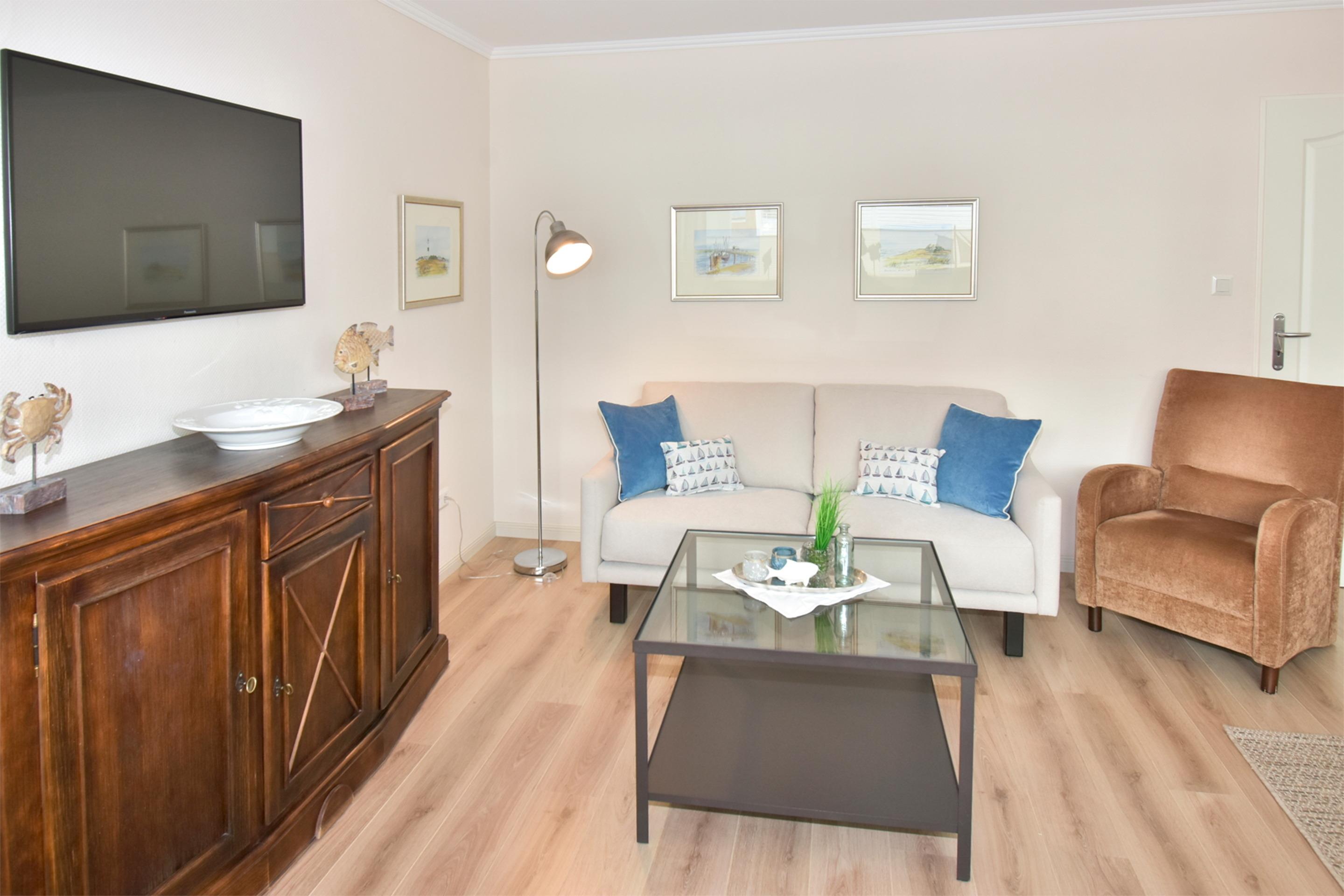 Der Wohnraum besteht aus einer bequemen Sitzgarnitur (Zweisitzer mit Sessel und Fußhocker), einem Essplatz, großer Flachbild-TV, DVD-Player, HiFi-Anlage und Telefon.
