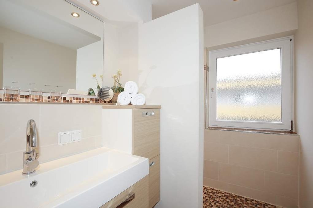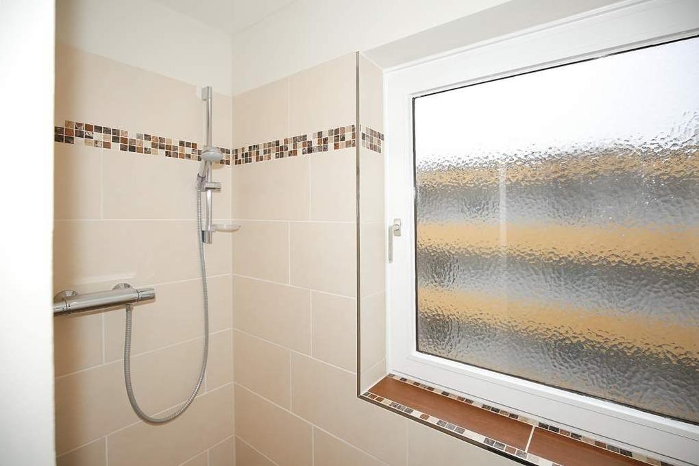 Im neuen großzügigen Bad befinden sich eine große, sehr flache Dusche, ein WC, ein Waschtisch, ein Handtuchtrockner und ein Fön.