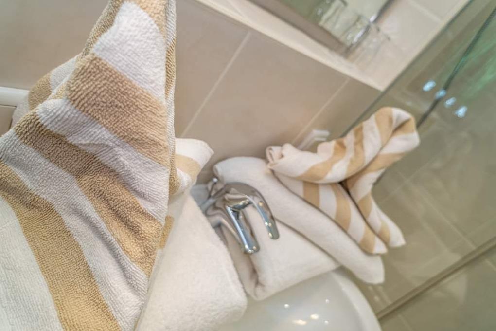 Im neuen Bad befinden sich eine Dusche, ein WC, ein Waschtisch und ein Handtuchtrockner.
