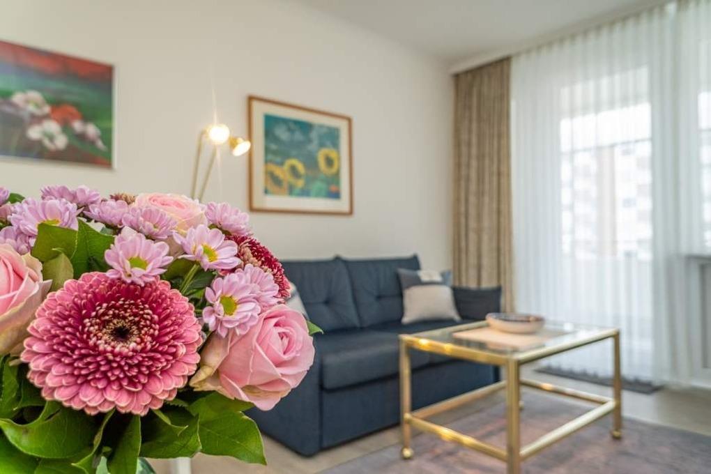1-Zimmer-Nichtraucher-Ferienwohnung (ca. 28 m²) in der 4. Etage zur Landseite mit Ostloggia (Morgensonne, mit Balkonmöbeln und Auflagen) für max. 2 Personen.