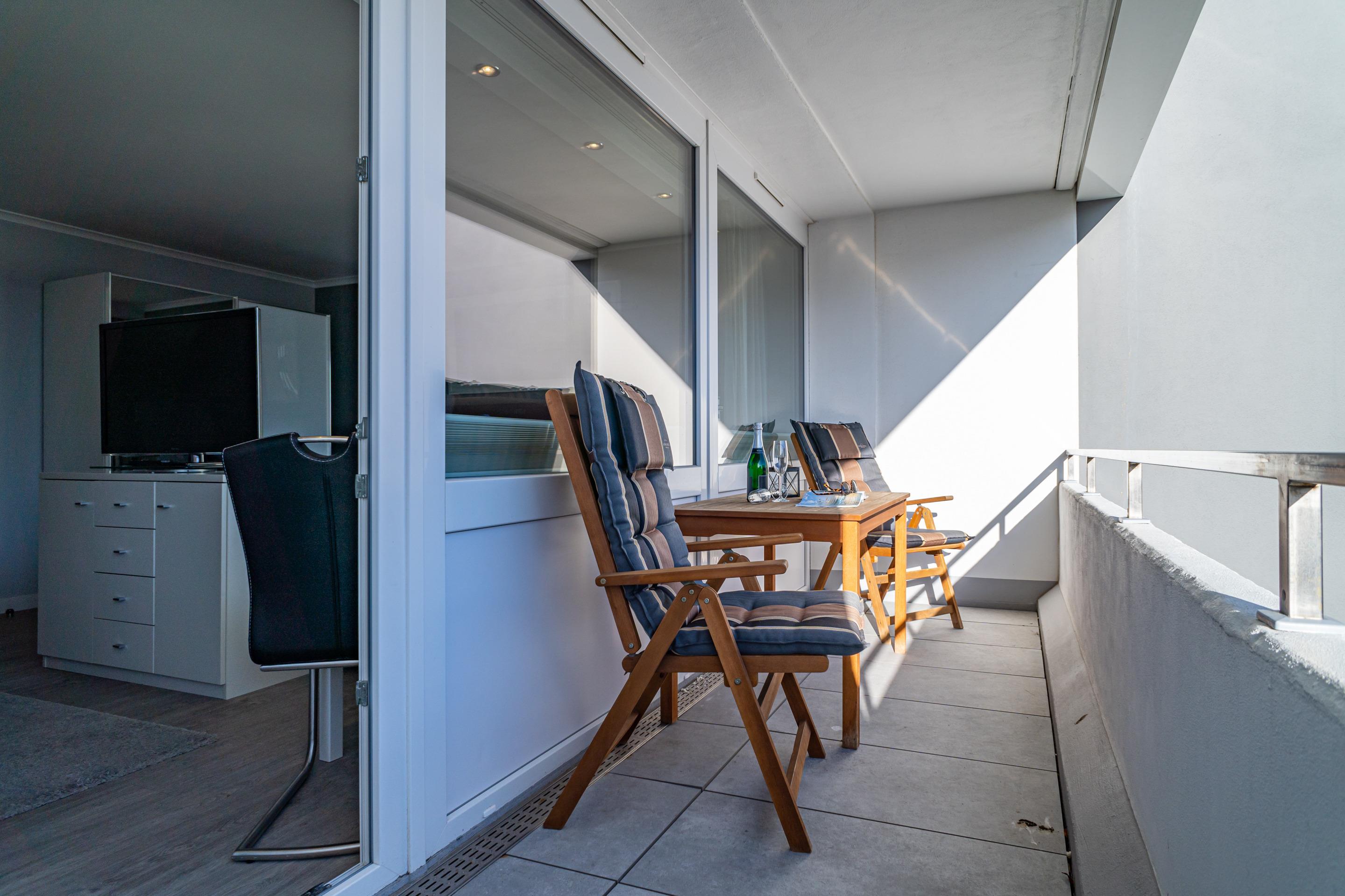 Großzügige 1-Zimmer-Nichtraucher-Ferienwohnung (ca. 38 m²) in der 4. Etage zur Landseite mit Ostloggia (Morgensonne, mit Balkonmöbeln und Auflagen) für max. 2 Personen.