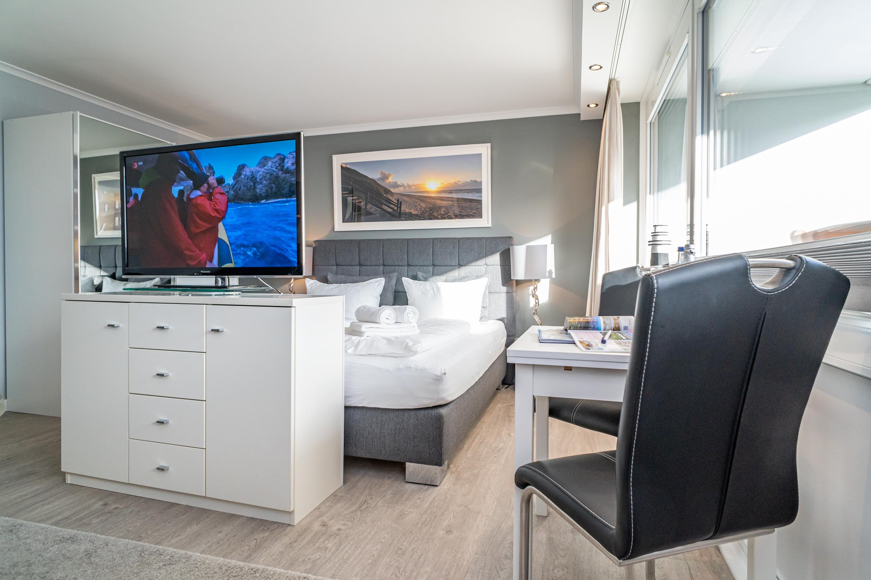 Der Wohn-/Schlafraum besteht aus einer Küchenzeile mit 4-Platten-Ceranfeld-Herd mit Backofen, Kühlschrank mit Gefrierfach und einem Geschirrspüler, Kaffeemaschine, Wasserkocher und Toaster gehören zur Grundausstattung, einer gemütlichen Sitzgarnitur, einem Essplatz, einem Doppelbett ( 180 x 200 cm), Kabel-Flachbild-TV.