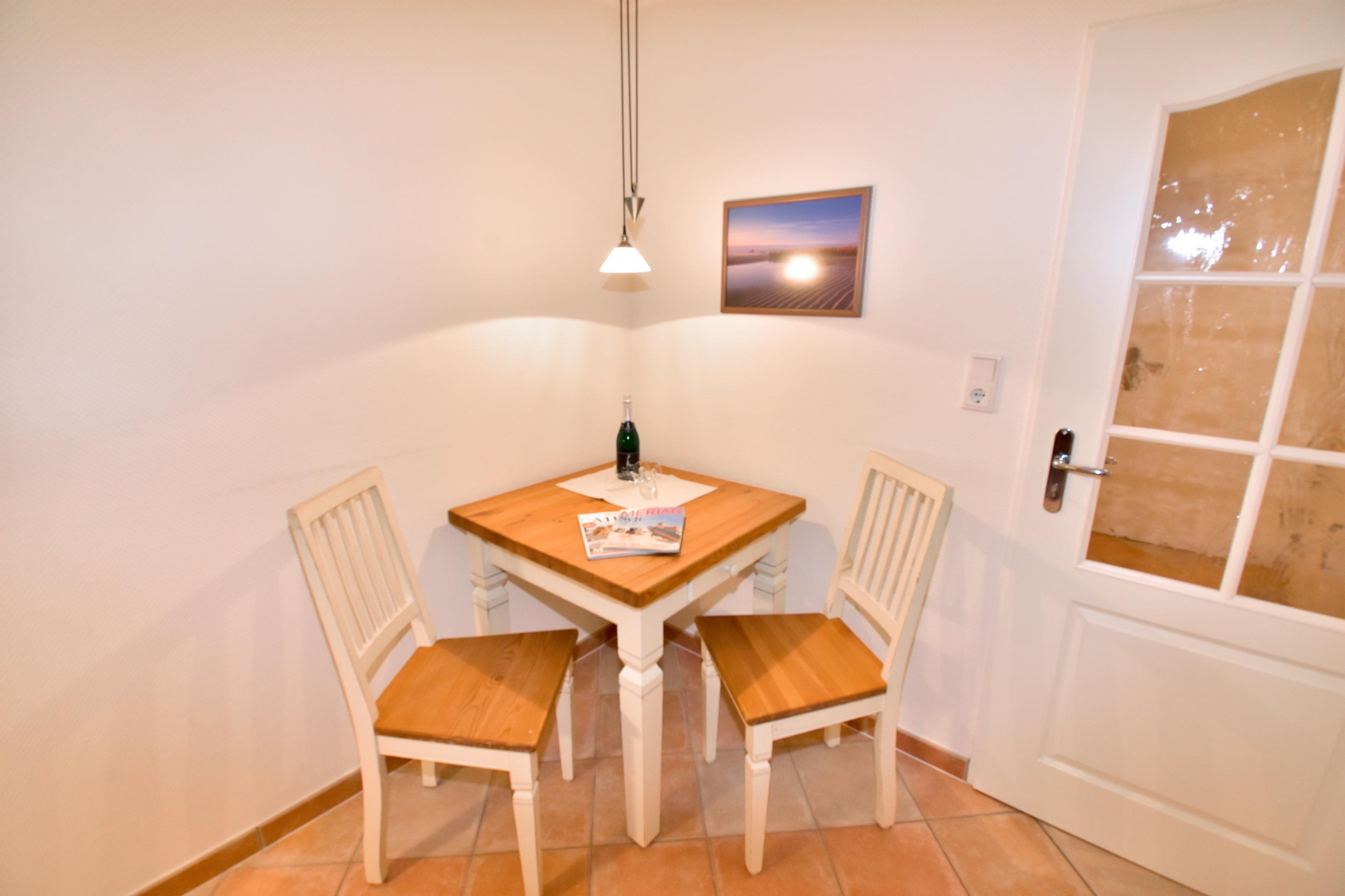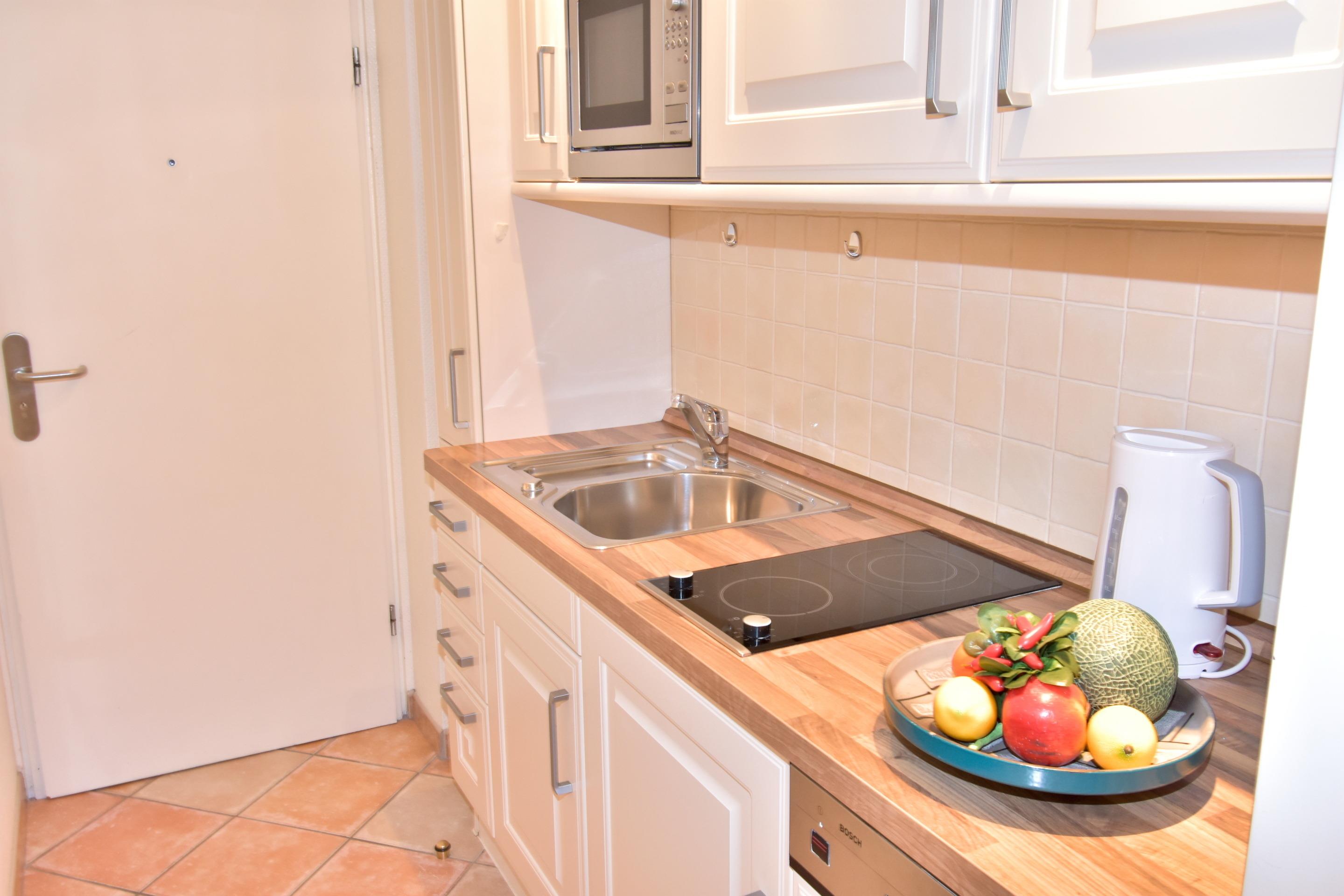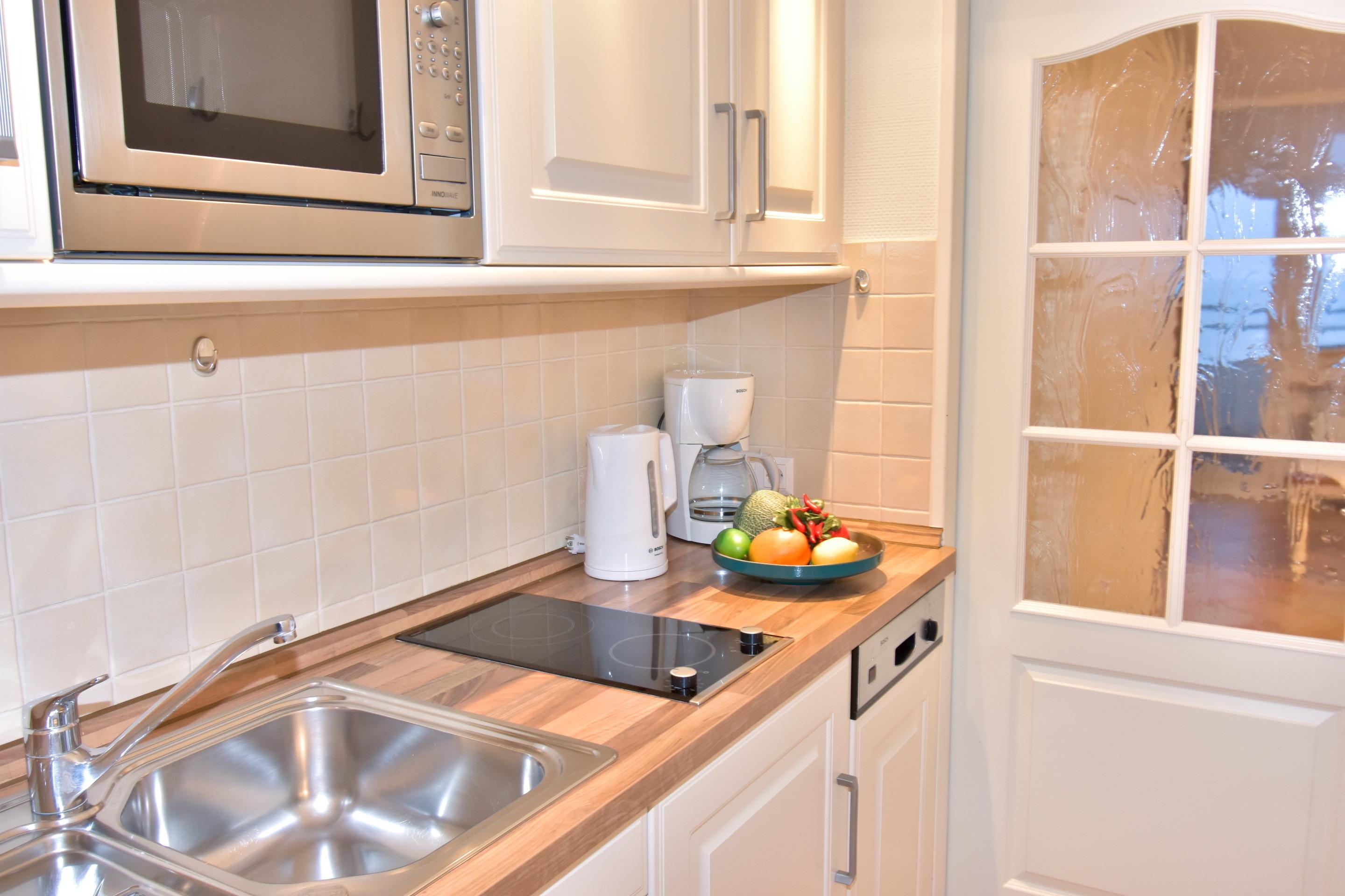 Die Küchenzeile hat einen Geschirrspüler, ein Cerankochfeld, eine Mikrowelle und einen Kühlschrank mit 3*-Gefrierfach. Kaffeemaschine, Wasserkocher und Toaster gehören zur Grundausstattung.