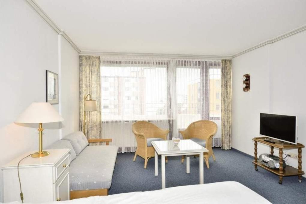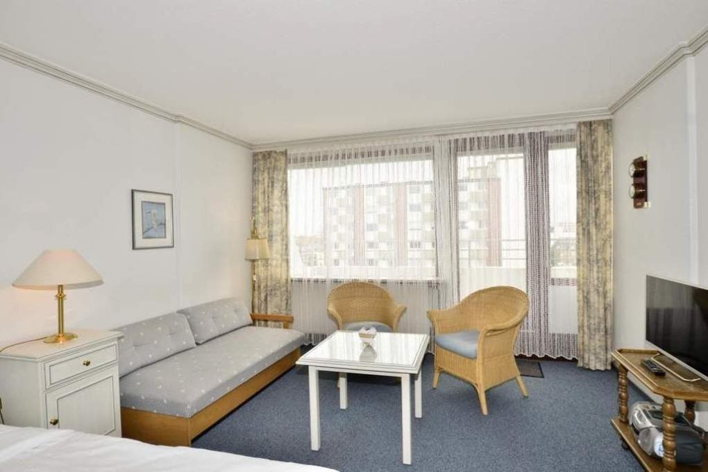 Großzügige 1-Zimmer-Nichtraucher-Ferienwohnung (ca. 43 qm) in der 5. Etage zur Landseite mit Ostdachterrasse (Morgensonne, mit Strandkorb) für max. 2 Personen.