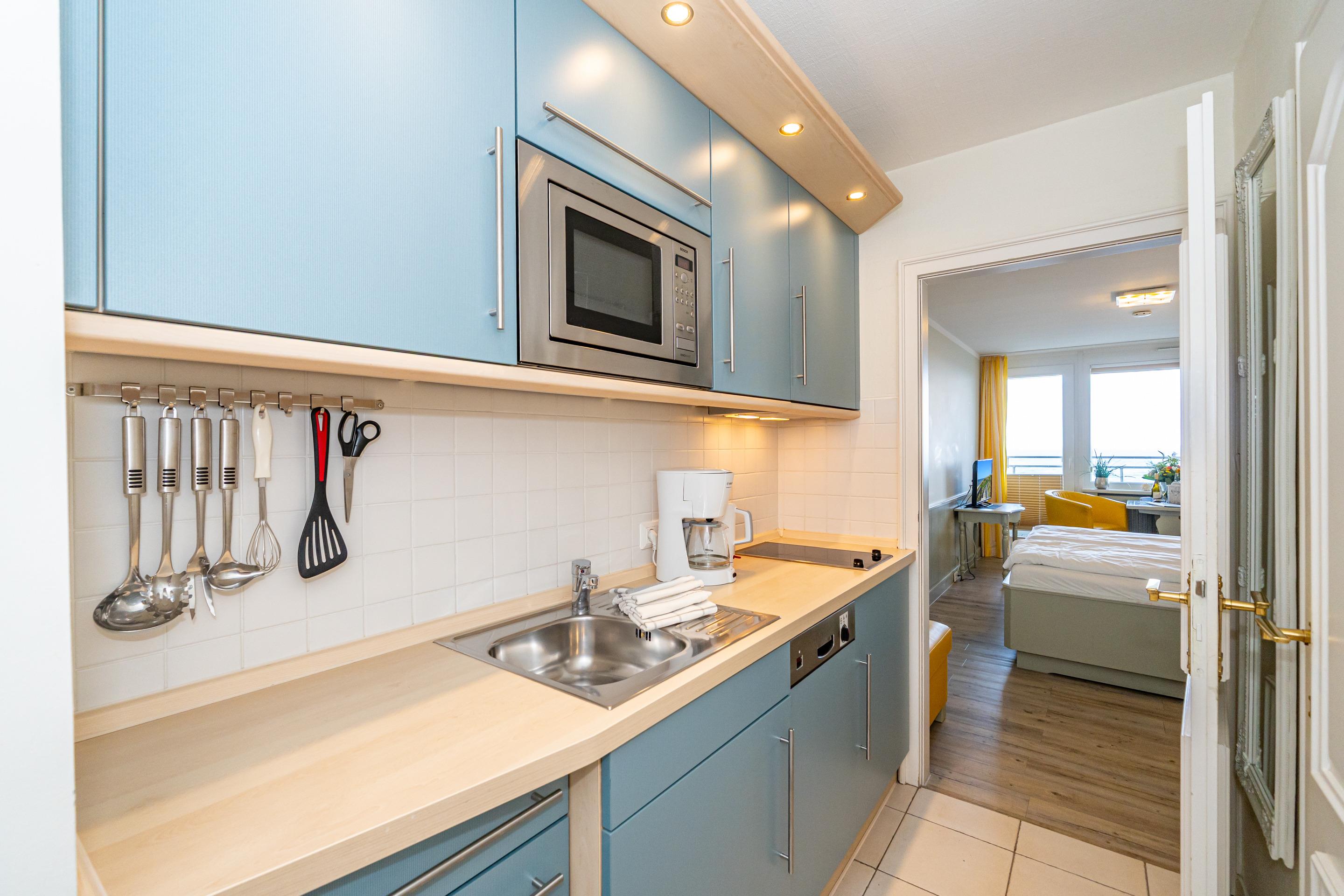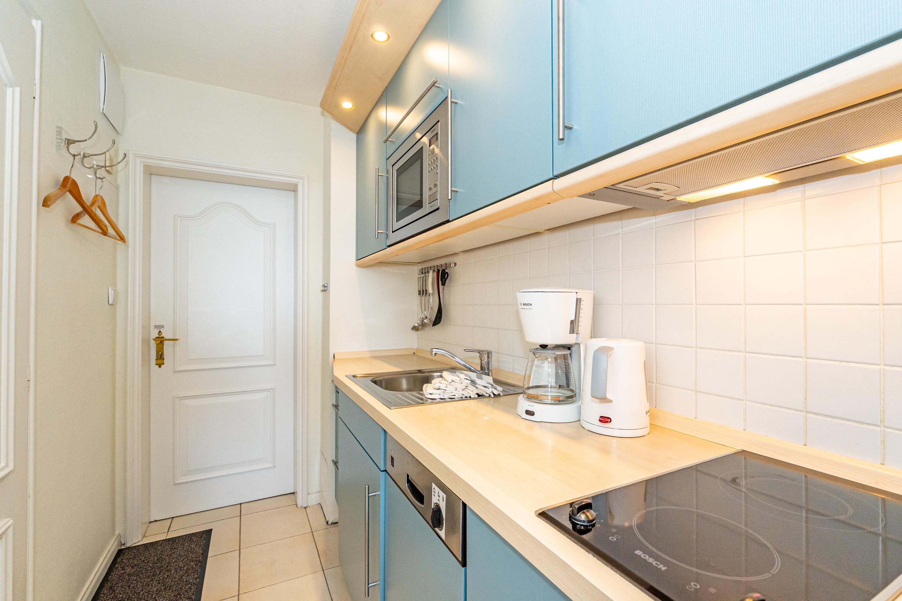 Die moderne Küchenzeile hat einen Geschirrspüler, eine Nespresso-Maschine, ein Cerankochfeld, eine Mikrowelle mit Grillfunktion und einen Kühlschrank mit 3*-Gefrierfach. Kaffeemaschine, Wasserkocher und Toaster gehören zur Grundausstattung.