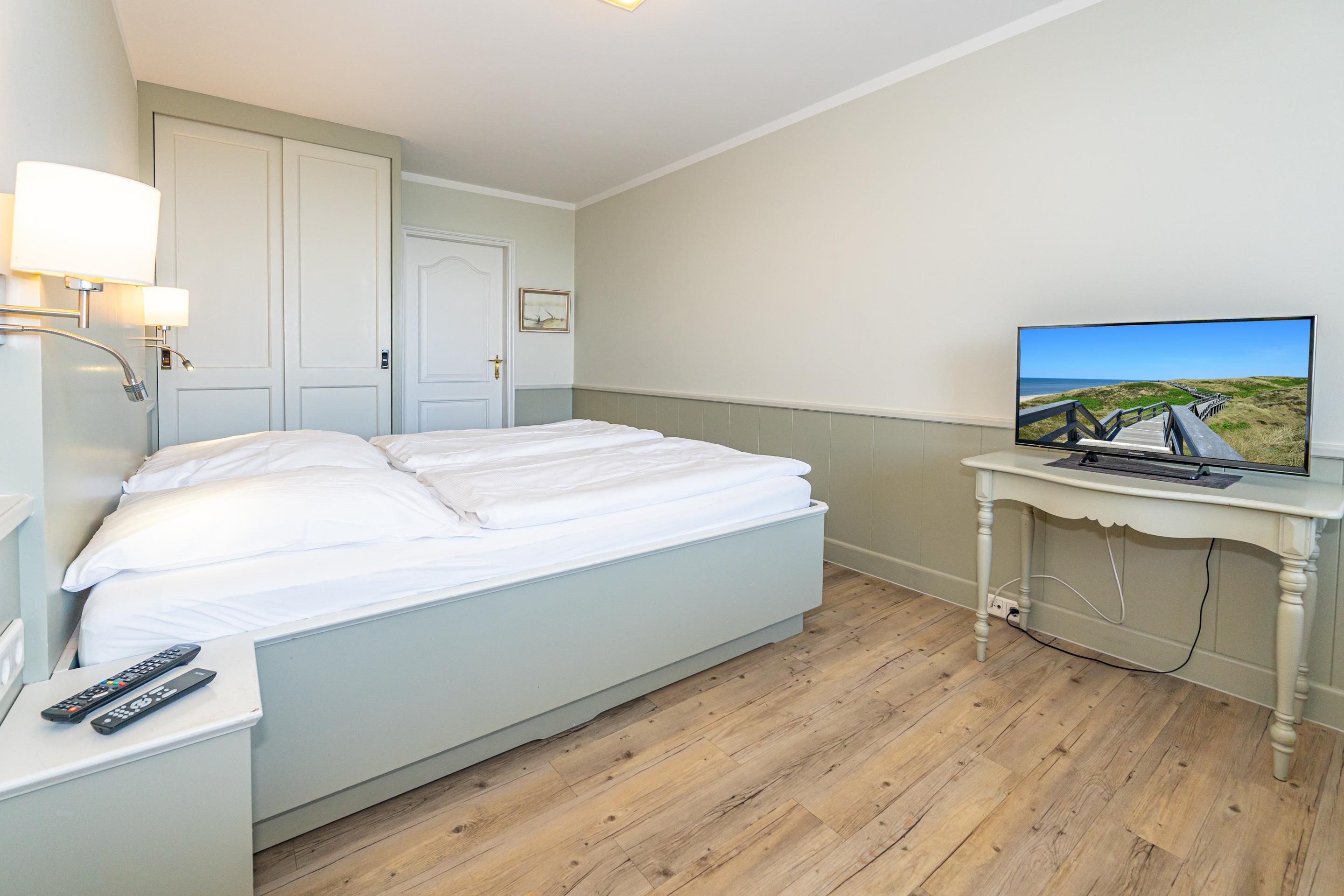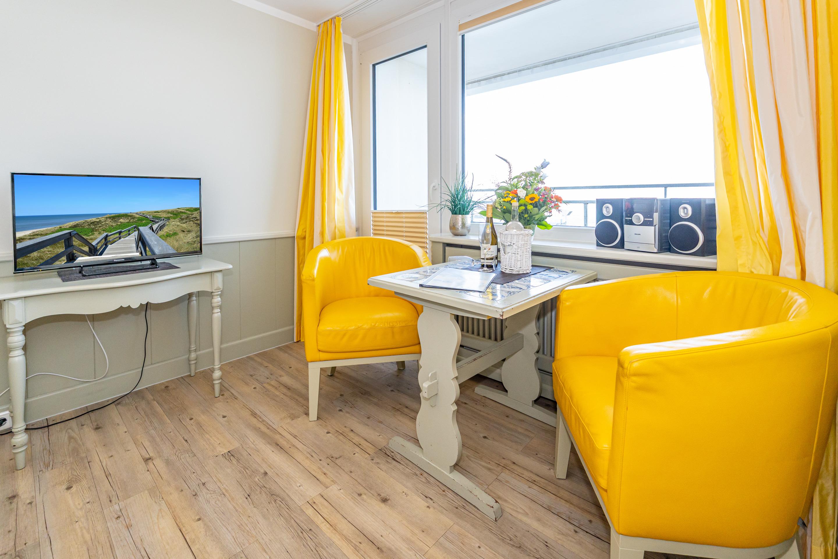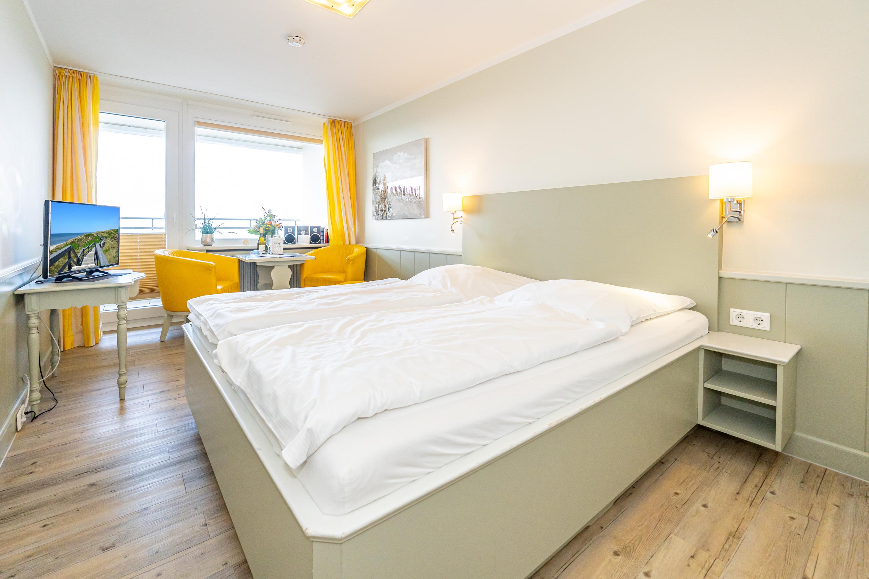 Der Wohn-/Schlafraum besteht aus einem feststehendem Doppelbett, zwei Sesseln, Flachbild-TV, Radio-CD.