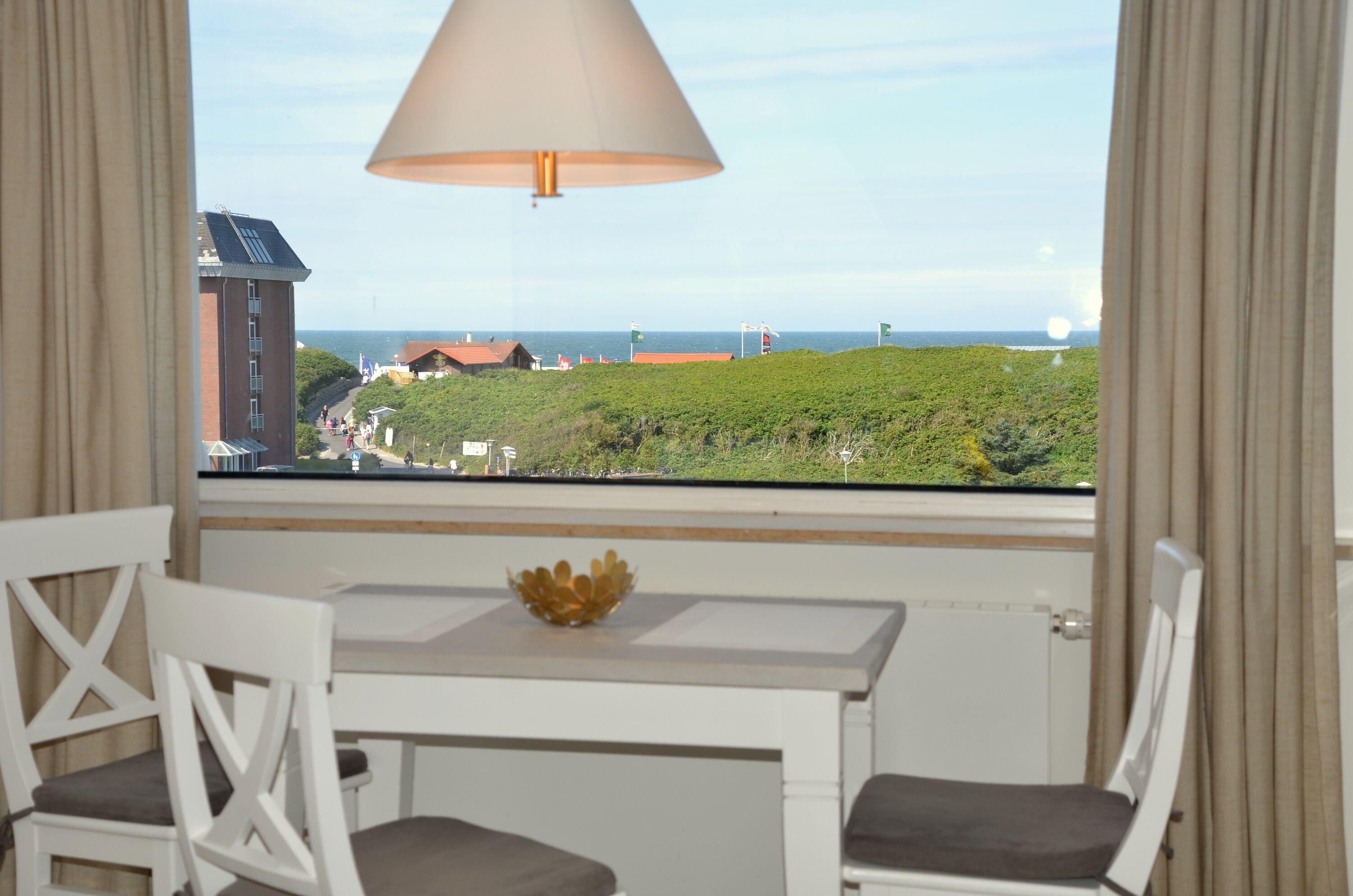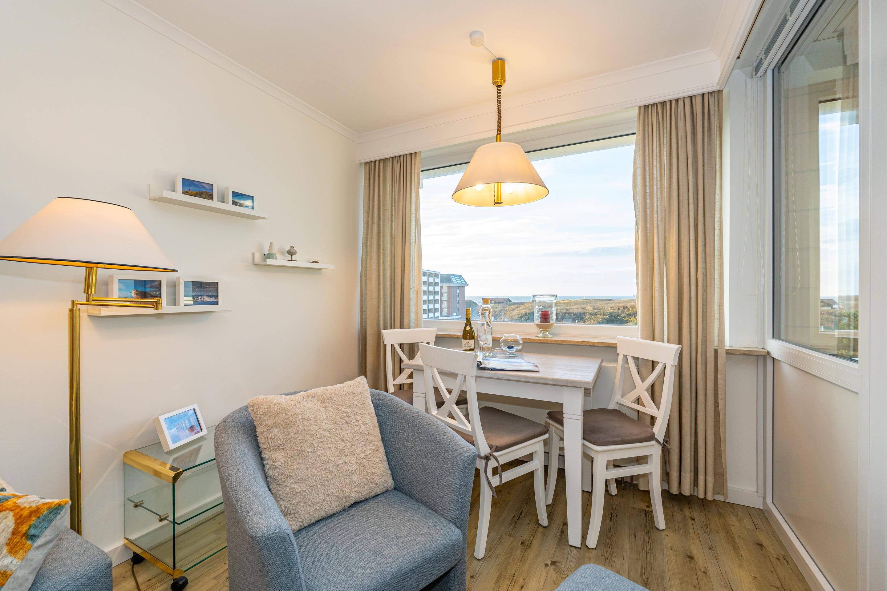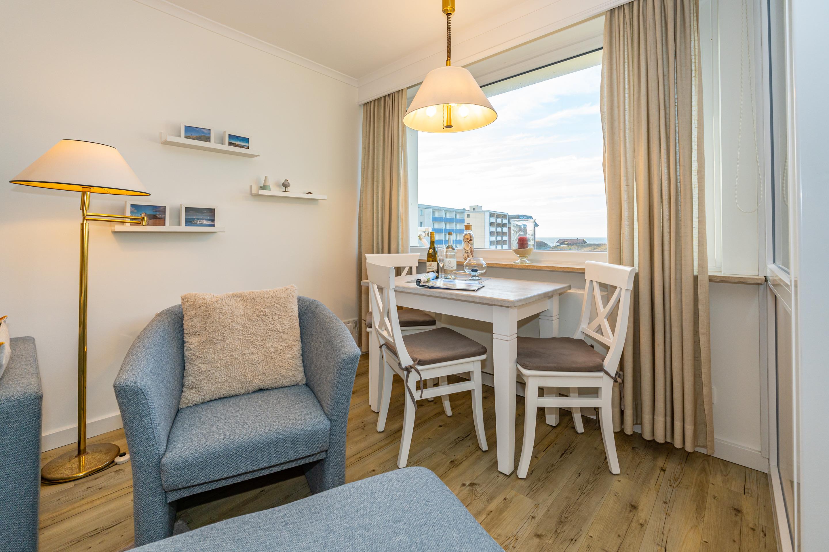 Der Wohnraum ist mit einem Essplatz direkt am Fenster, einem Sofa mit Sessel, einem Einzelschrankbett, großem Smart-TV (110 cm Bildschirmdiagonale), DVD-Player und W-Lan-Zugang ausgestattet. Von hier hat man einen herrlichen Blick auf das Meer und die vorgelagerte Dünenlandschaft vom Weststrand.